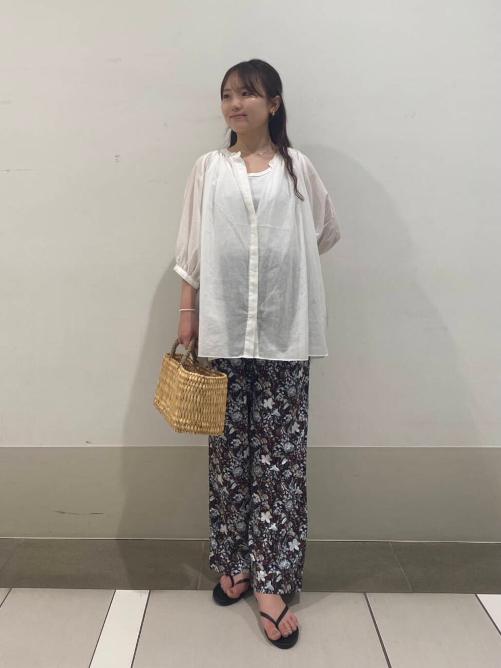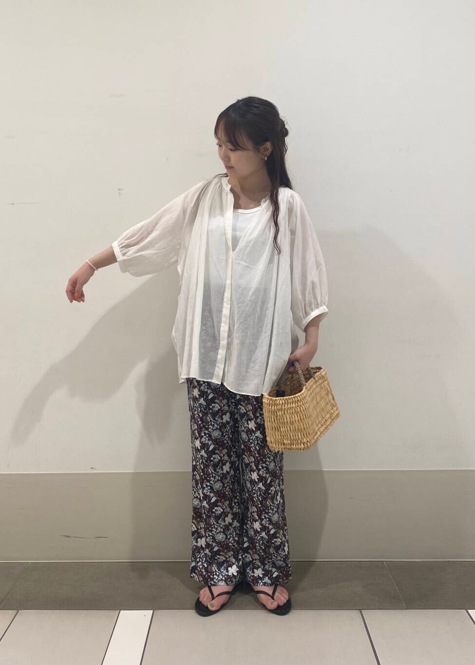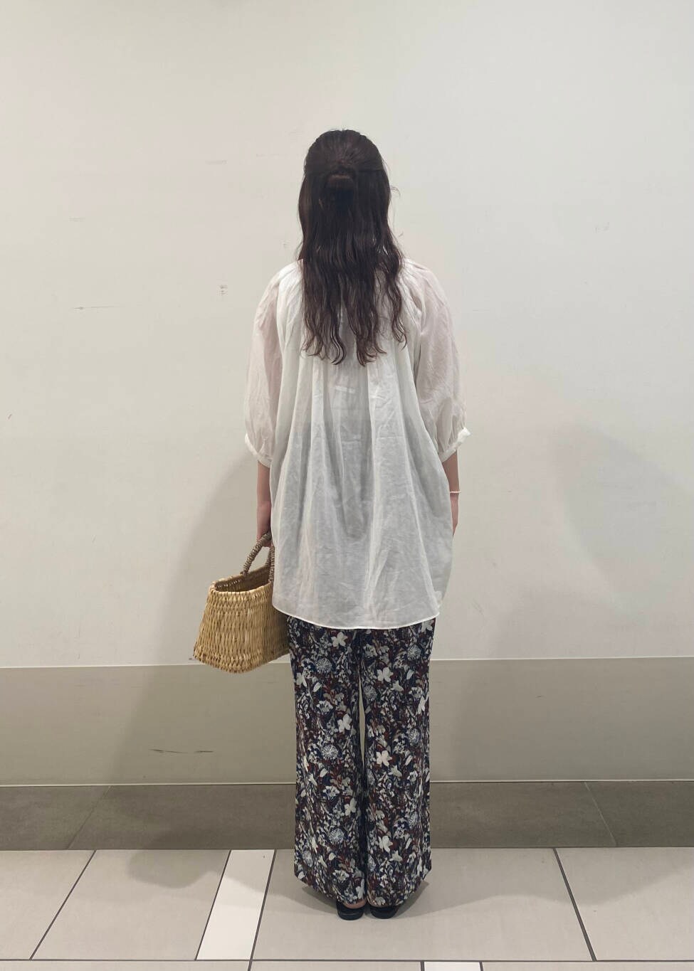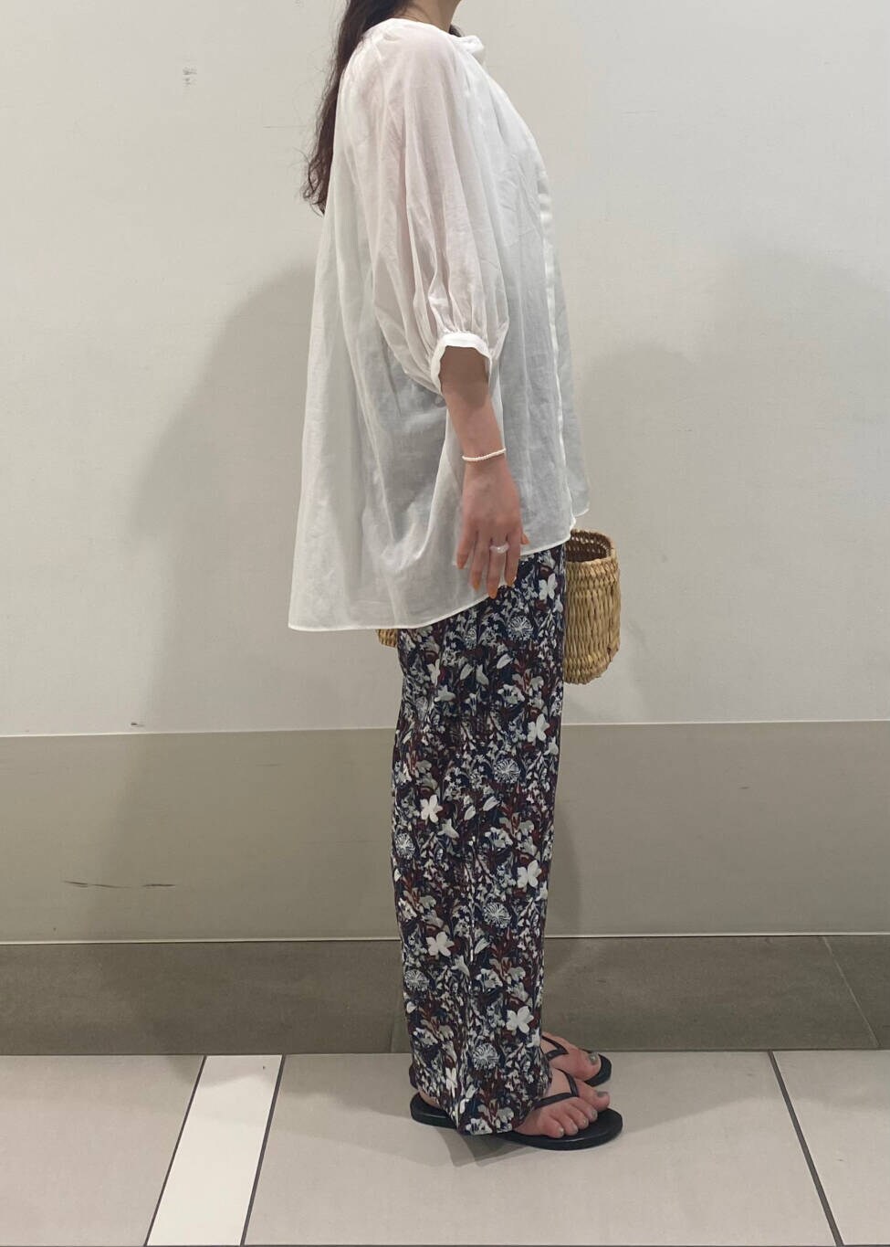 人気のフラワープリントイージーパンツを白のブラウスと合わせて、爽やかな雰囲気にしました✨