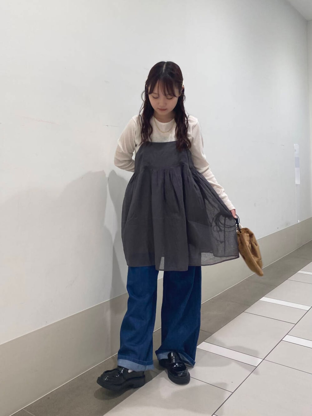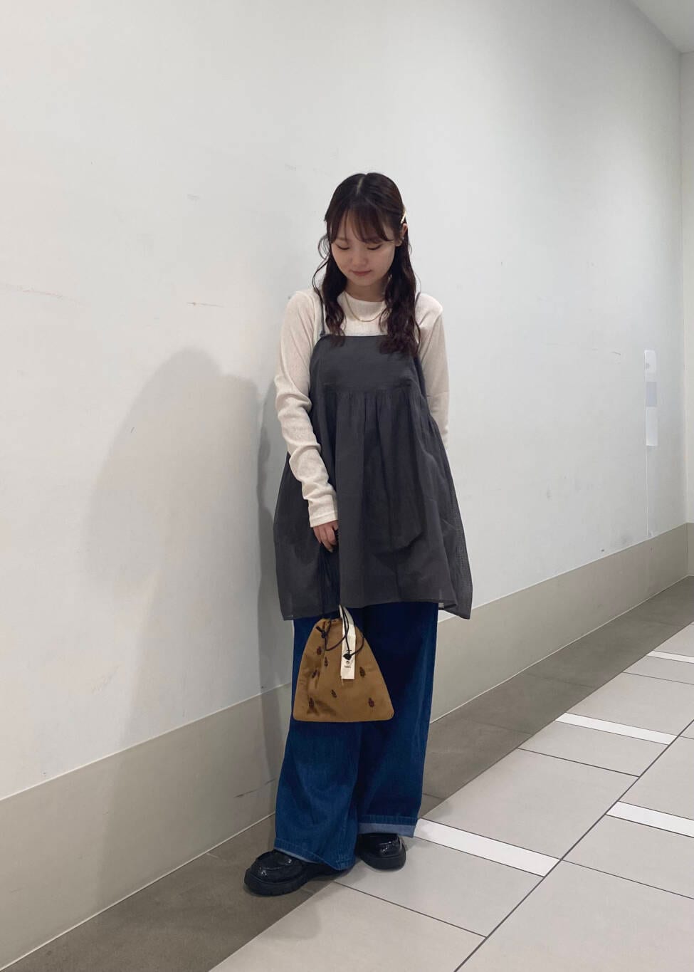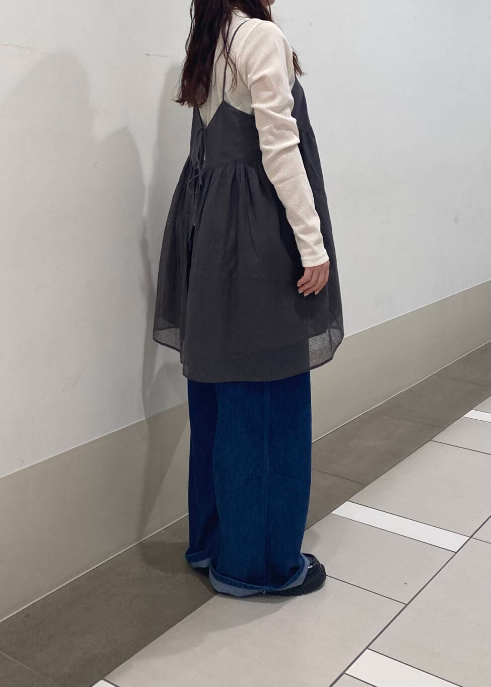 甘さがあるキャミブラウスですが、細めの肩紐とチャコールの落ち着いた色味で、甘くなりすぎない大人ガーリーなコーデになります🎀