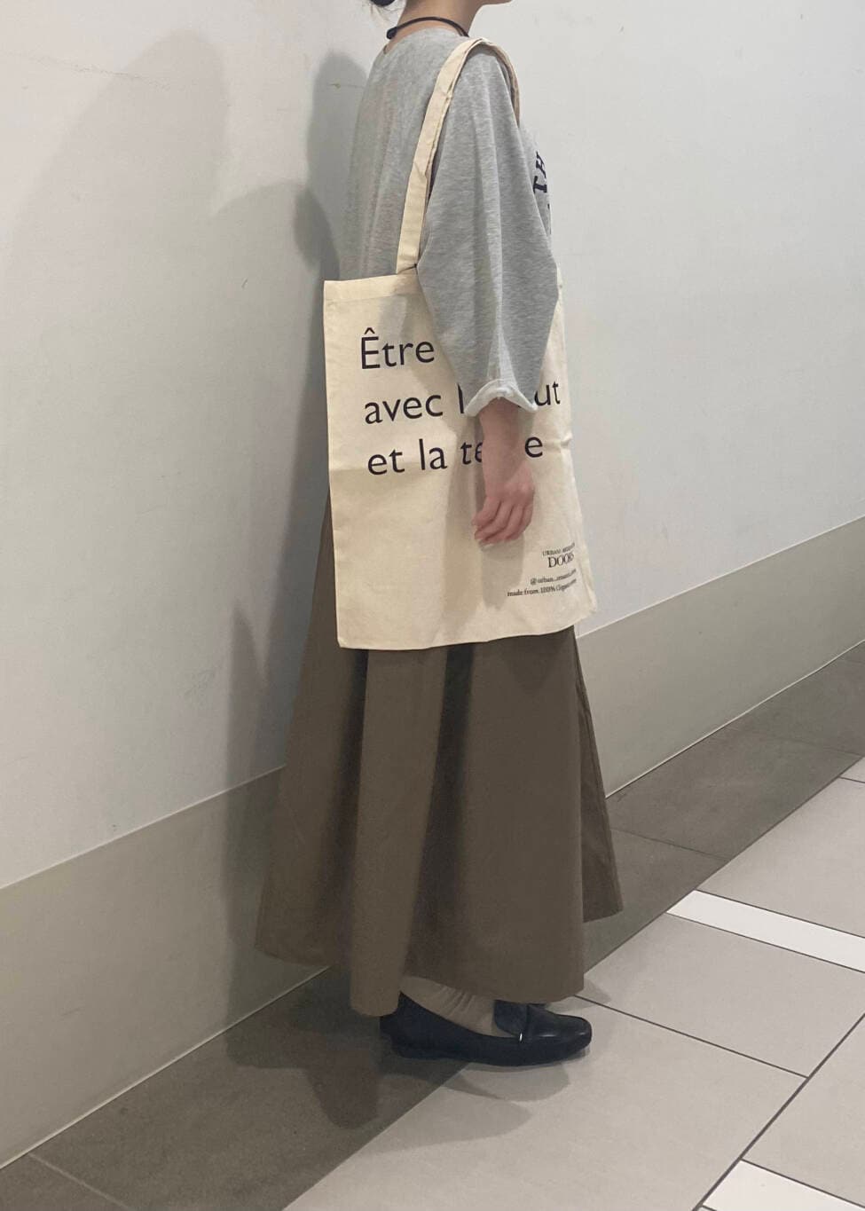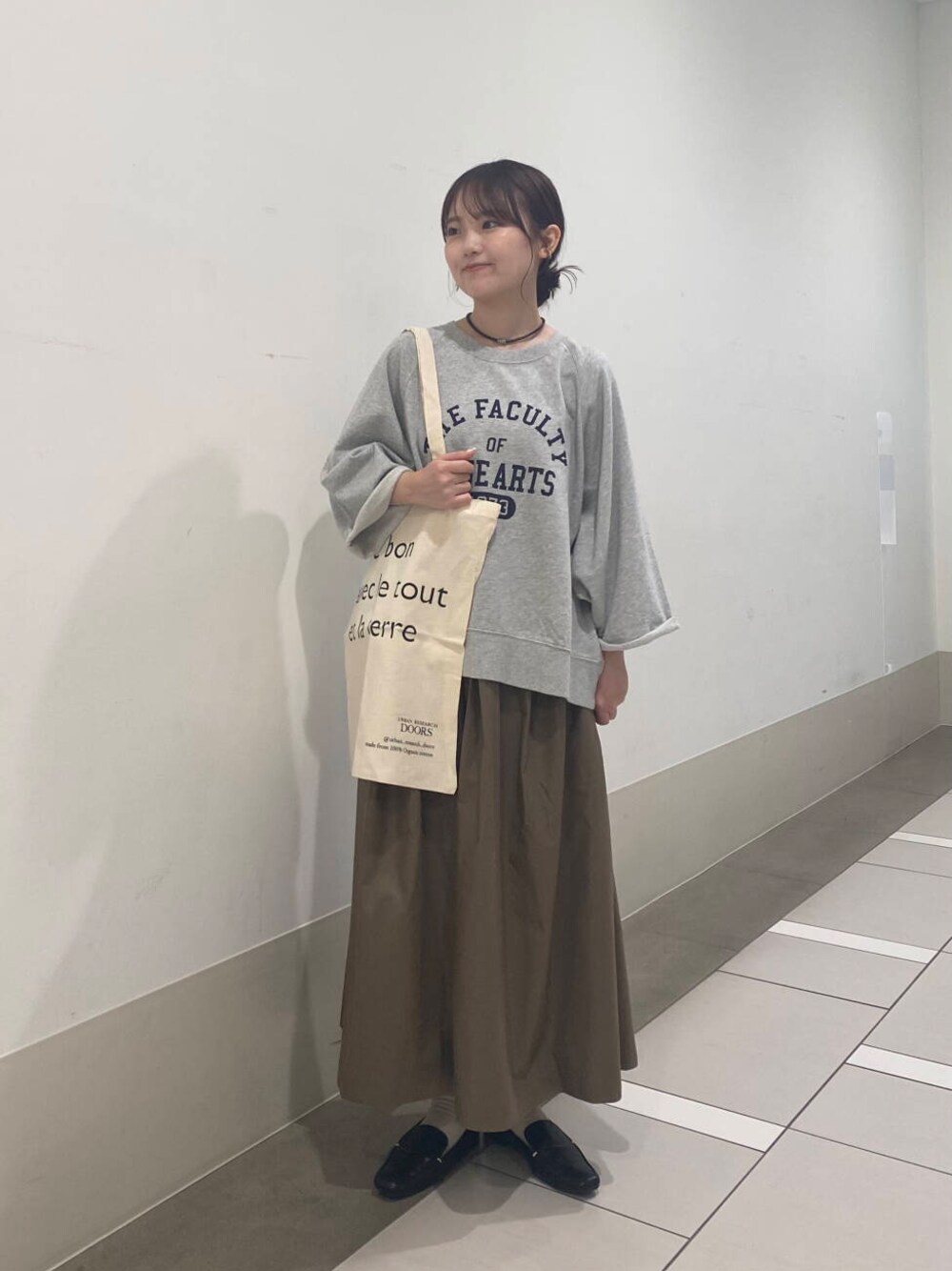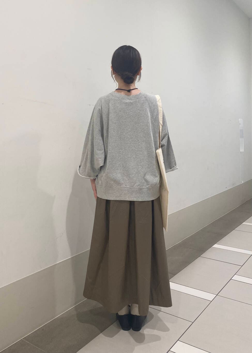 グレーやベージュなどの落ち着いた色味でまとめて、靴とネックレスは黒でワンポイントにしました✨