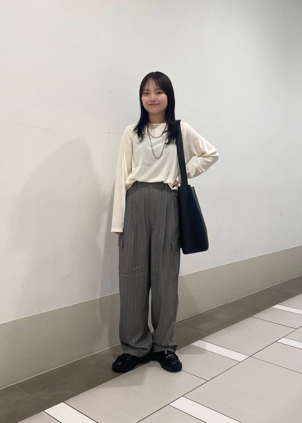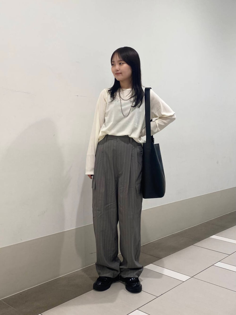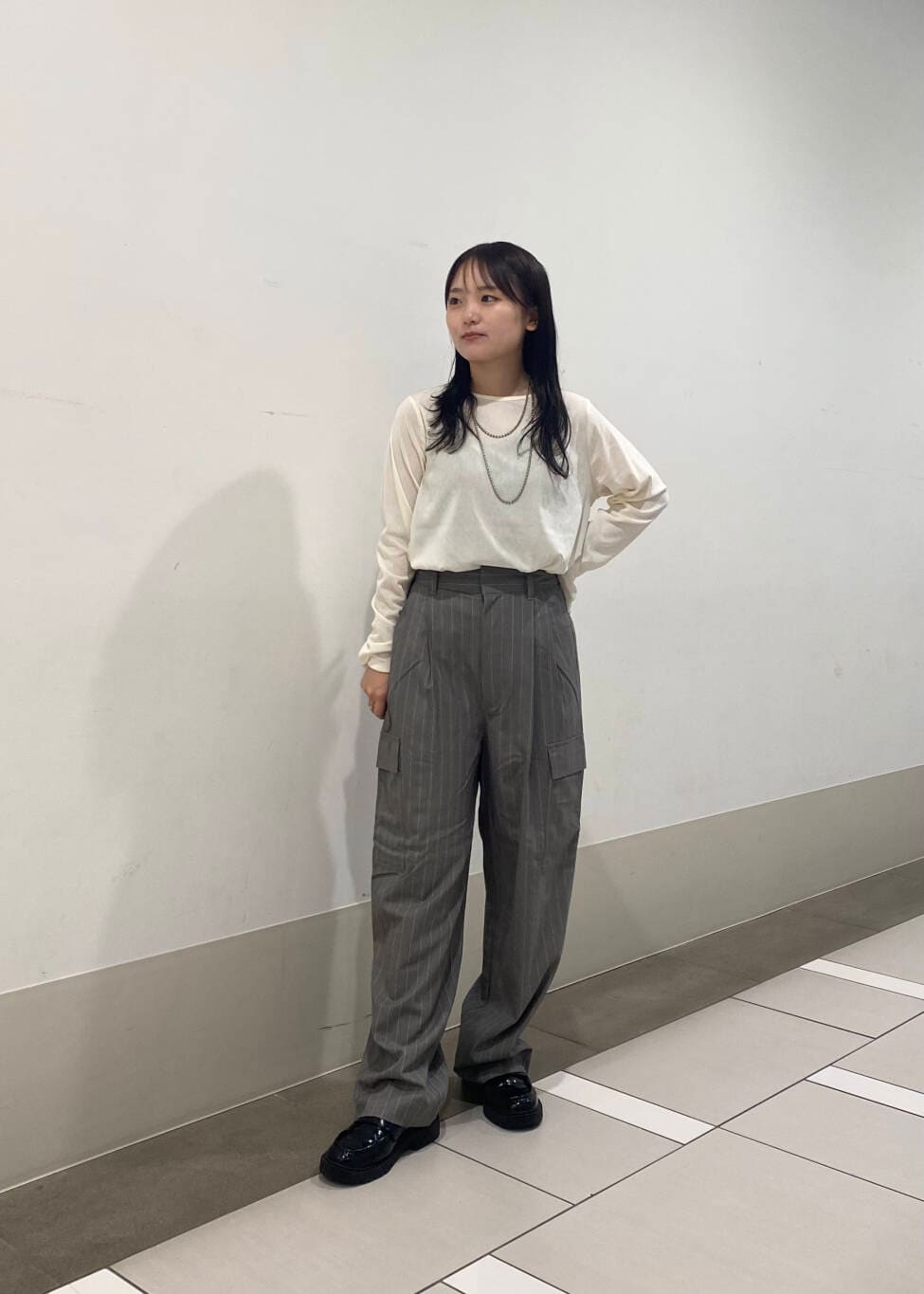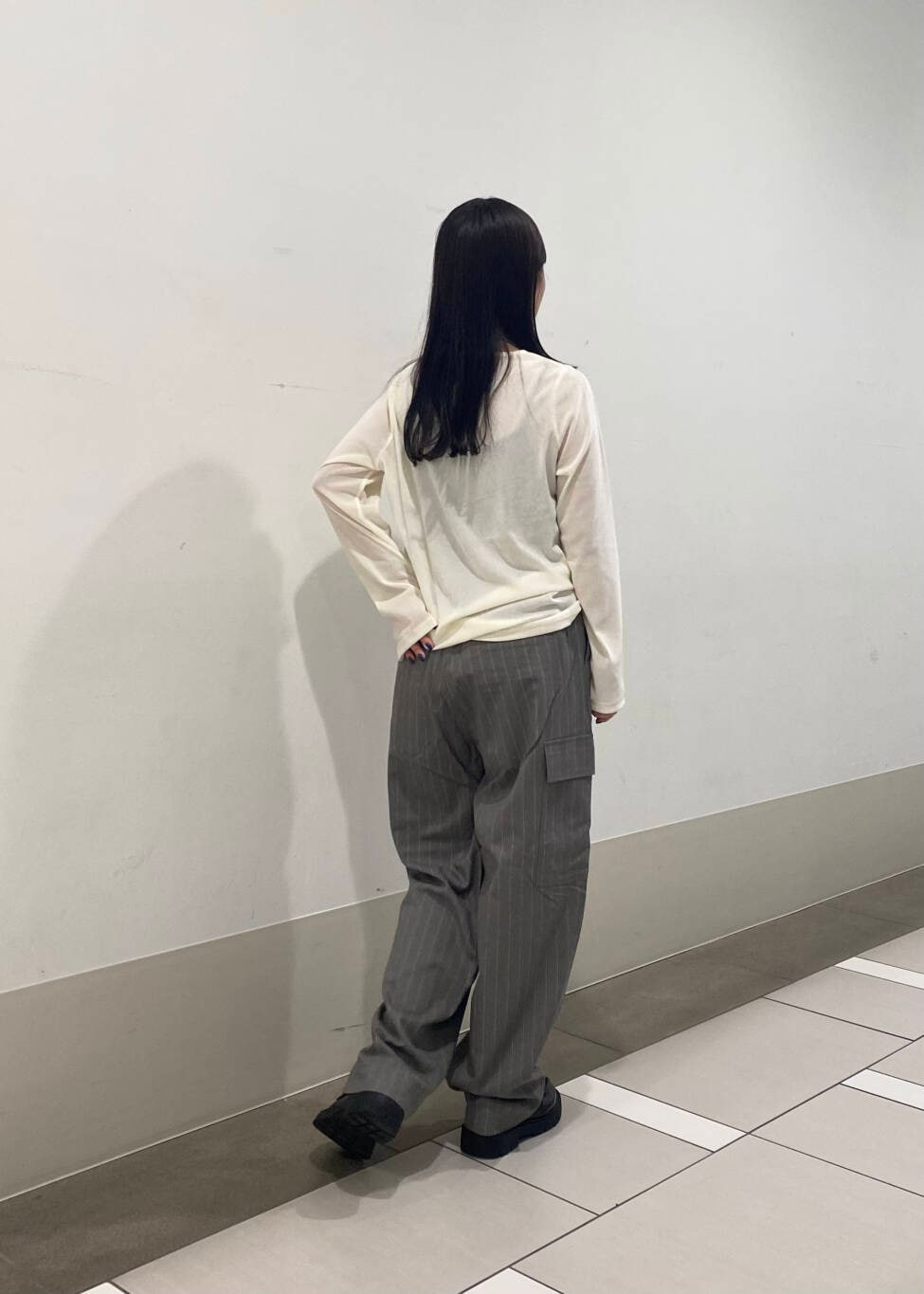 ストライプカーゴパンツは、細めのピンストライプでどんなトップスにも合わせやすくシンプルなスタイルもにも映えるパンツです✨