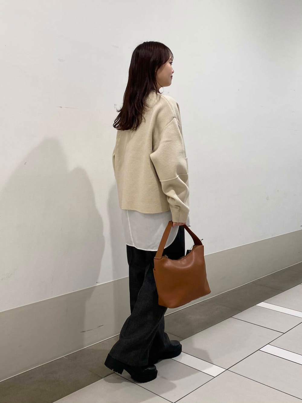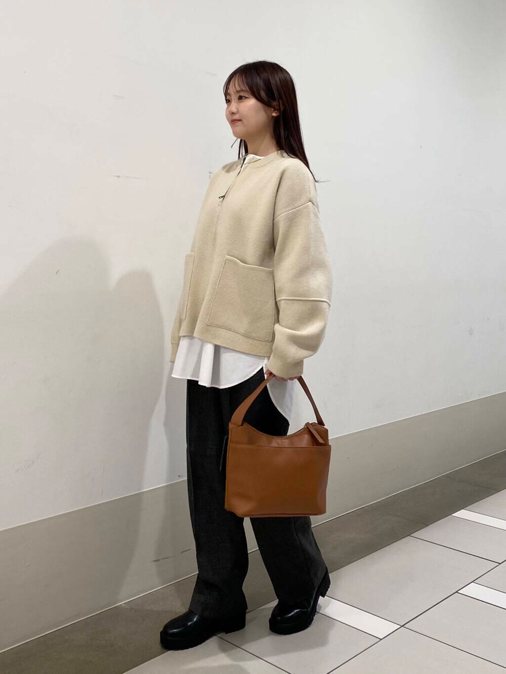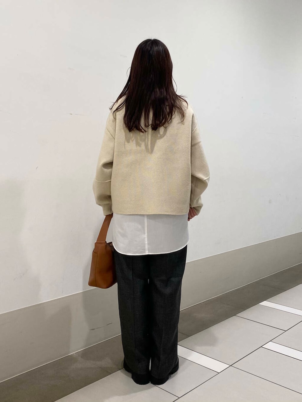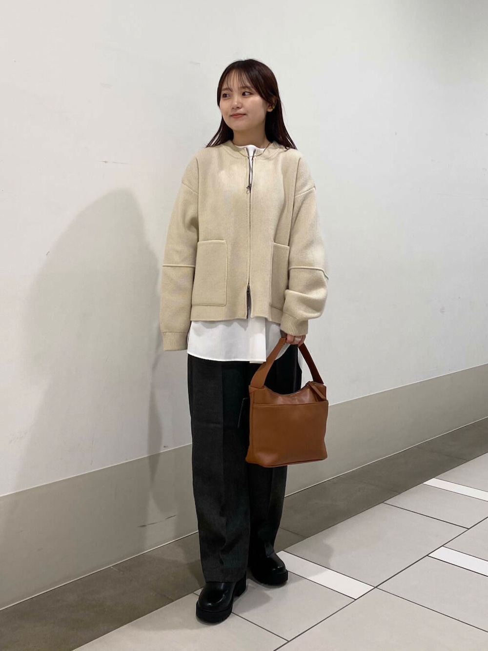 センタープレスが入っていて綺麗見えするパンツですが、ウエストゴムになっているのでとっても楽ちんです!!ワイドなシルエットなので、かっちりしすぎず、綺麗目にもカジュアルにも合わせやすいです◎