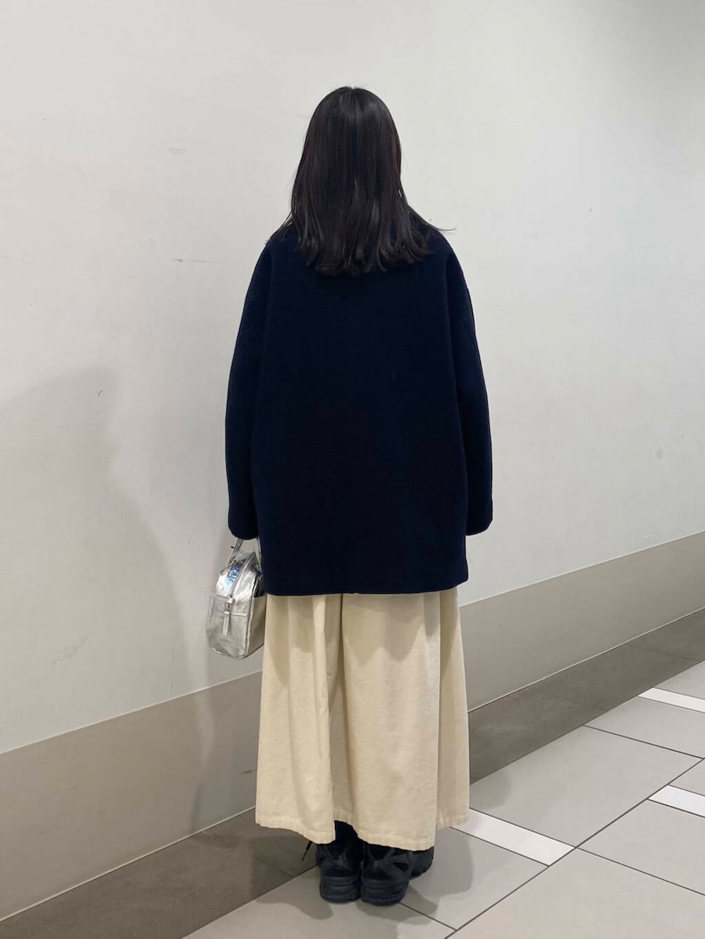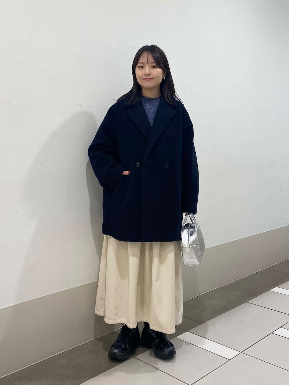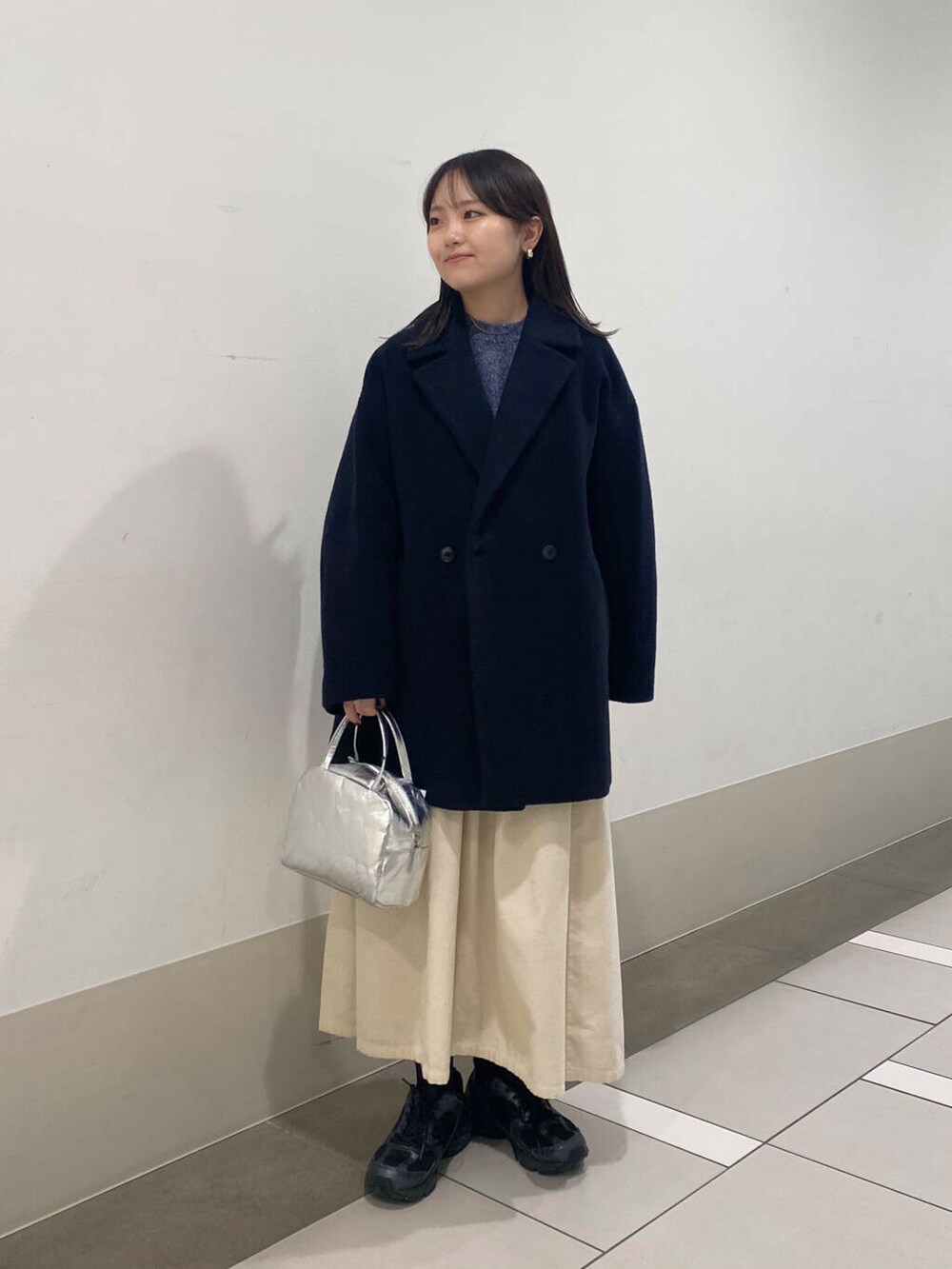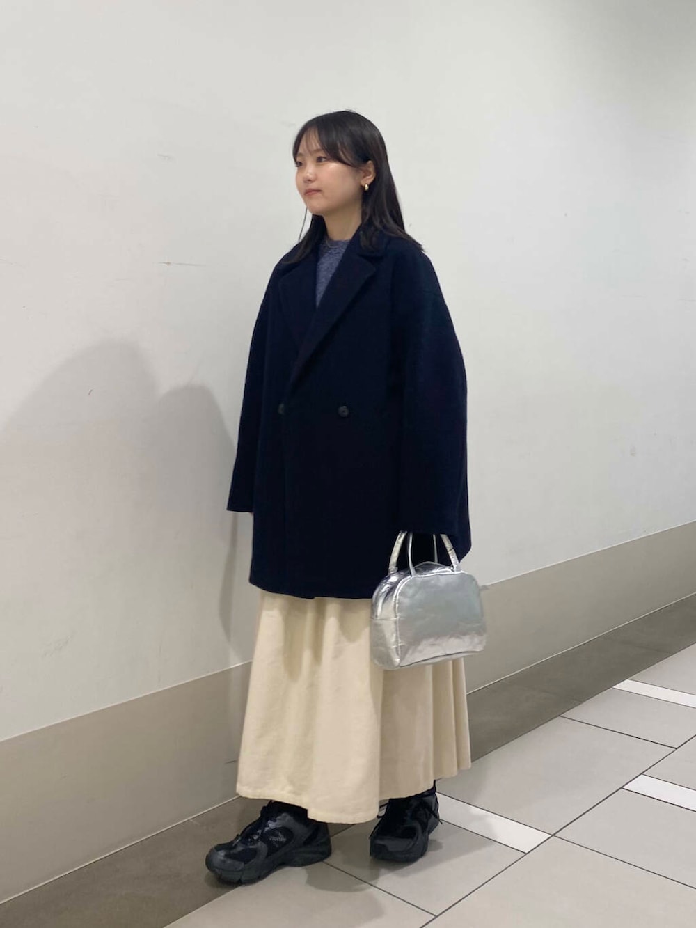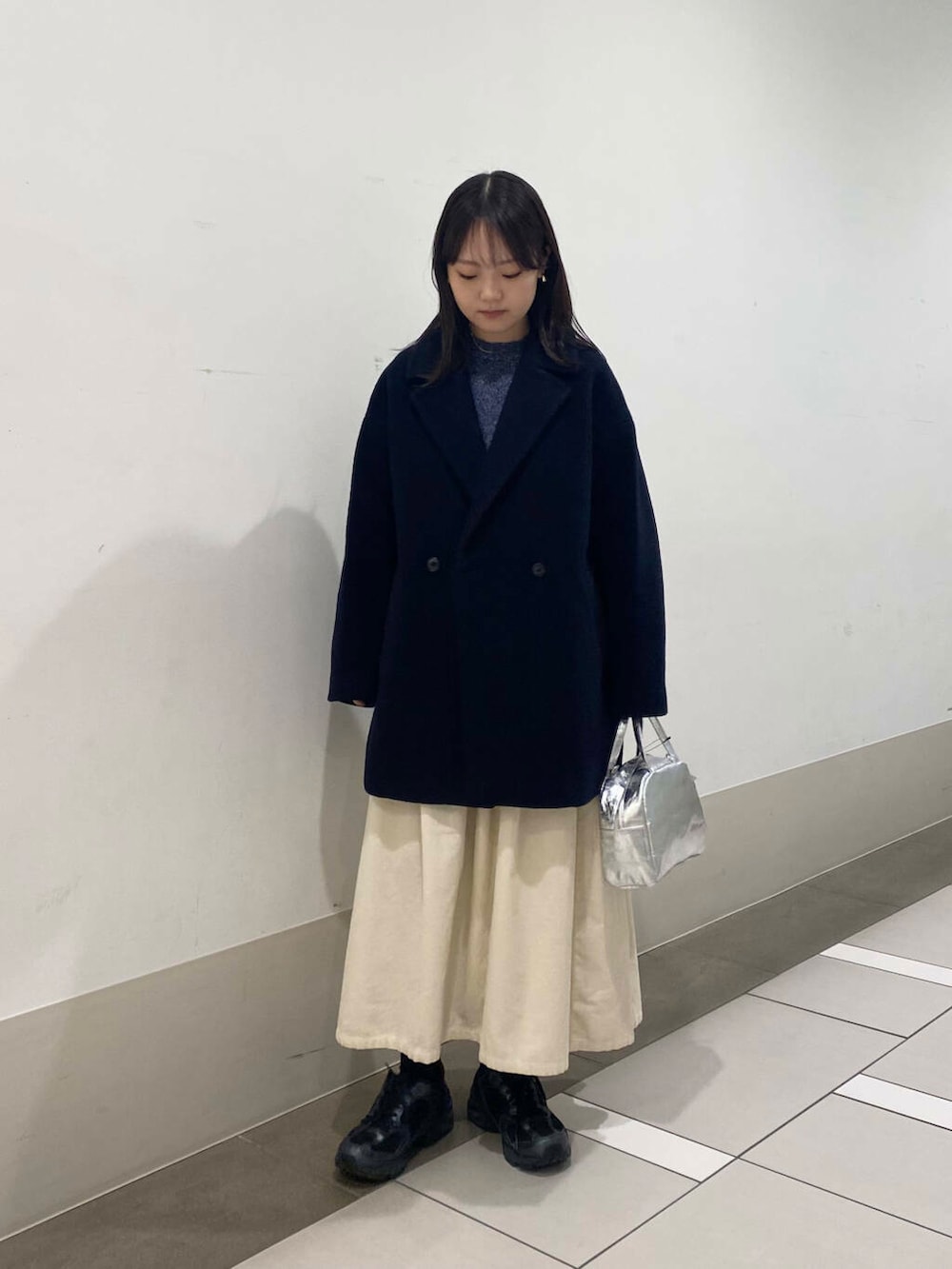 シルバーのバッグとスカートできれいめアイテムををプラスしました✨