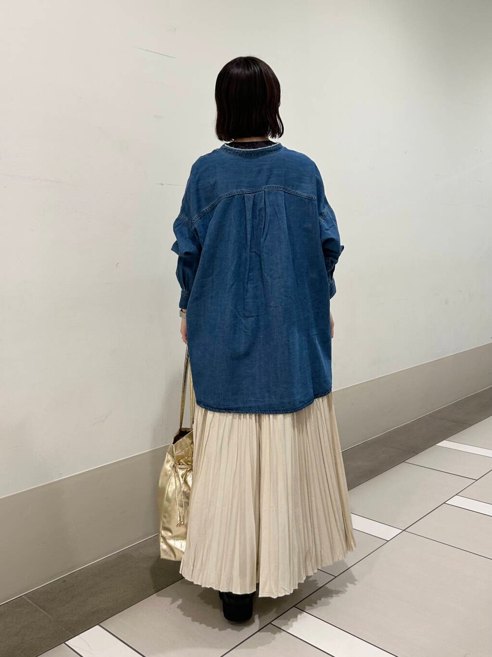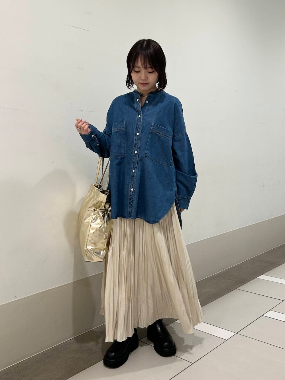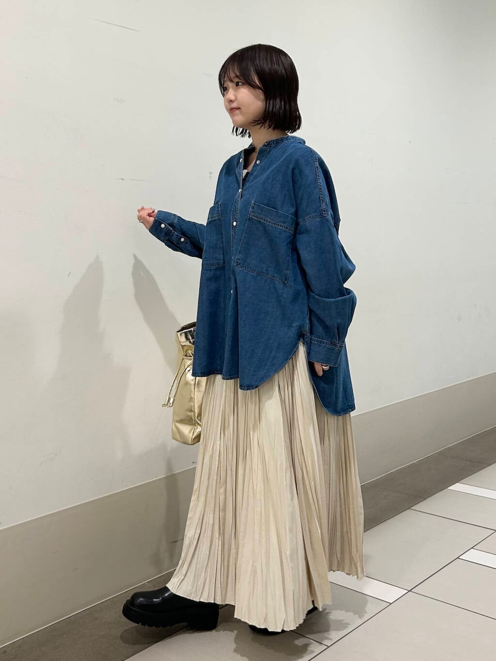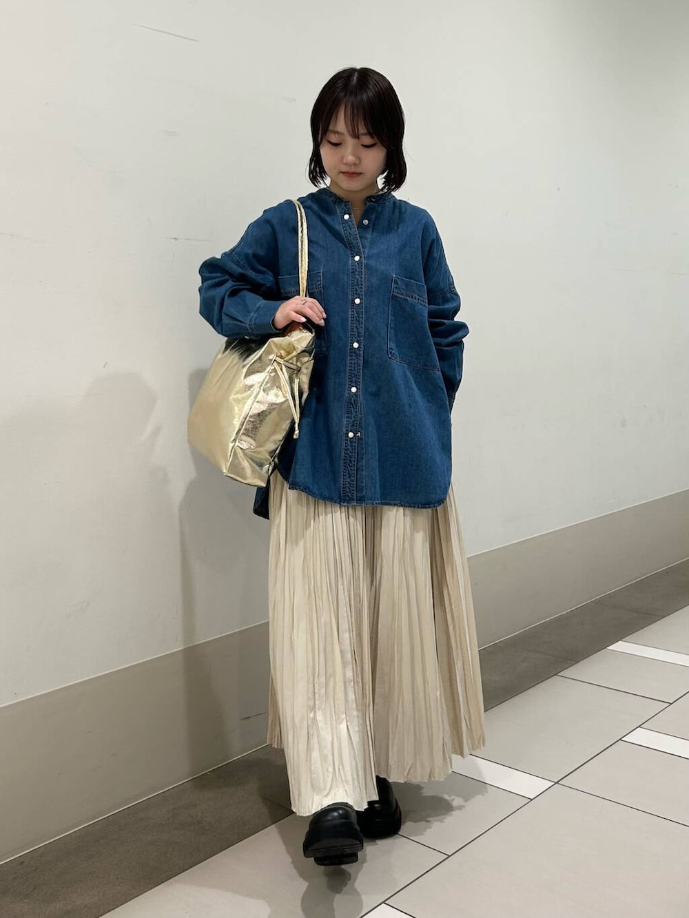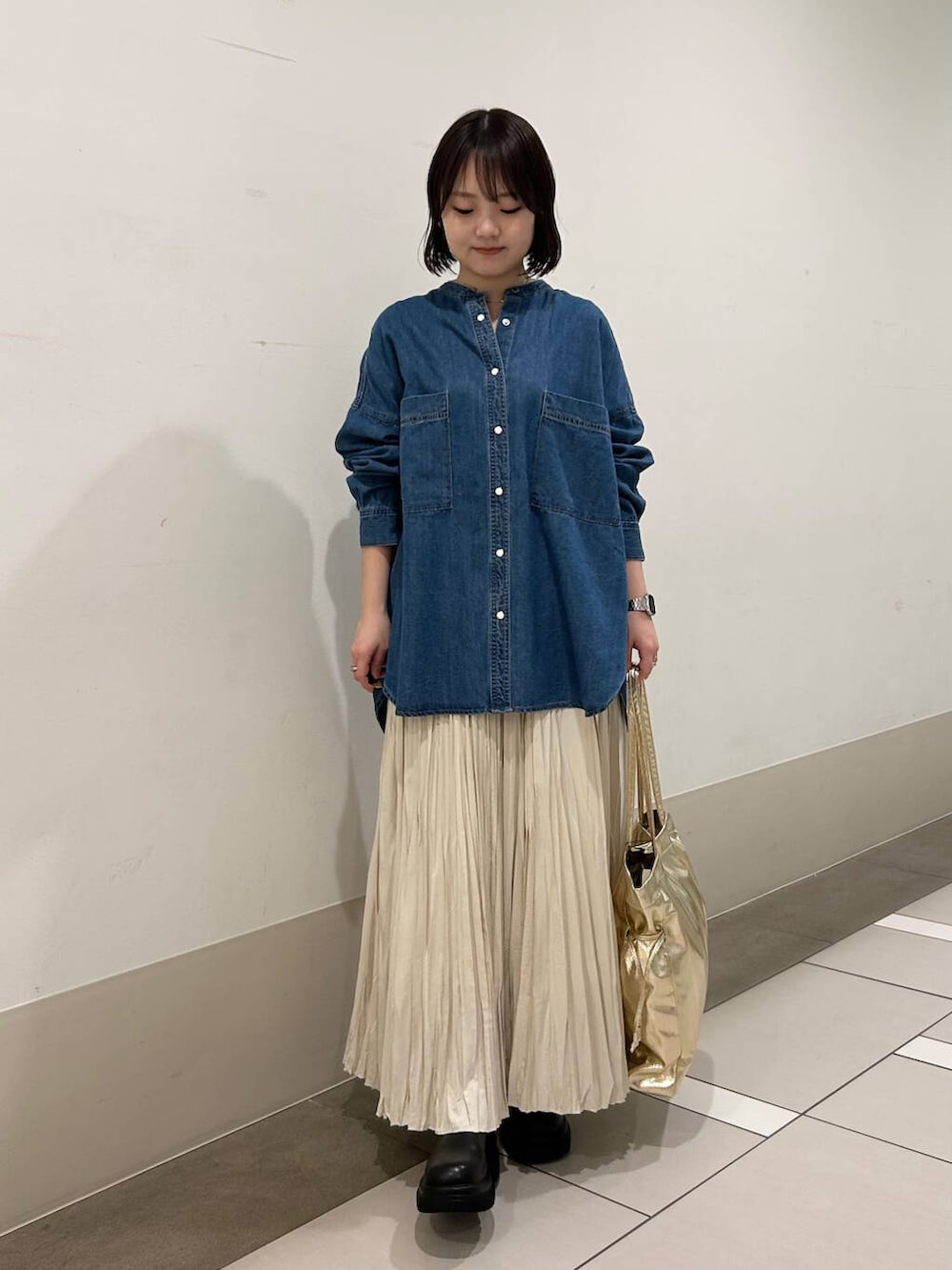 デニムシャツにオフホワイトのロングスカートを合わせた可愛らしいデニムコーデです✨