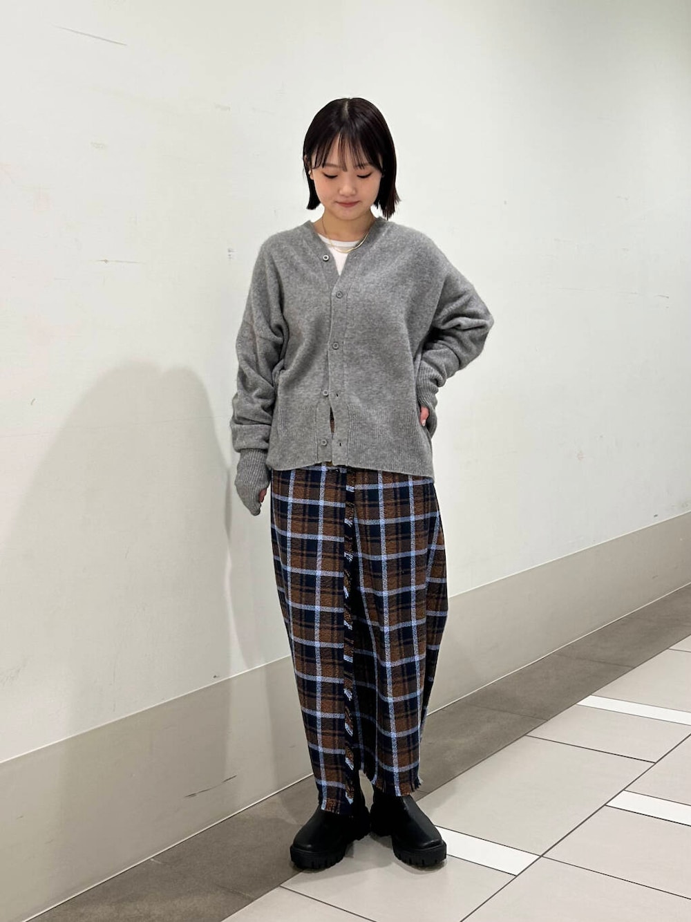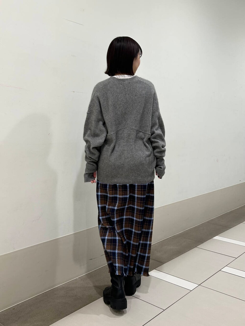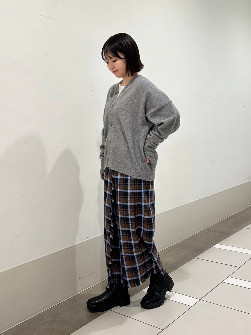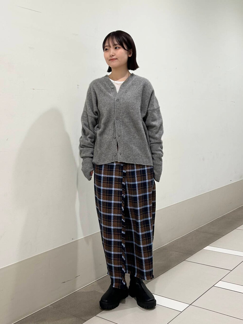 チェックのストレートスカートを合わせて、大人っぽさもありつつ少し甘さを加えたコーデにしました✨