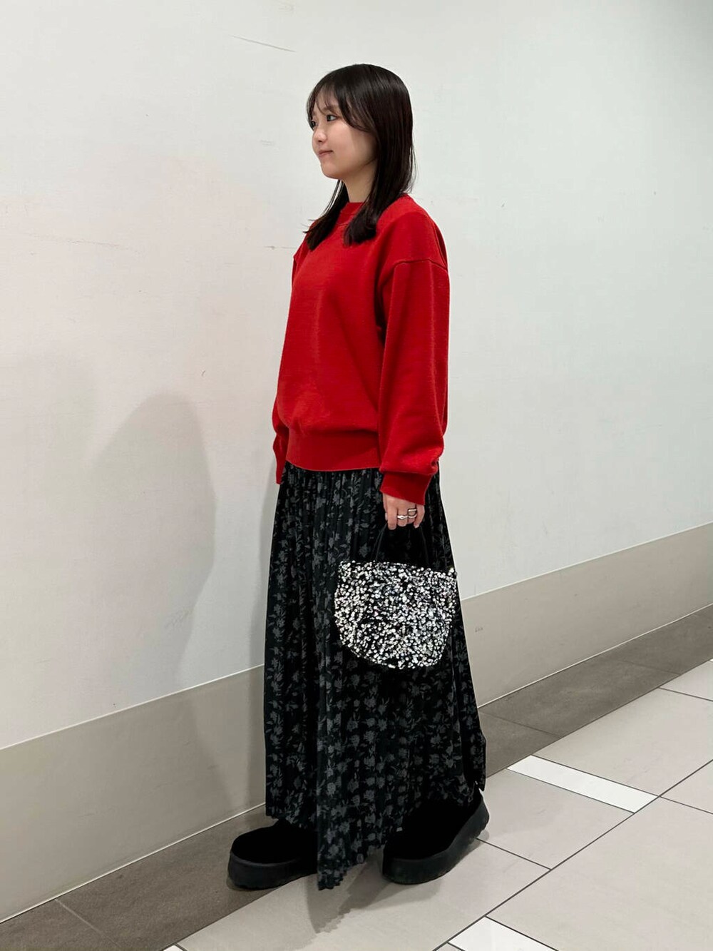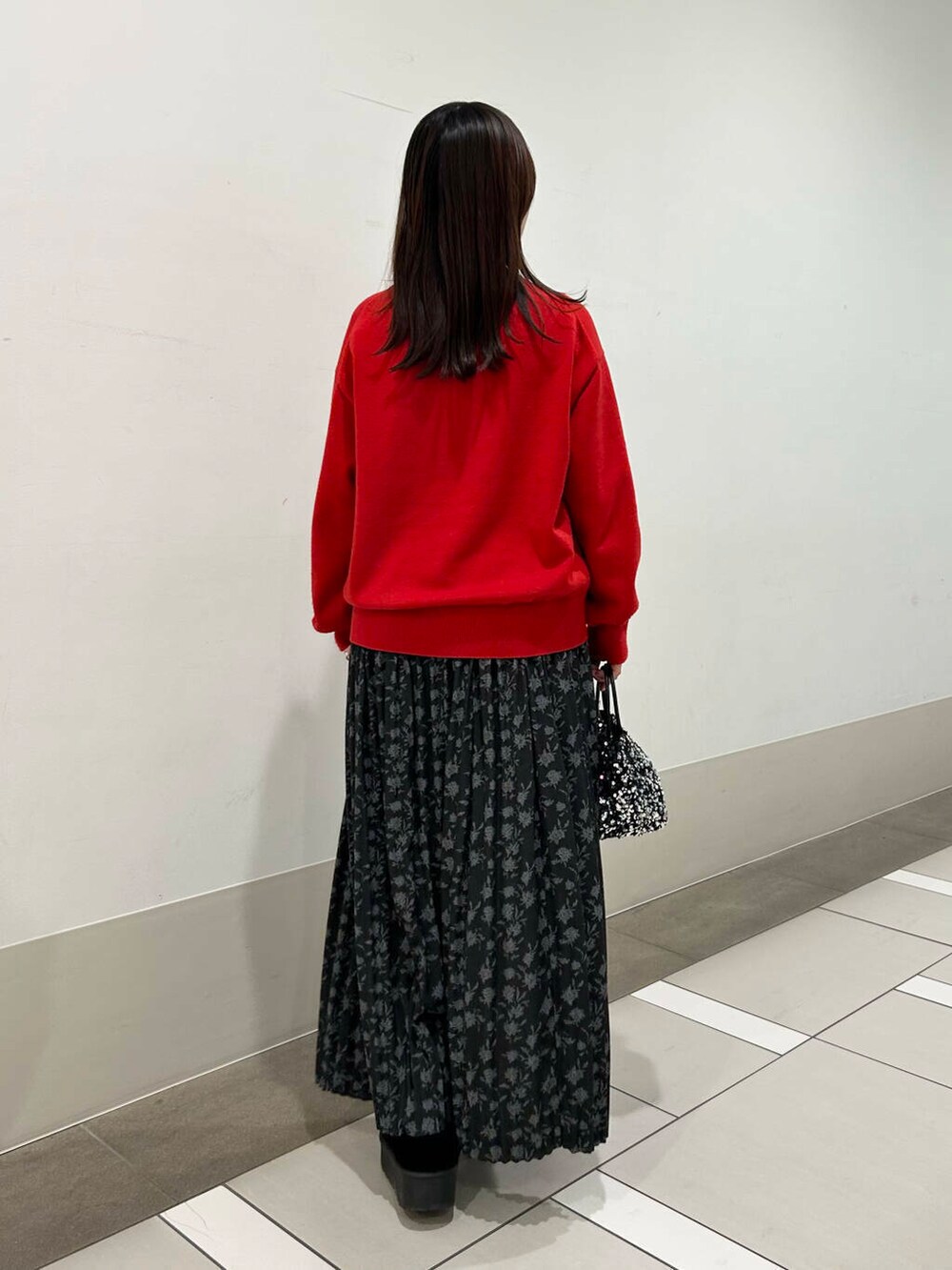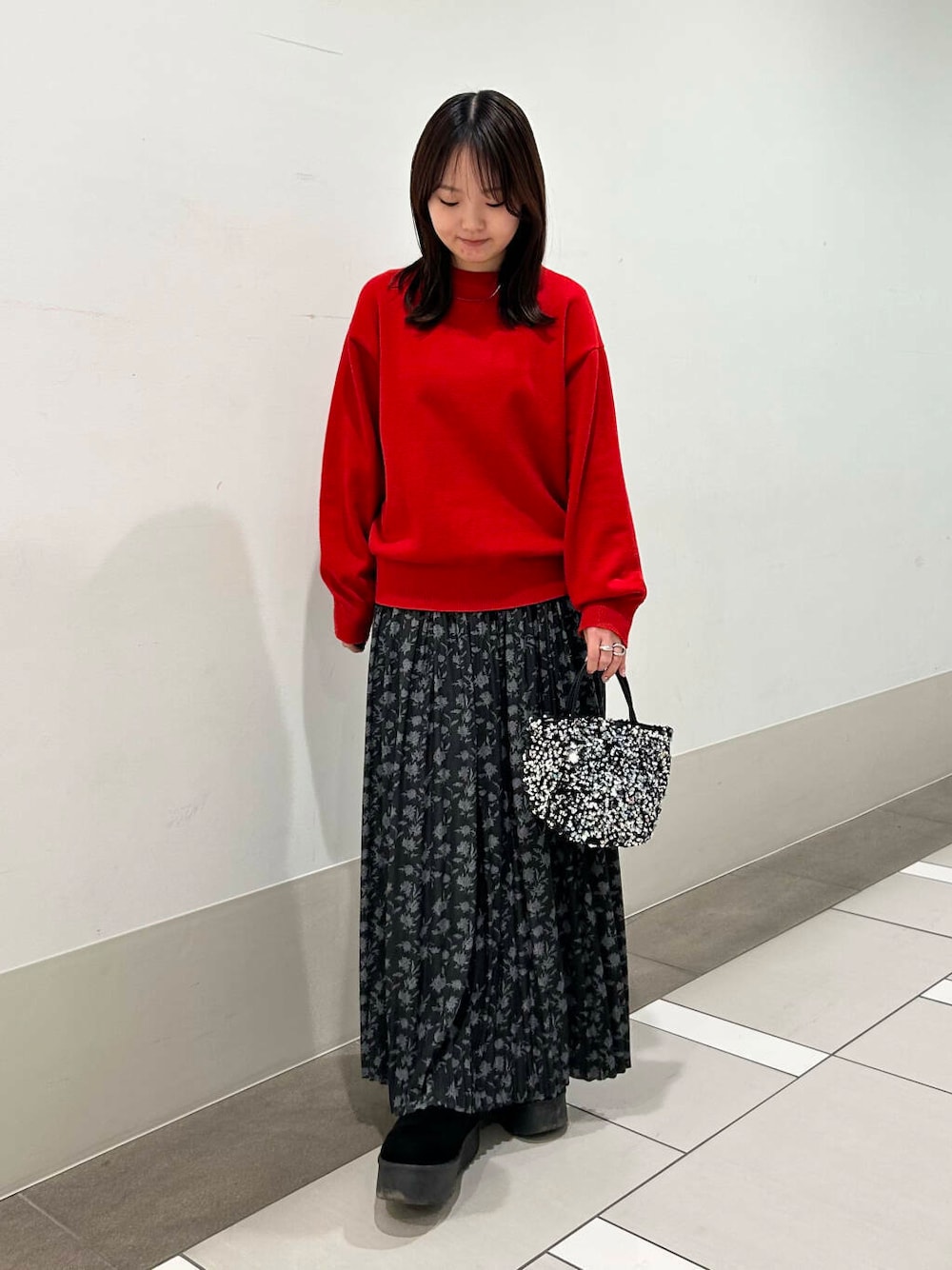 スウェットライクなニットですが、花柄のスカートを合わせて女性らしいコーデに🙆🏻♀️