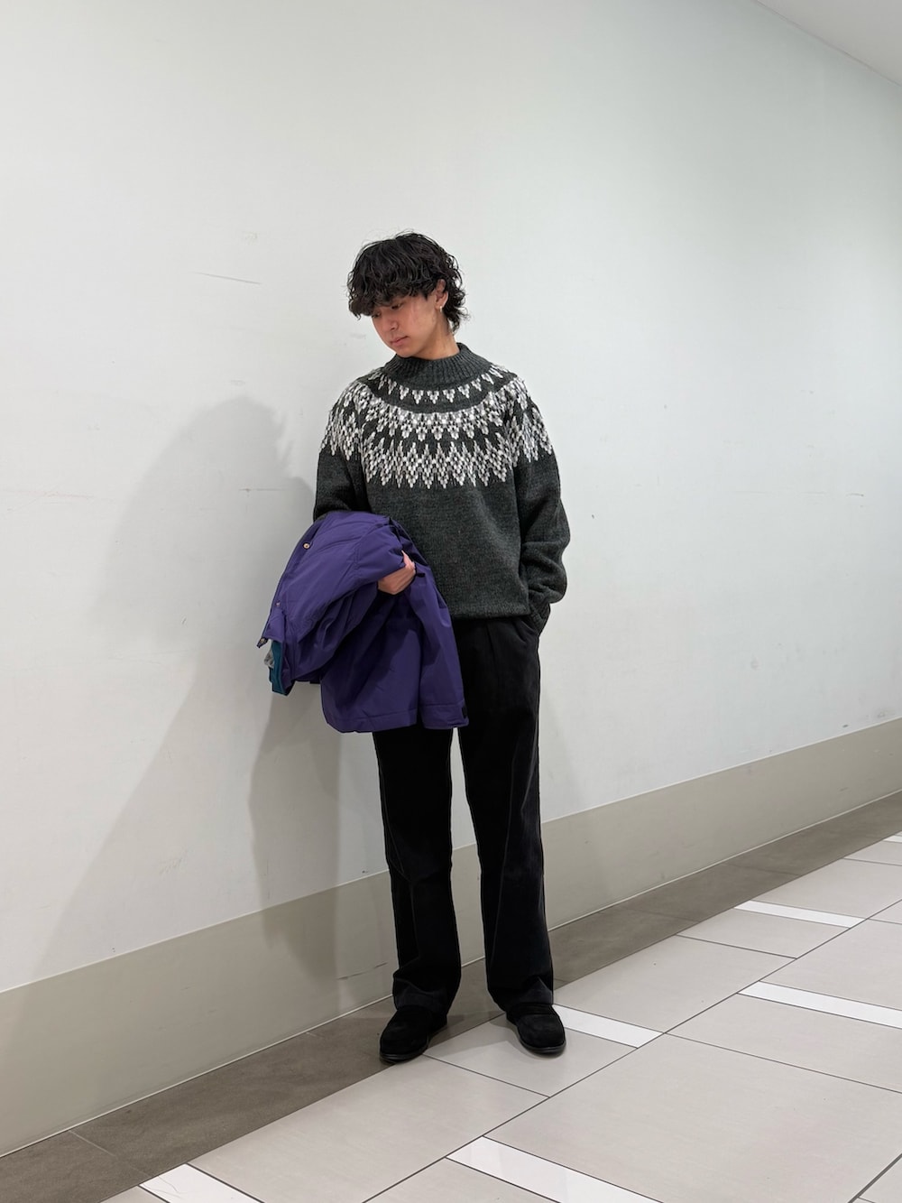 アウターのボリューム感と鮮やかな色に対し、黒のストレートまたはワイドパンツと黒のシューズで全体をシックに引き締めています。