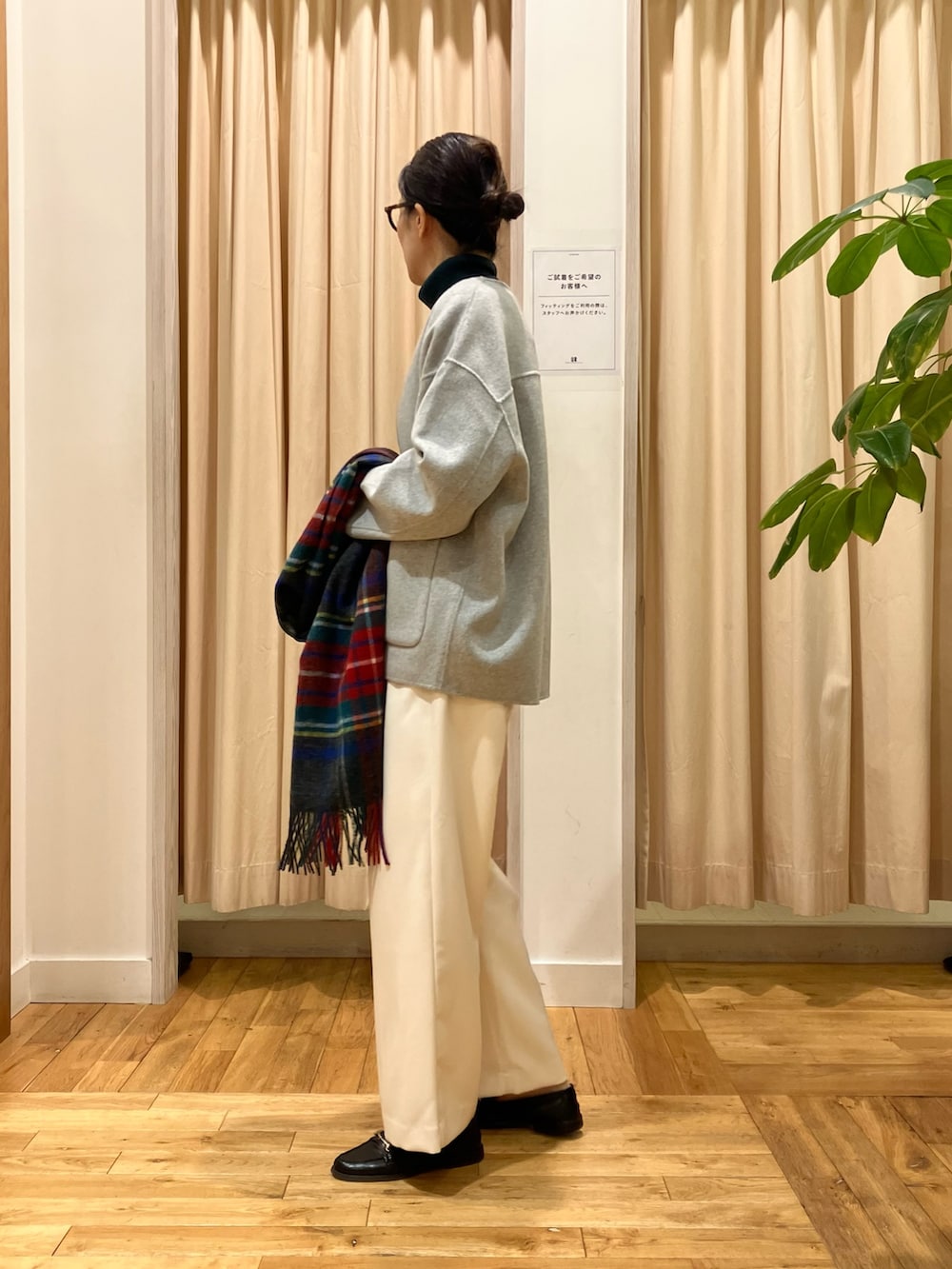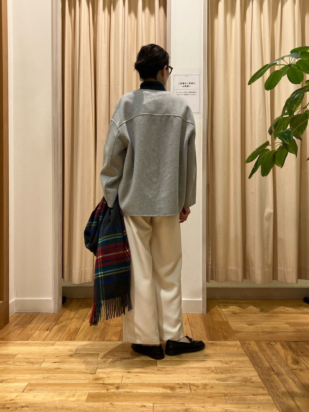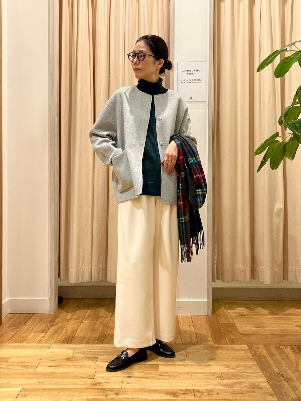 グリーン+ツイードミルのチェックストールで、ホリデー感のあるコーディネートに◎