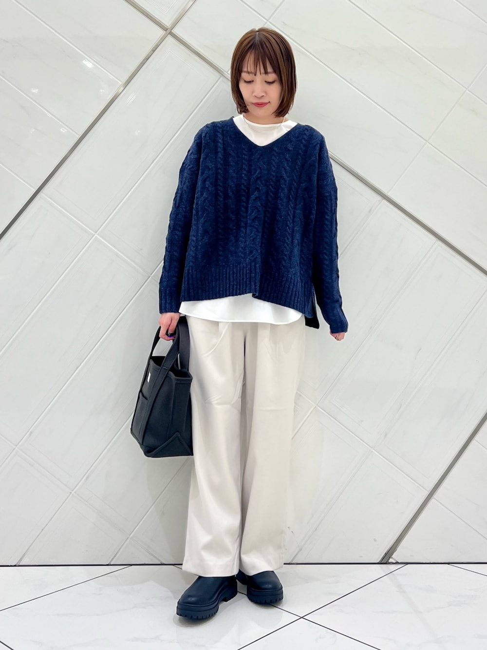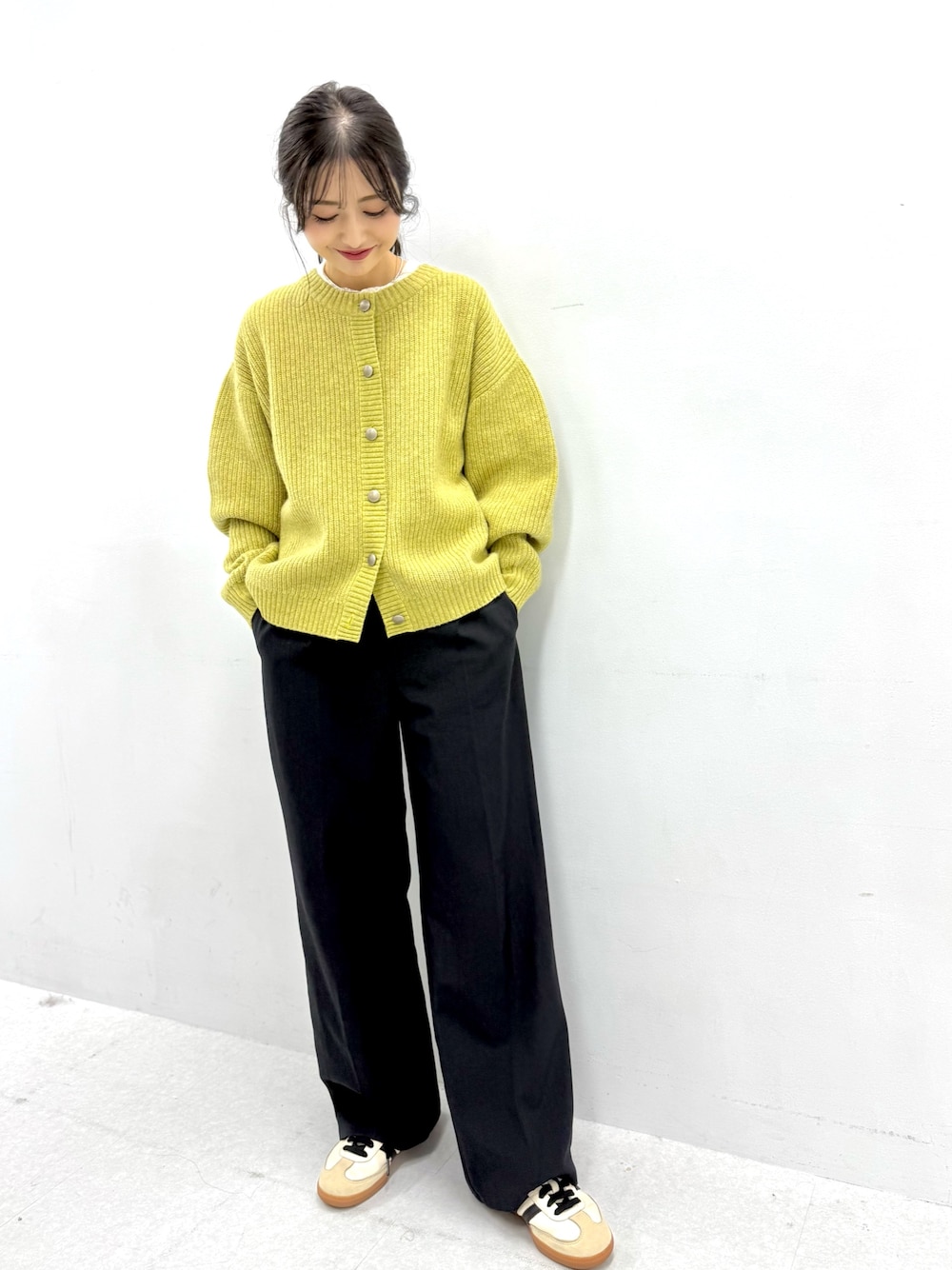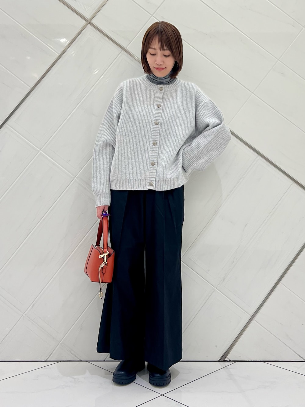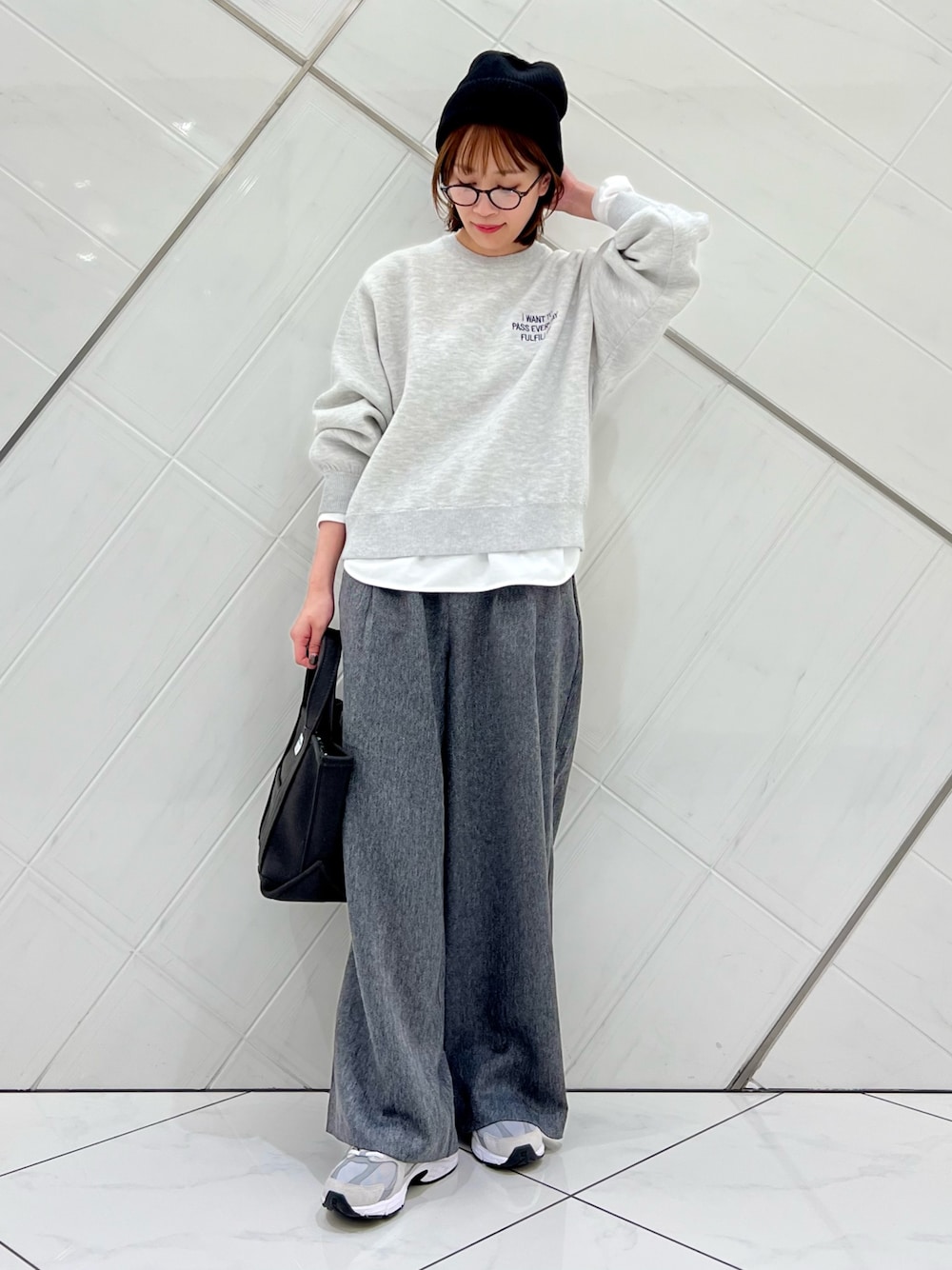 ボトムは9分丈のワイドパンツでウエスト周りもすっきりとしたデザインなのでトップスインしていただくのもおすすめです。