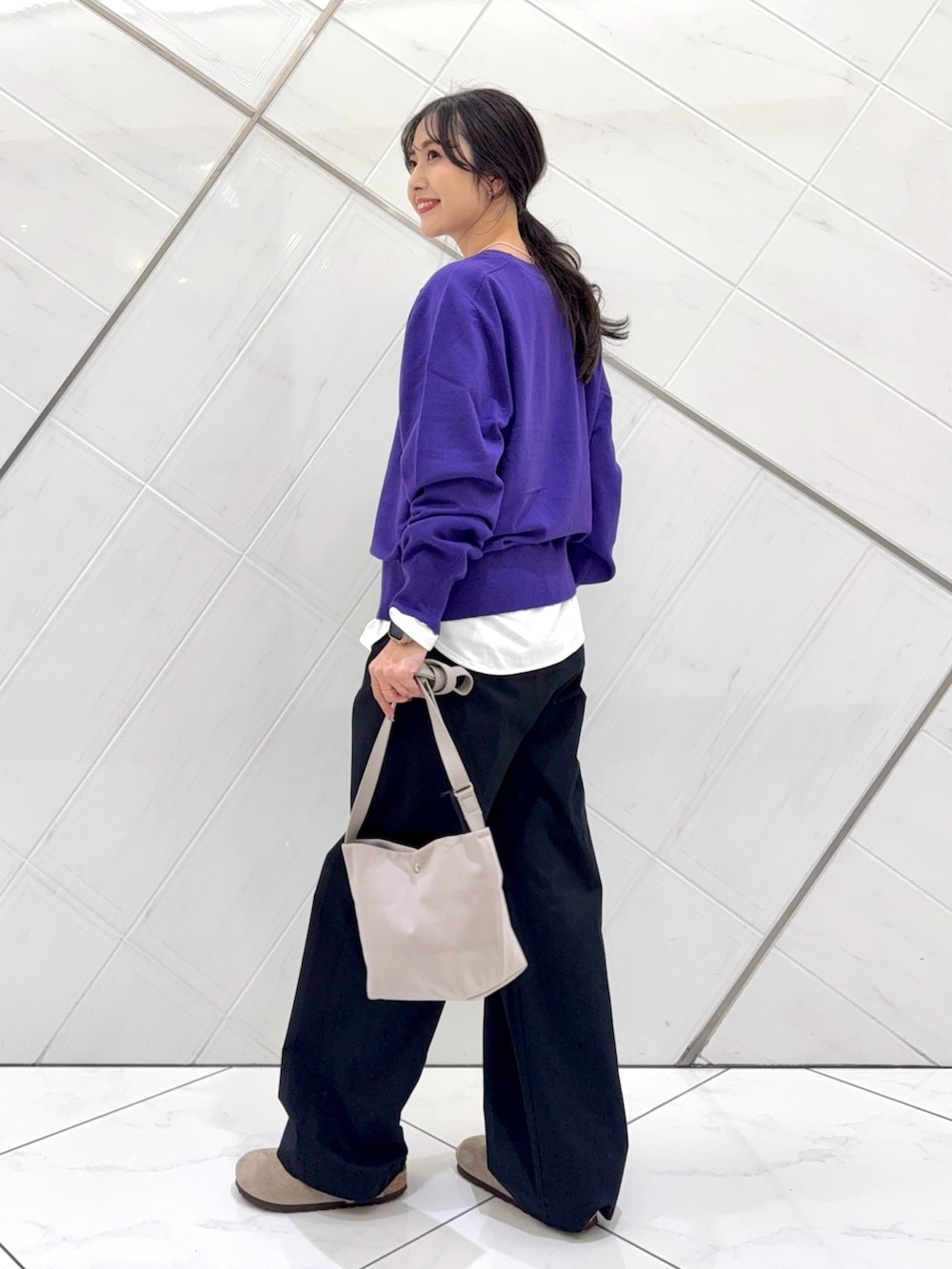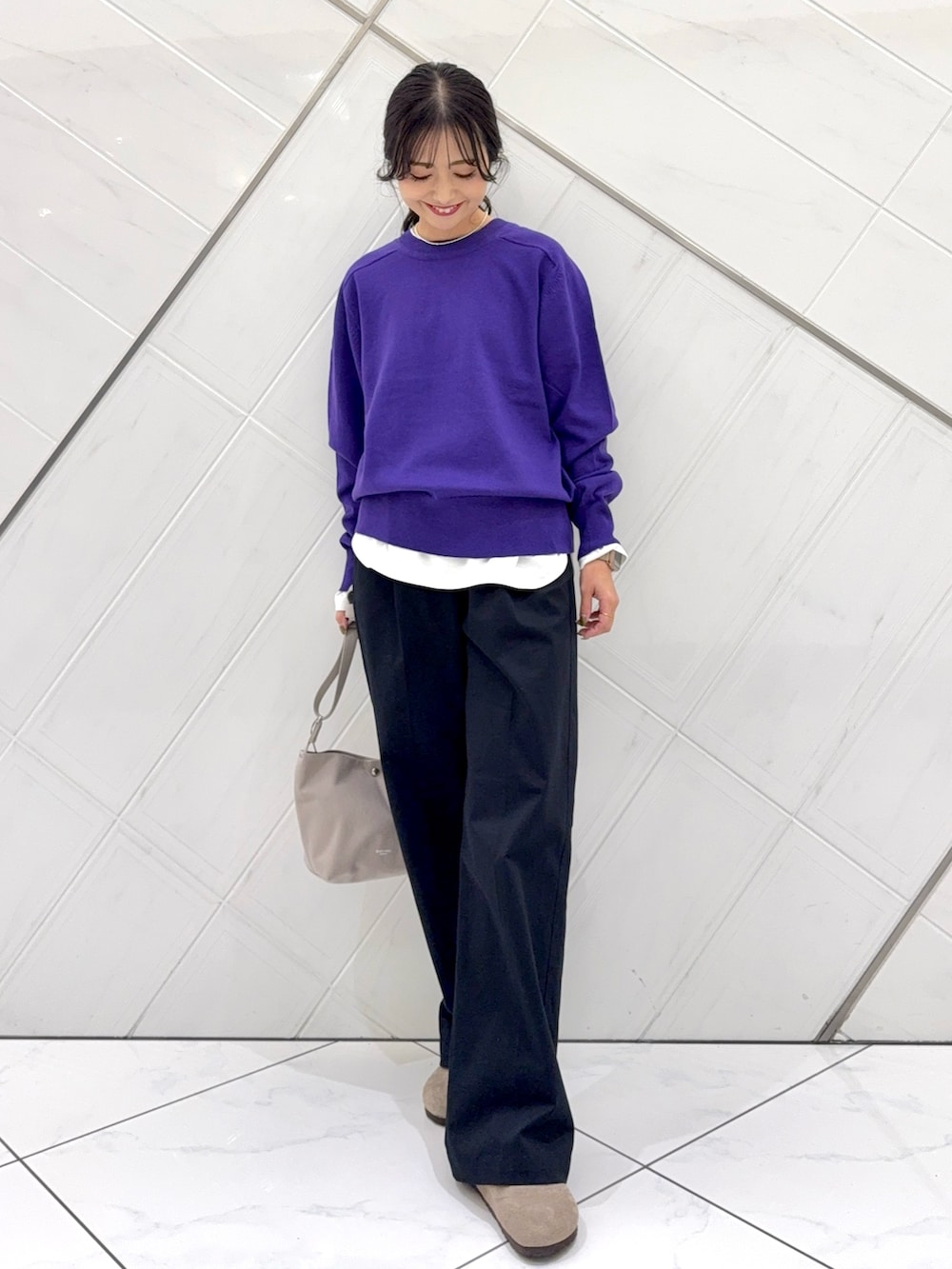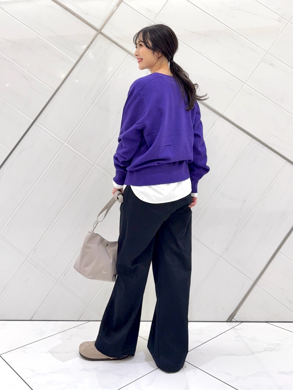 ニットは鮮やかなパープルでコーディネートのアクセントになり、チクチク感もないので着心地のいいアイテムです。