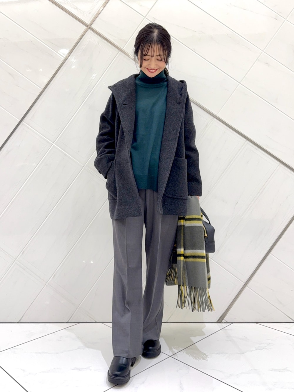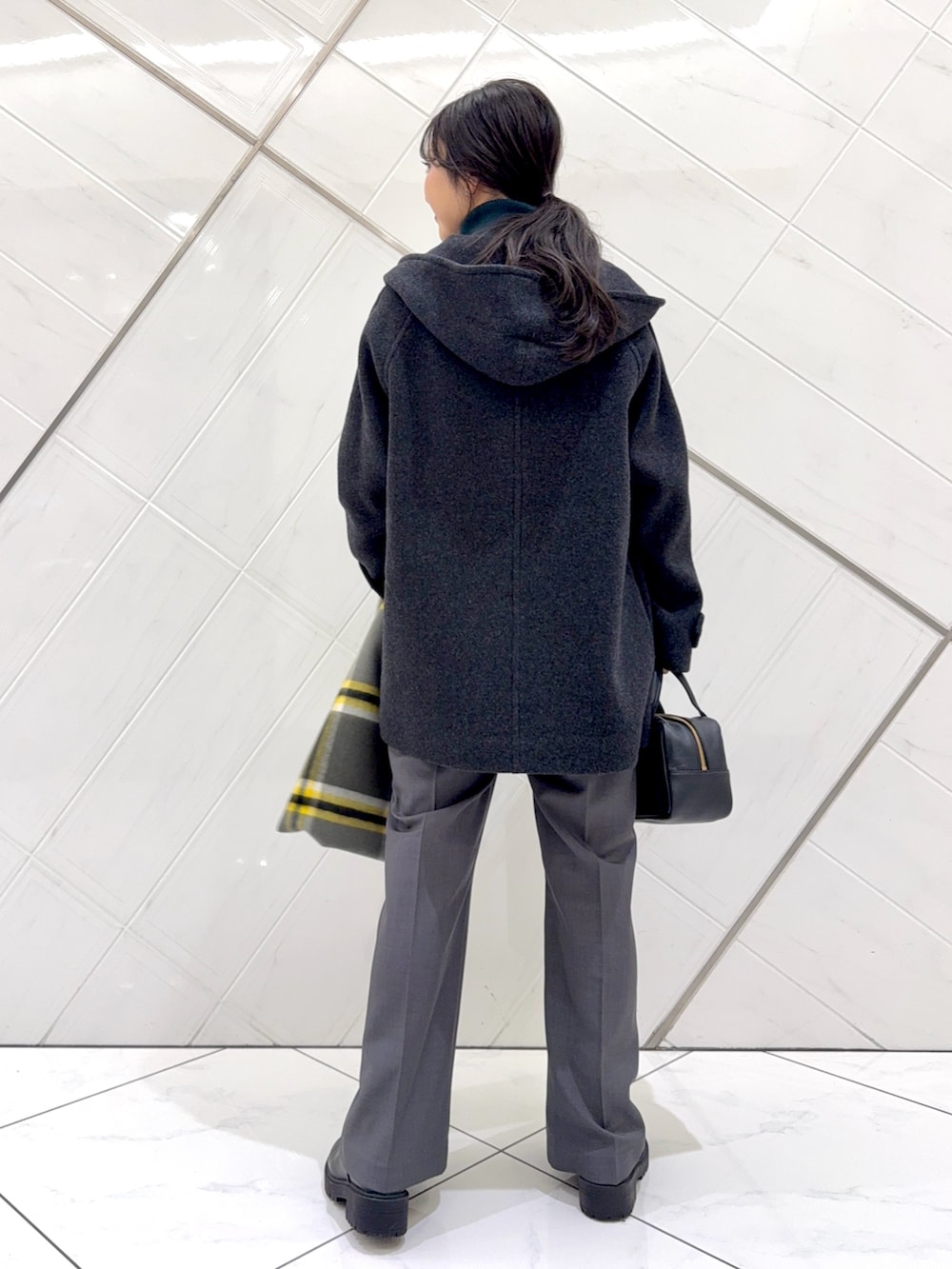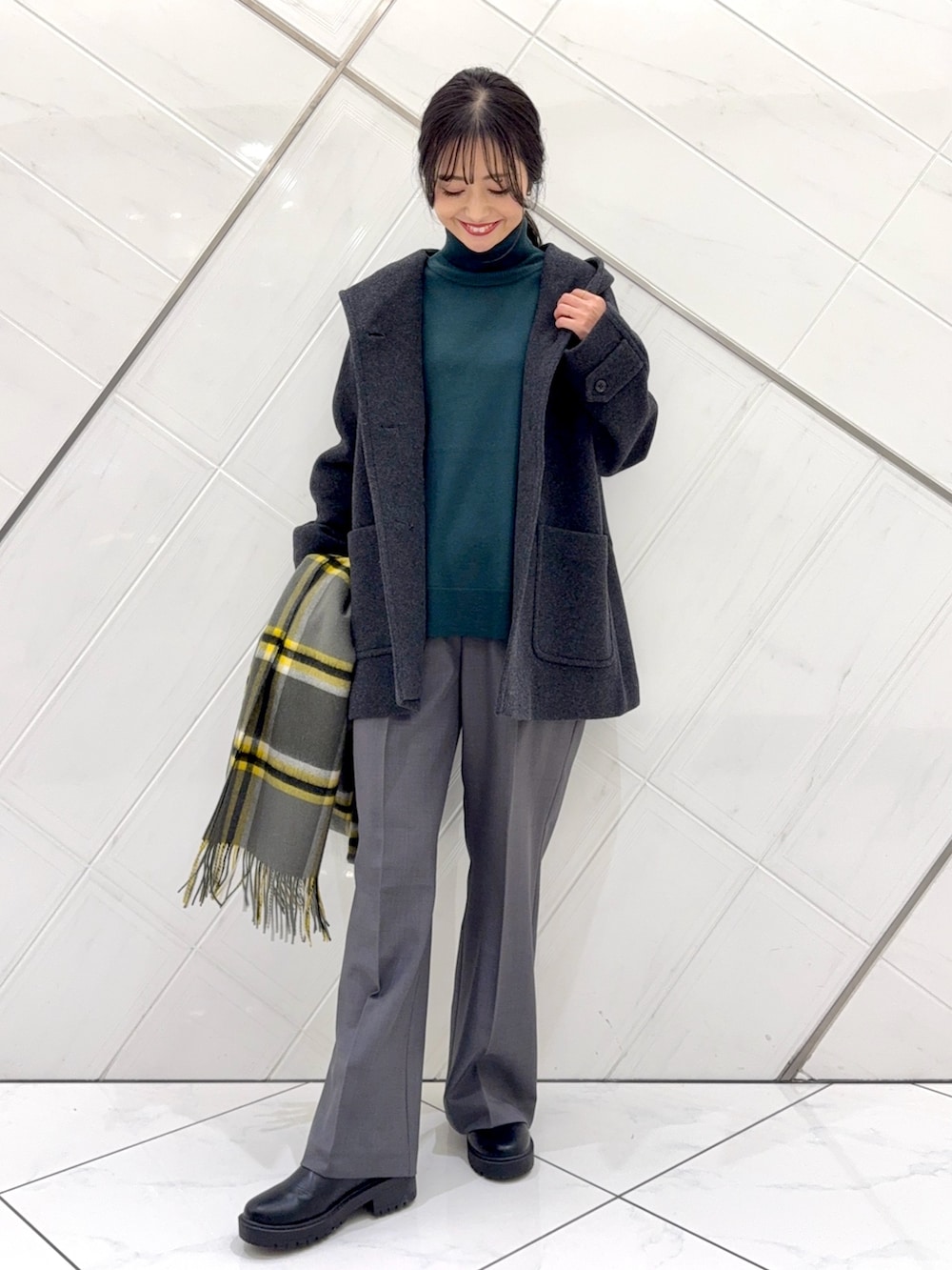 アウターは見た目以上に軽く、裏地も付いているので羽織りやすく、ヒップが隠れるくらいの着丈で着回ししやすいアイテムです。