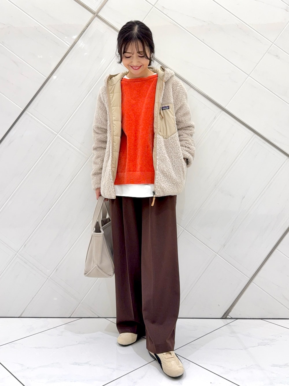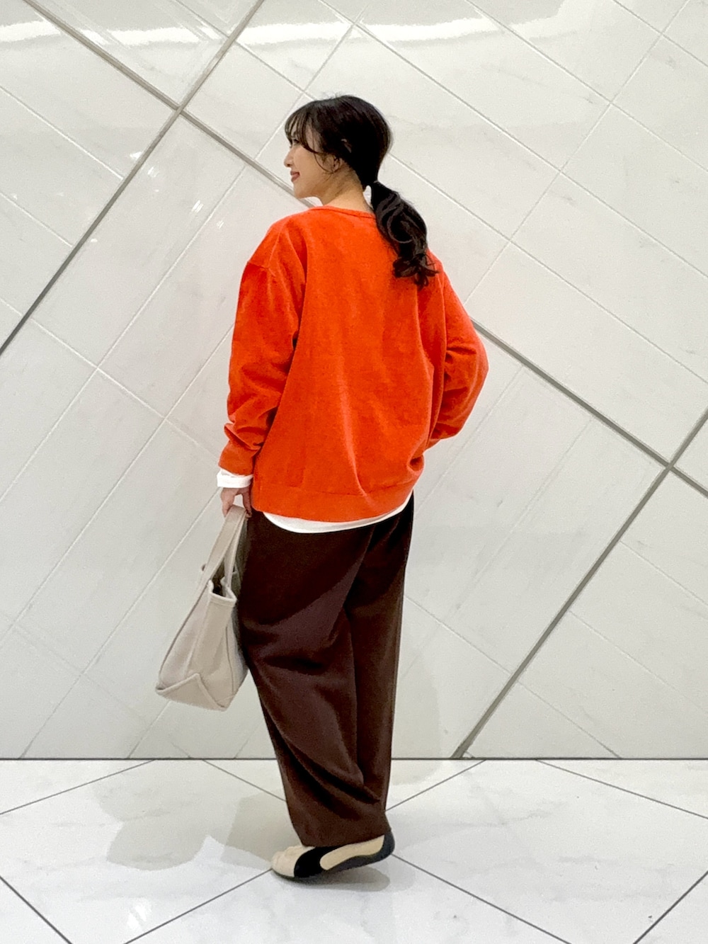 トップスは柔らかなモール生地のニットで毛玉になりにくく、さらっとした軽い着心地です。