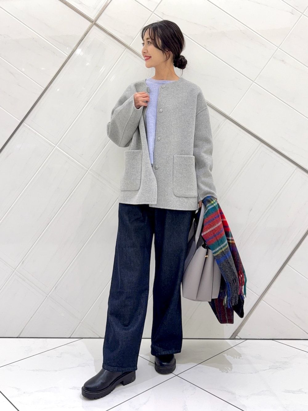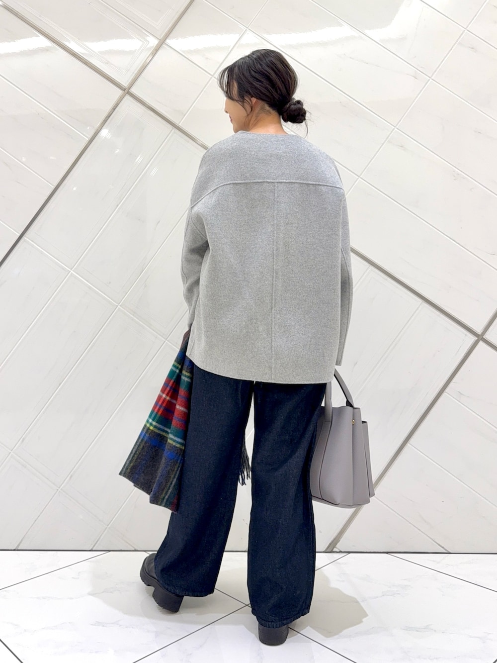 ノーカラーなので首周りがすっきりと見え、着込んだ上からでも羽織れるサイズ感です。