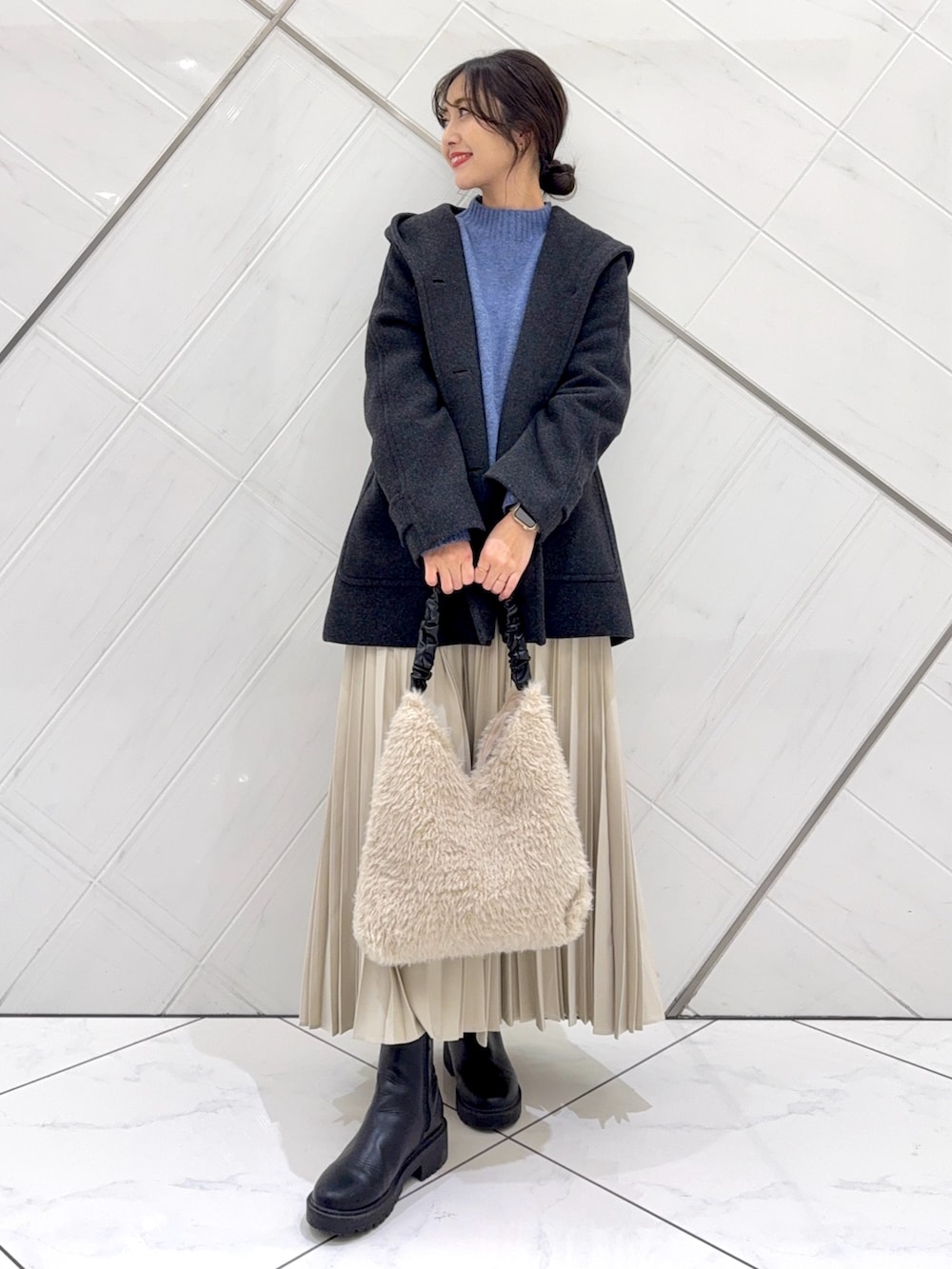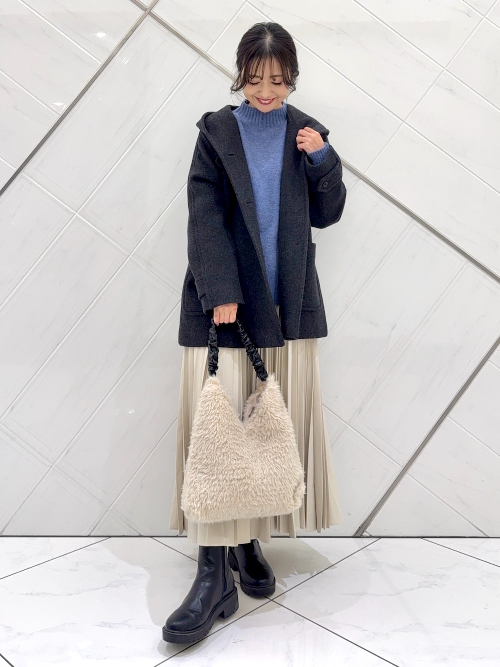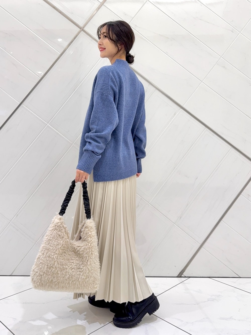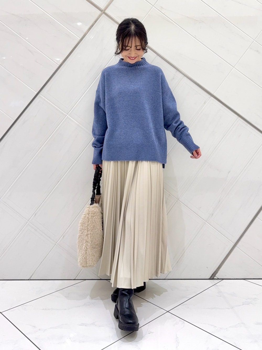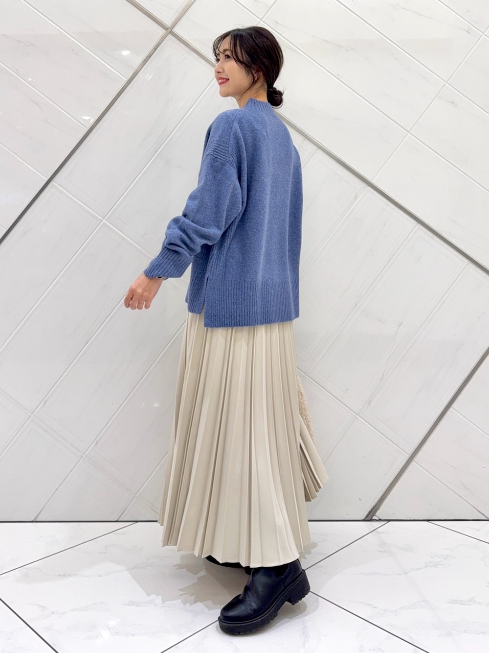 発色のいいブルーのニットは薄手で柔らかなもちもちとしたニットで着心地もよく、サイドにスリットが入っているのですっきりとしたシルエットです。