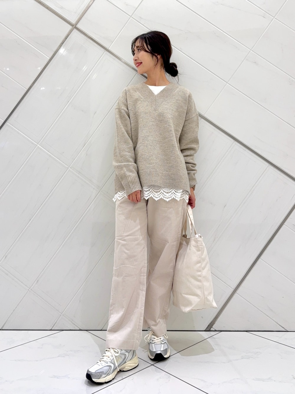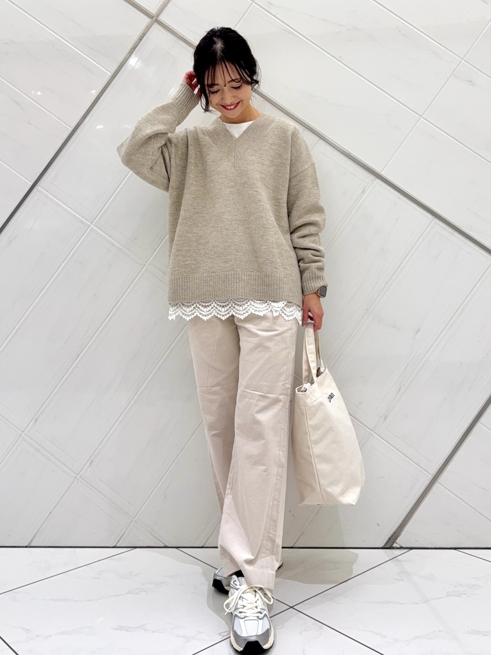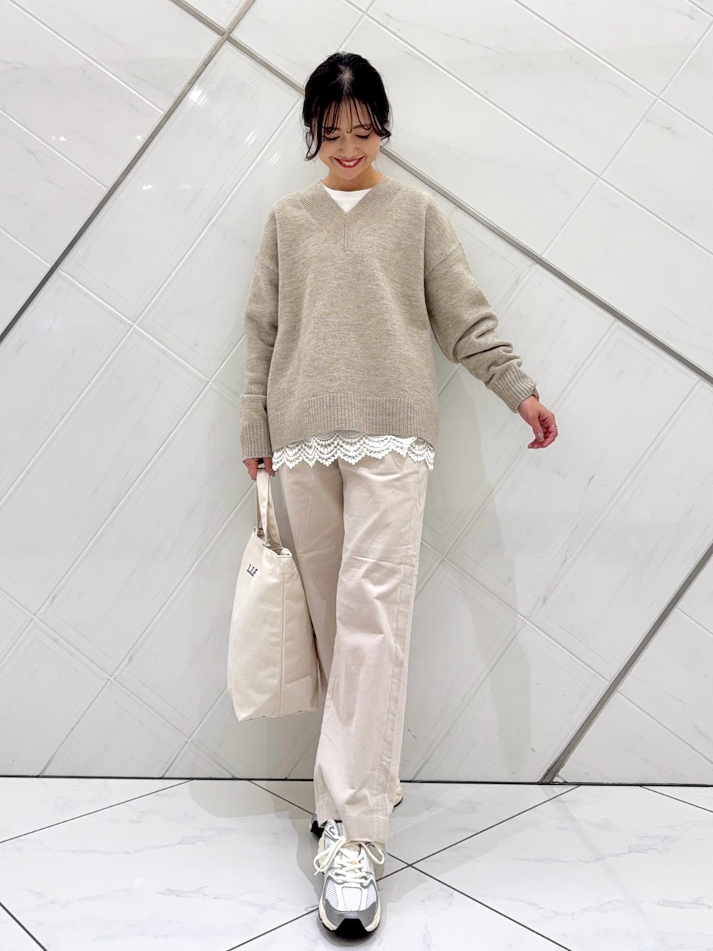 ニットは厚地でもちもちとした肌触りで着心地もよく、深過ぎないVネックです。
