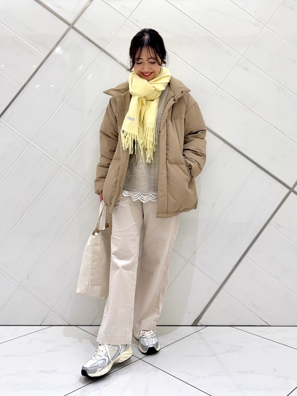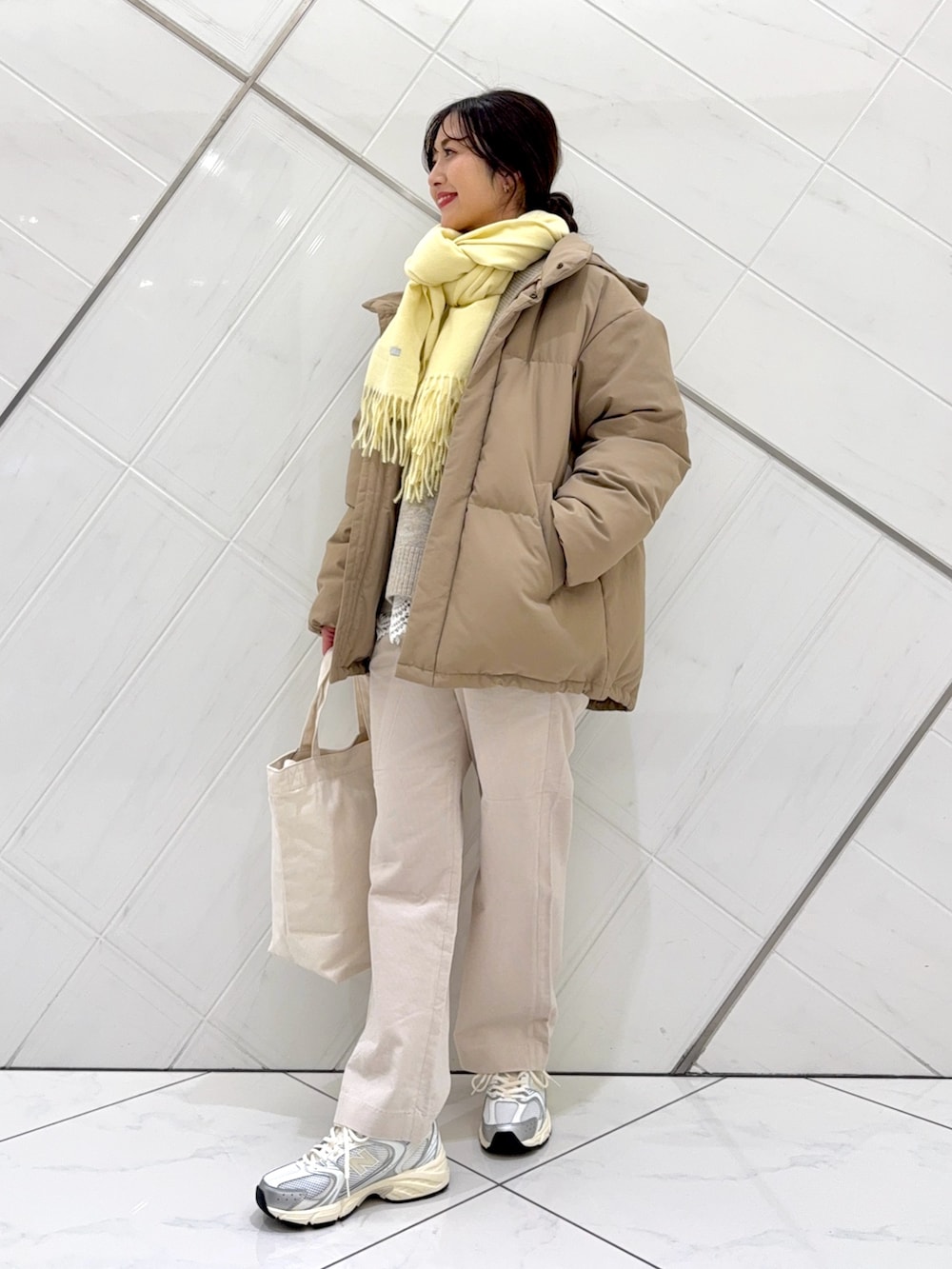 マフラーはSMELLYのアイテムでとても柔らかな肌触りなので首周りもチクチク感もなく、レモンイエローがコーディネートのアクセントになり、使いやすいです。