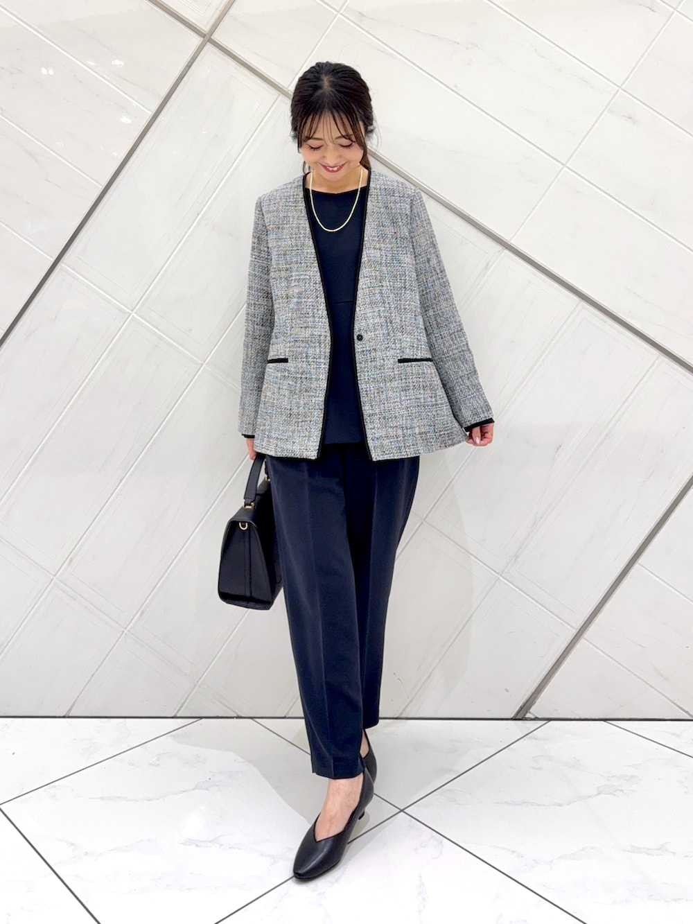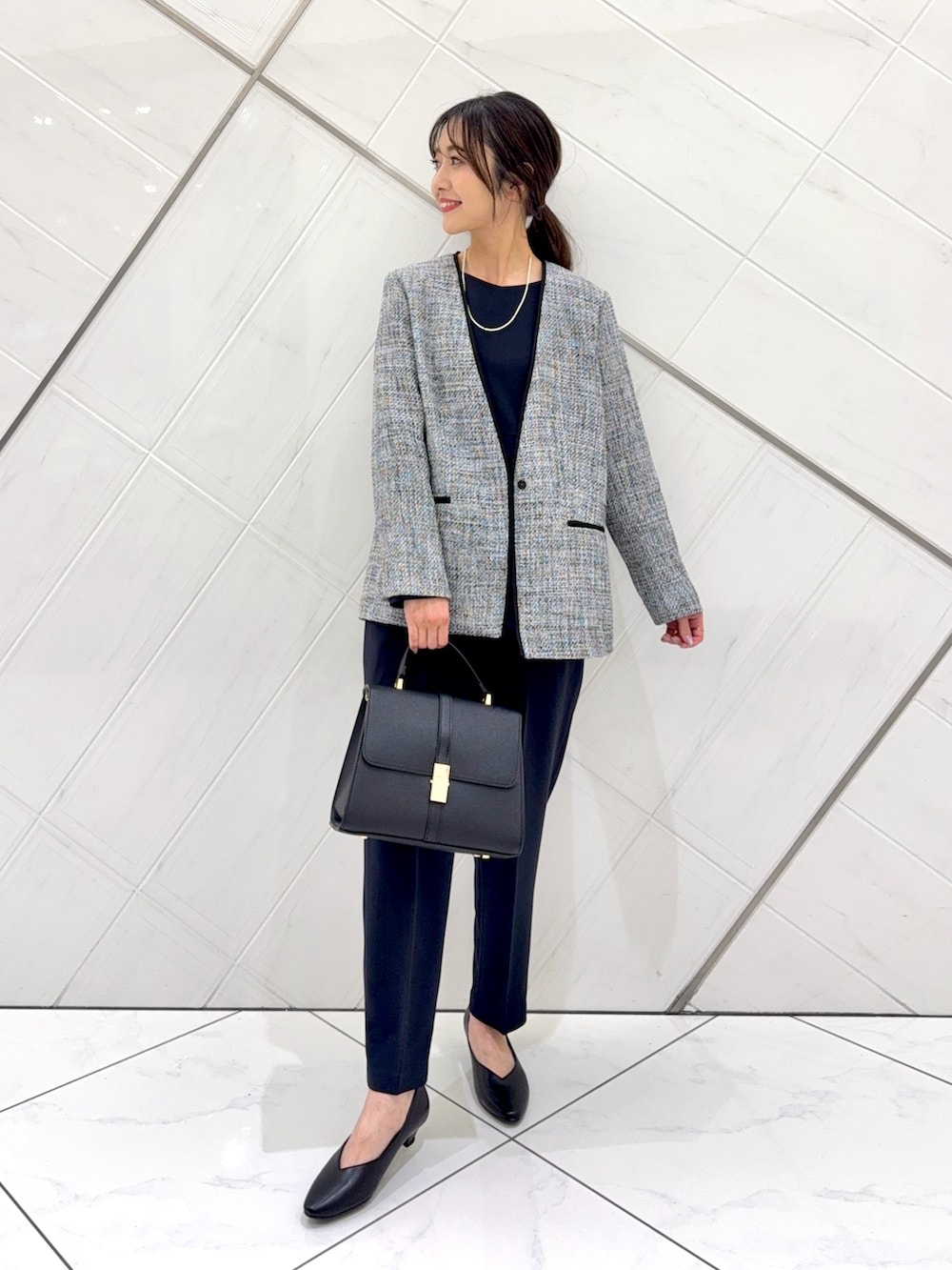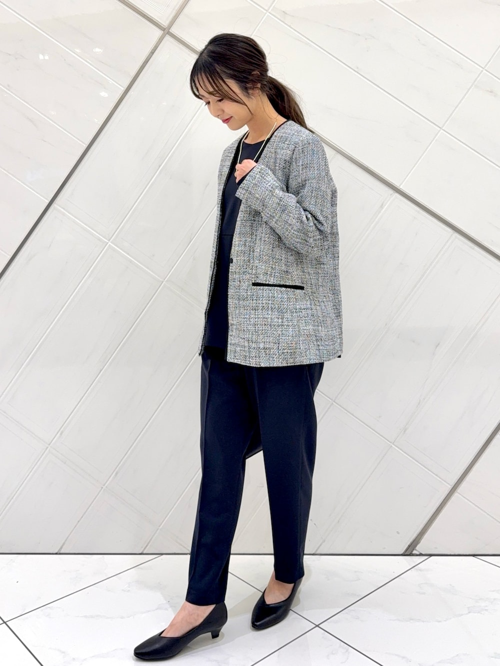 ジャケットはヒップが隠れるくらいの着丈でヒップもカバーできます。