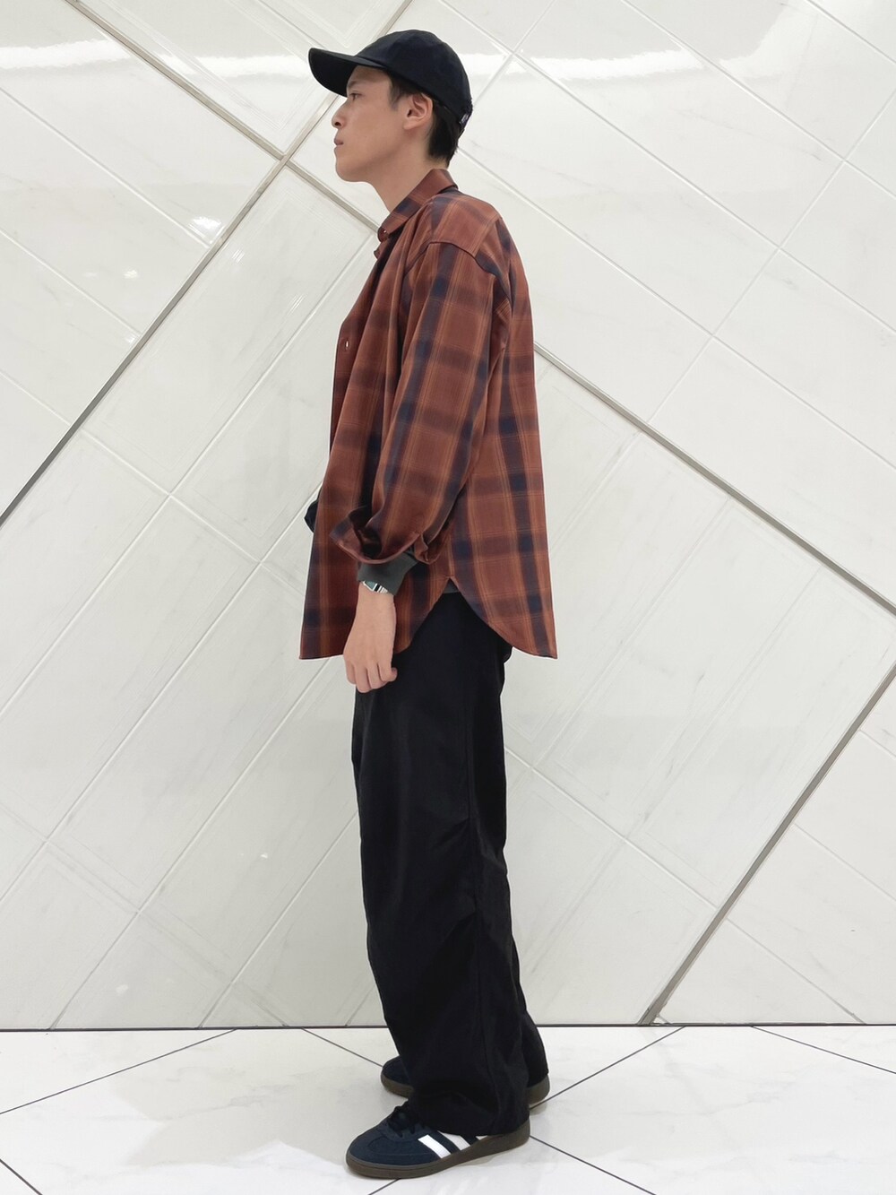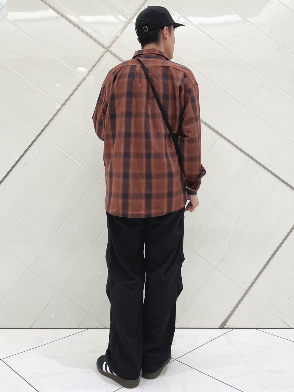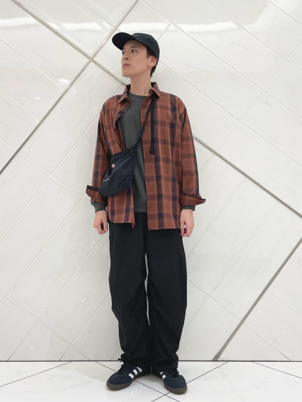ブラック中心のスタイルに、ブラウンのチェックシャツで秋っぽさを出しつつ、カジュアルダウンしたスタイリングです。