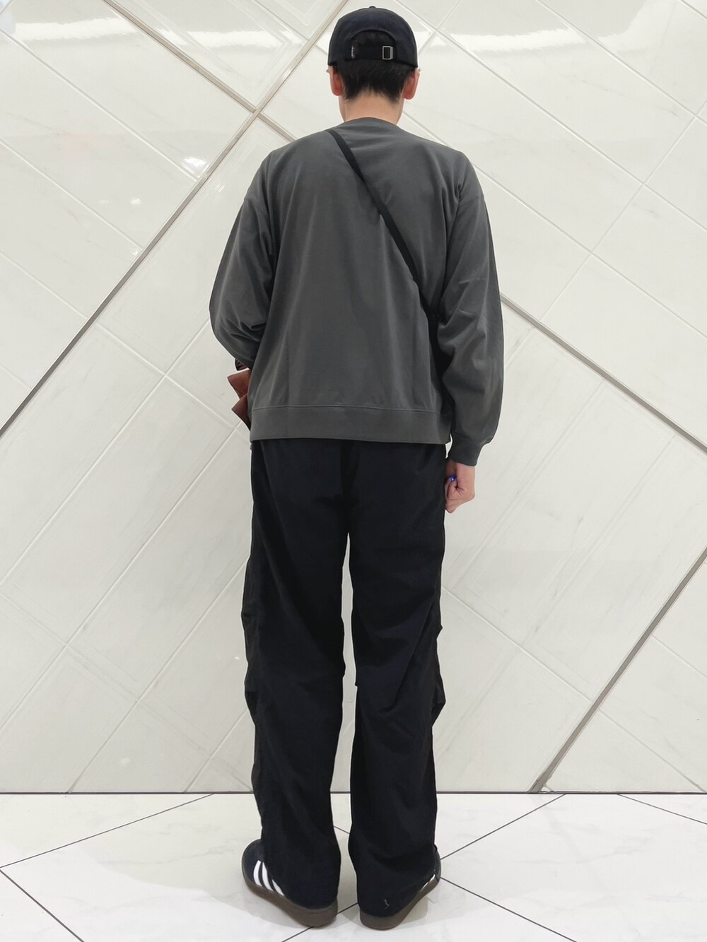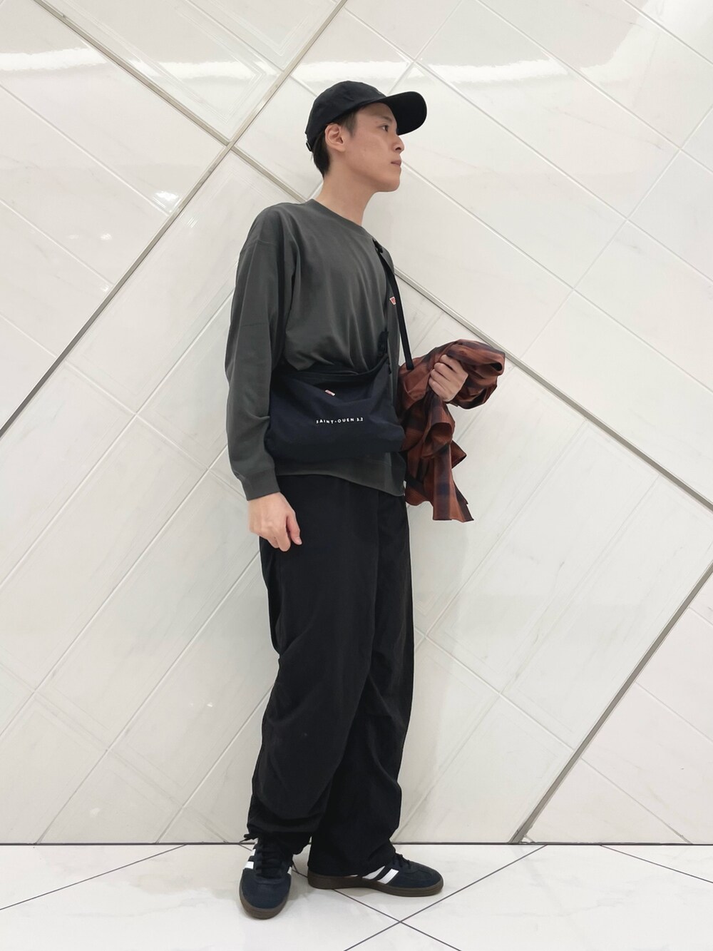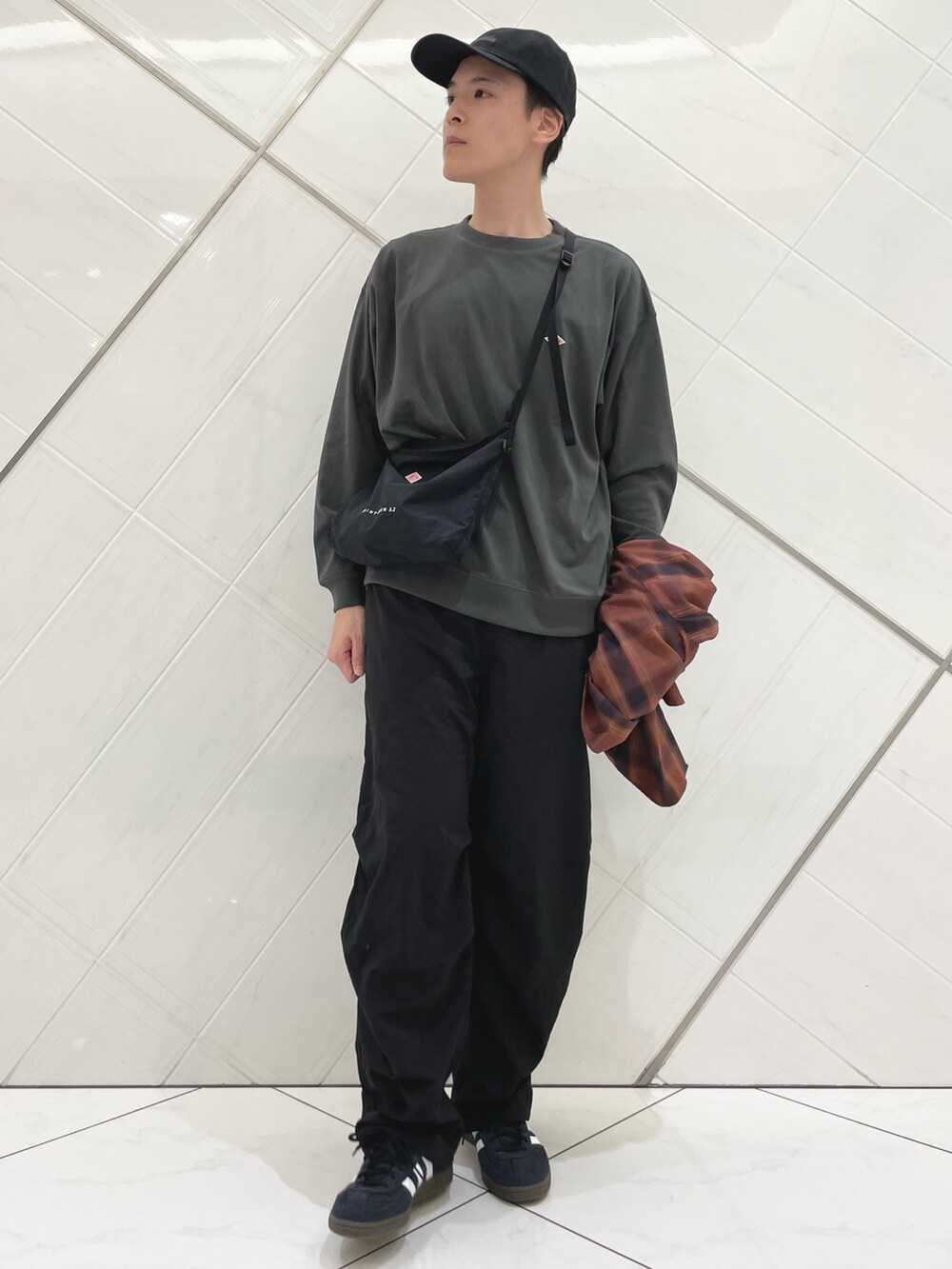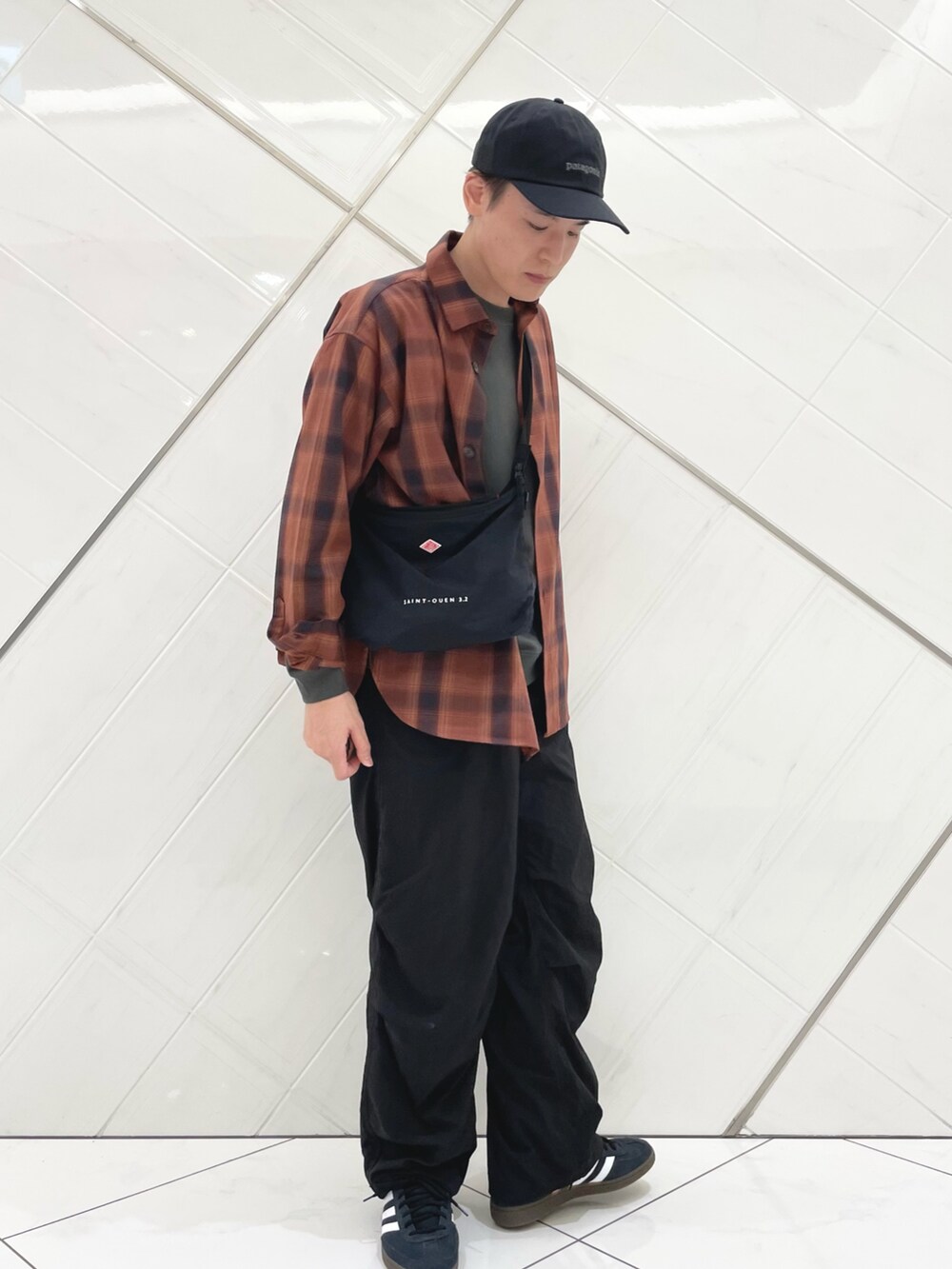 ブラック中心のスタイルに、ブラウンのチェックシャツで秋っぽさを出しつつ、カジュアルダウンしたスタイリングです。