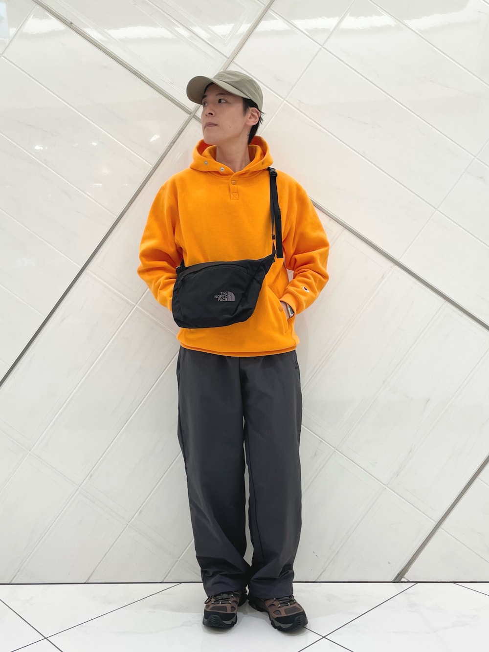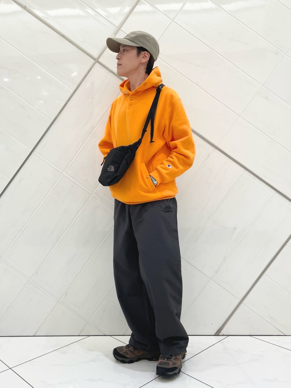 Champion × DOORS のスナップパーカーを着用したスタイリングです。
