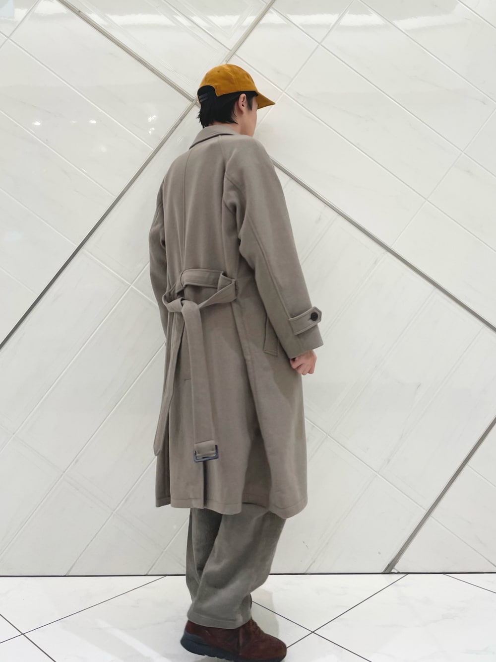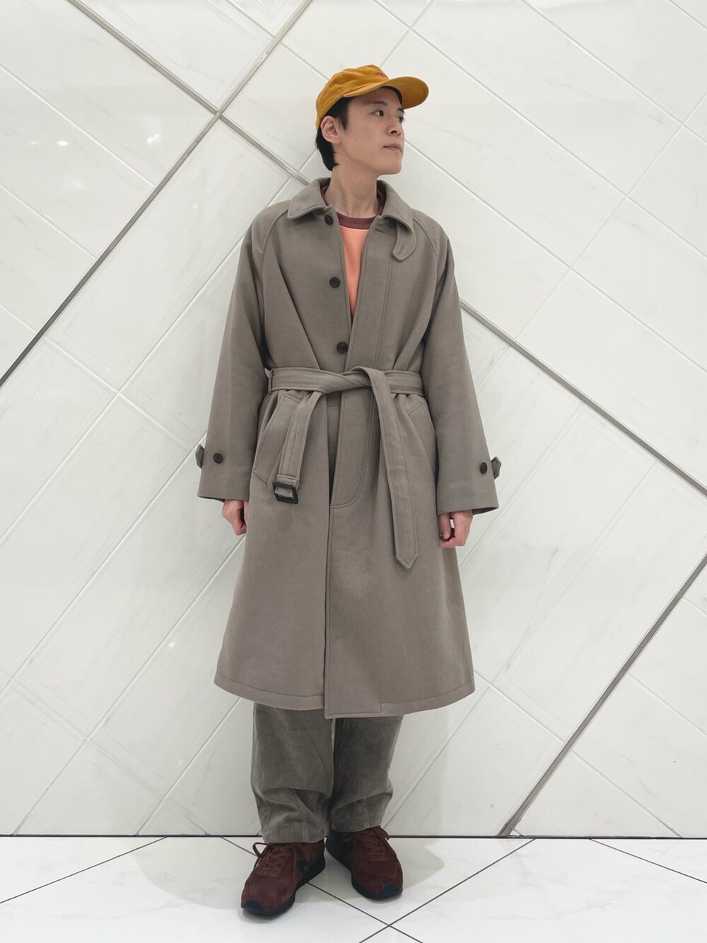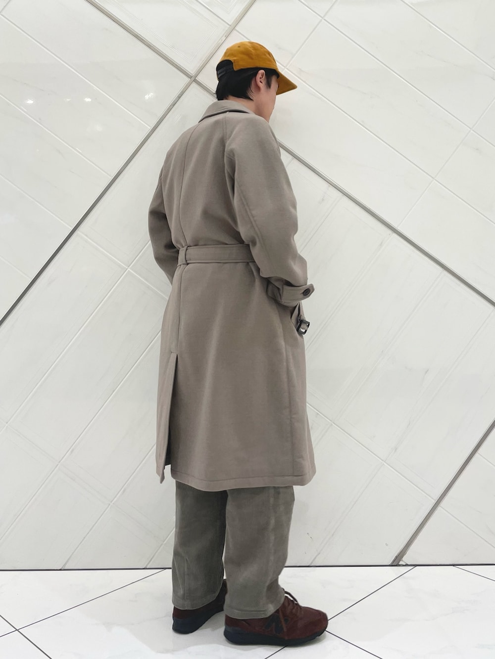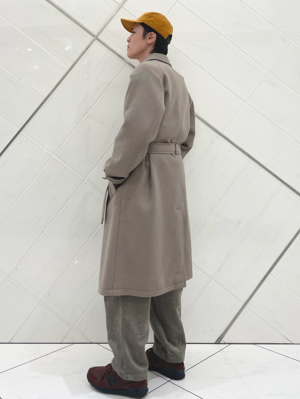 こちらのステンカラーコートはジャストサイズだとMサイズですが、今回はゆっくりめにLサイズの着用となります。ベルトデザインの為、シルエットの調整にも便利です。