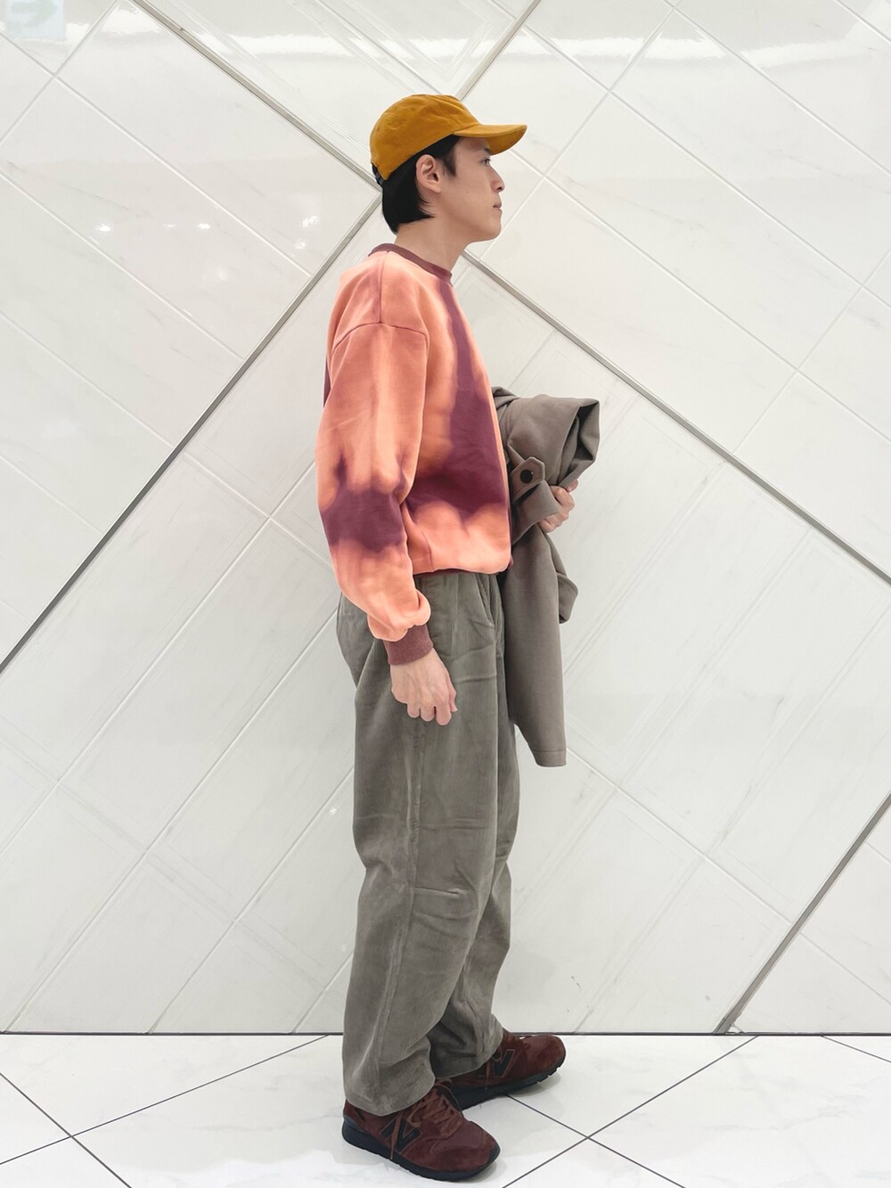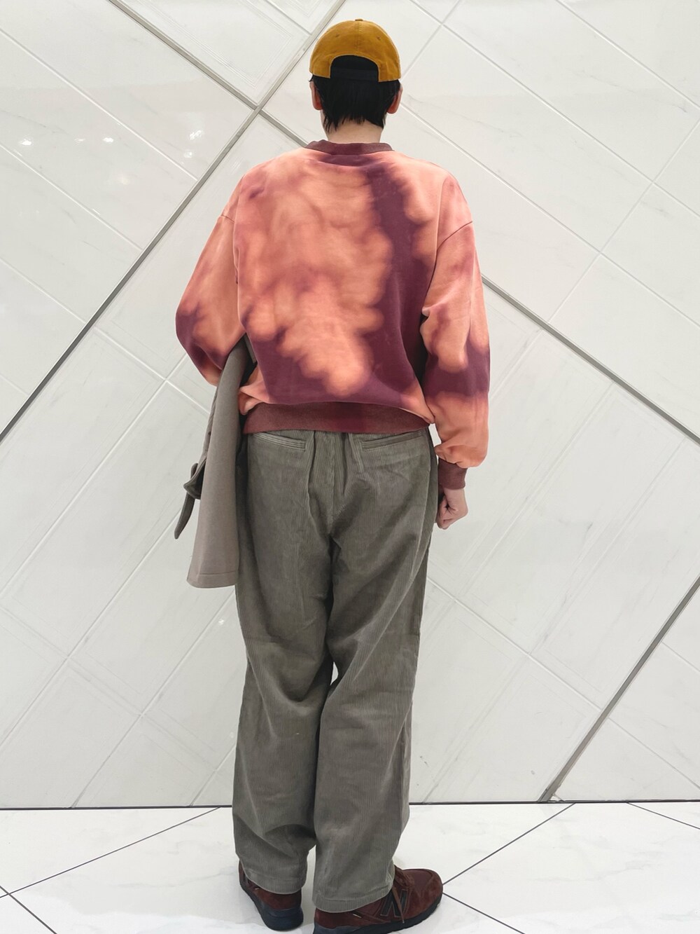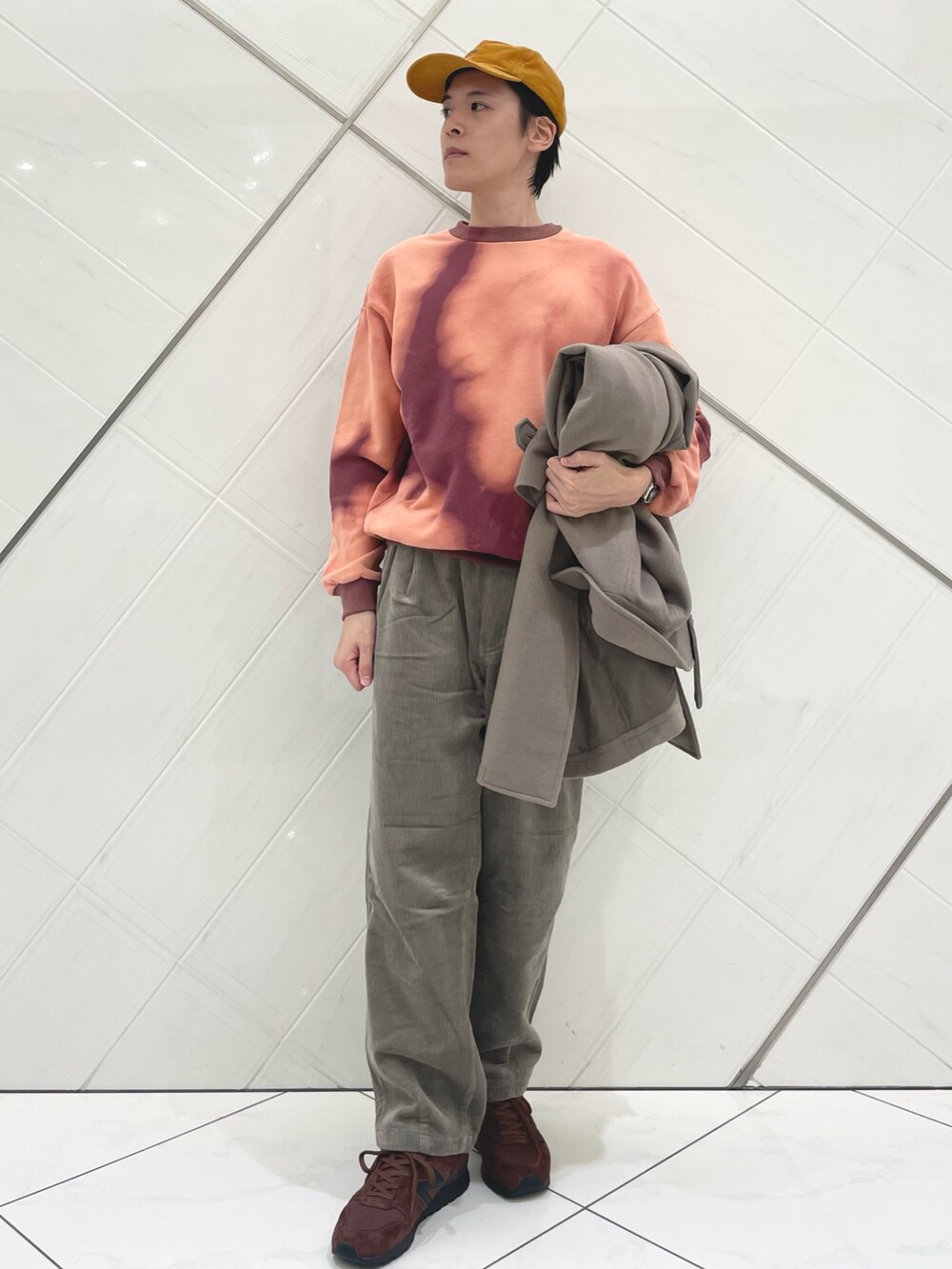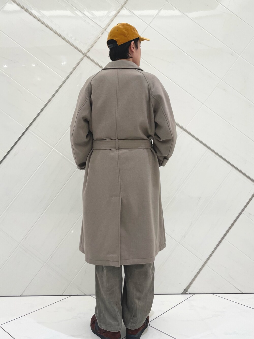 こちらのステンカラーコートはジャストサイズだとMサイズですが、今回はゆっくりめにLサイズの着用となります。ベルトデザインの為、シルエットの調整にも便利です。