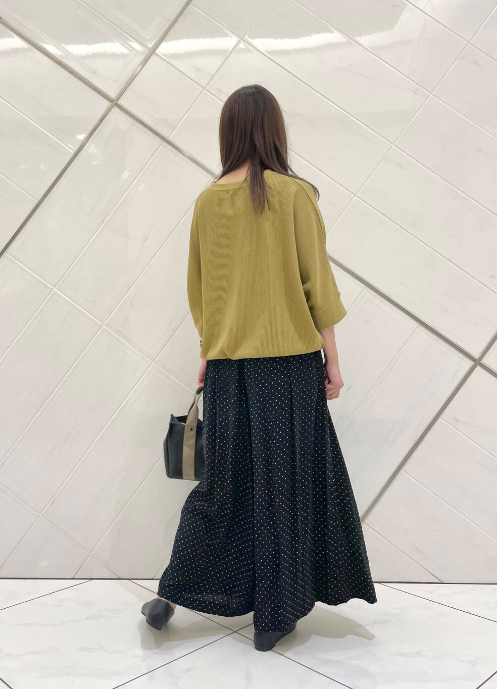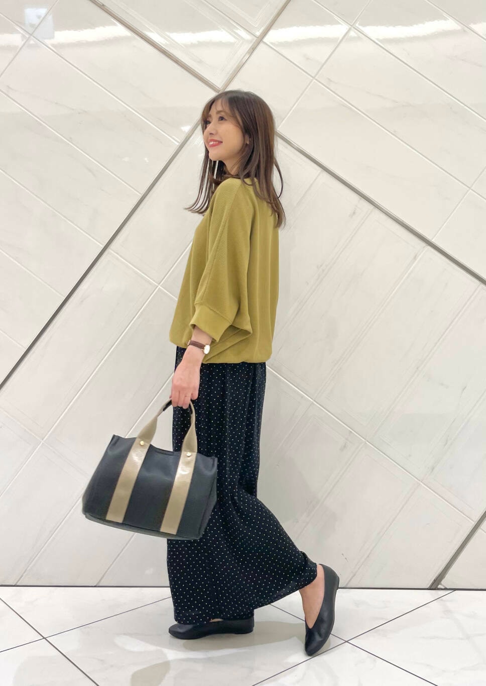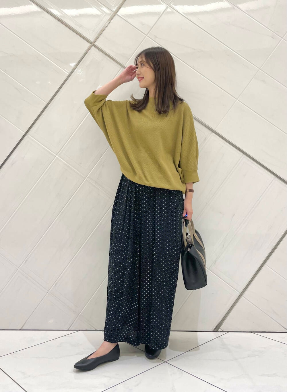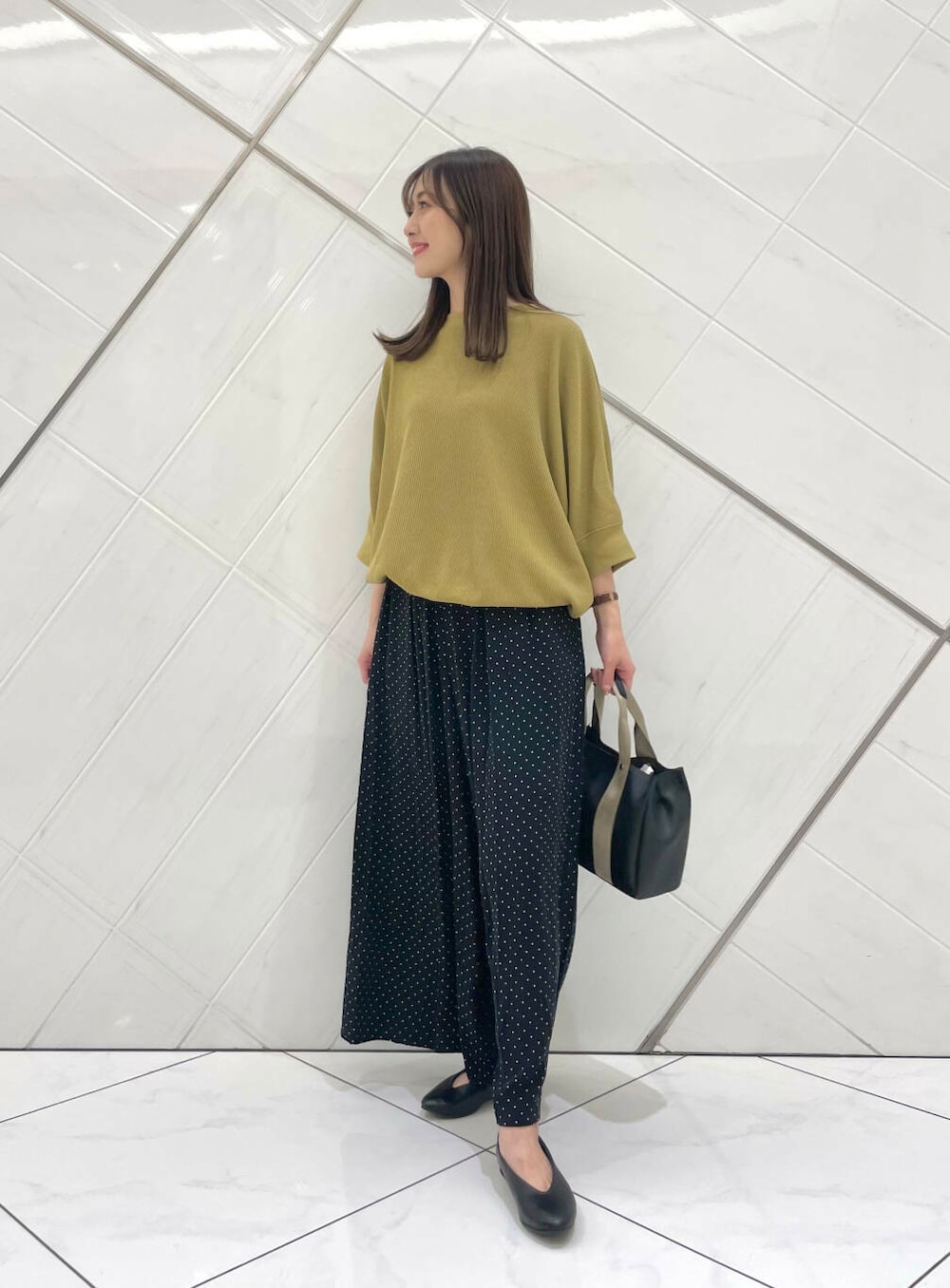 かぐれのドットパンツはてろっと落ち感のある生地で細かなドット柄なので甘くならず、程よいコーディネートのアクセントになってこちらも着回し力抜群です(^^)