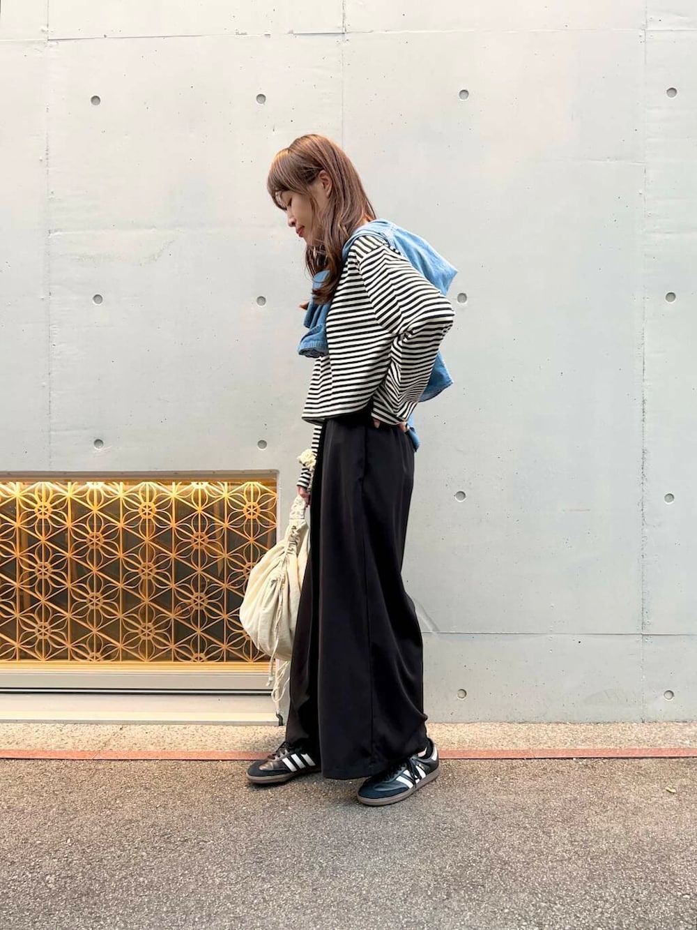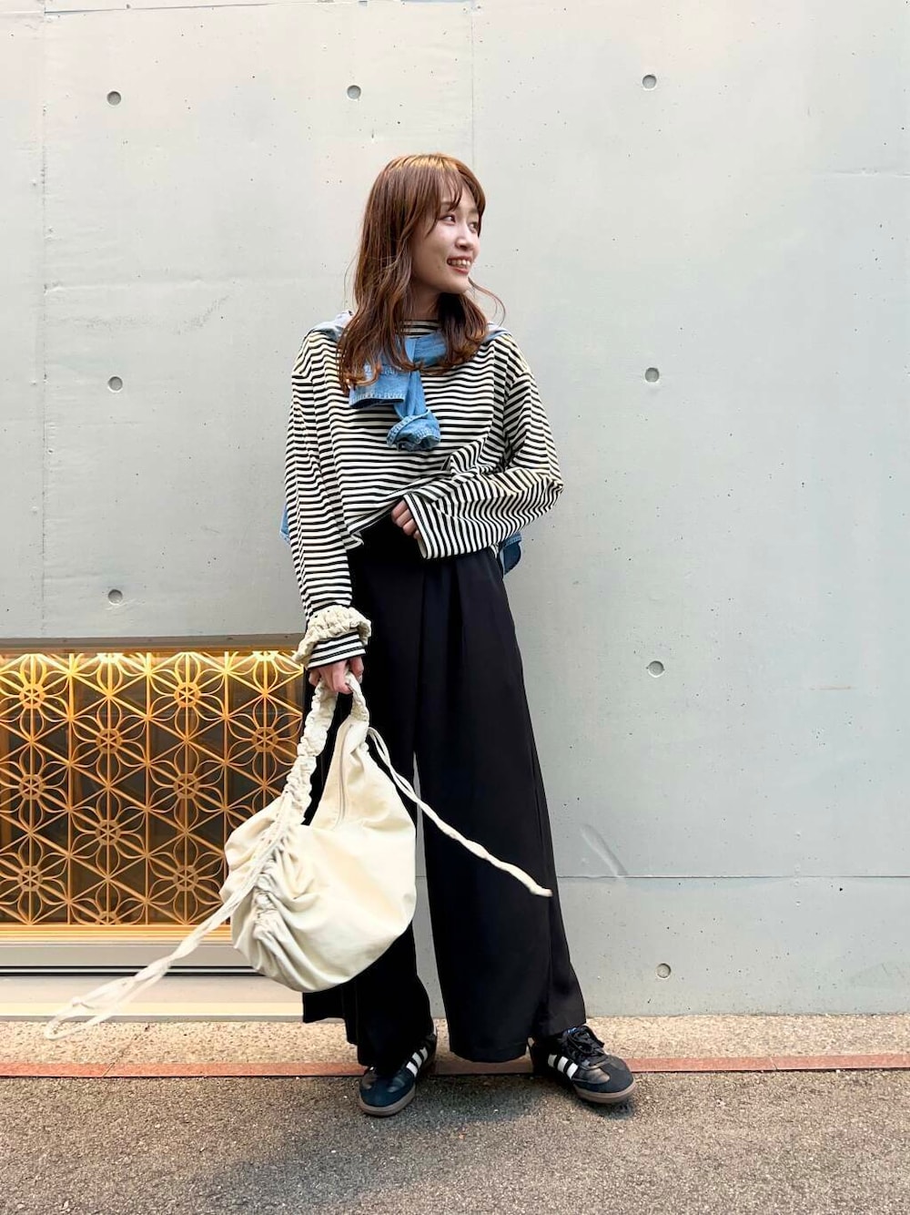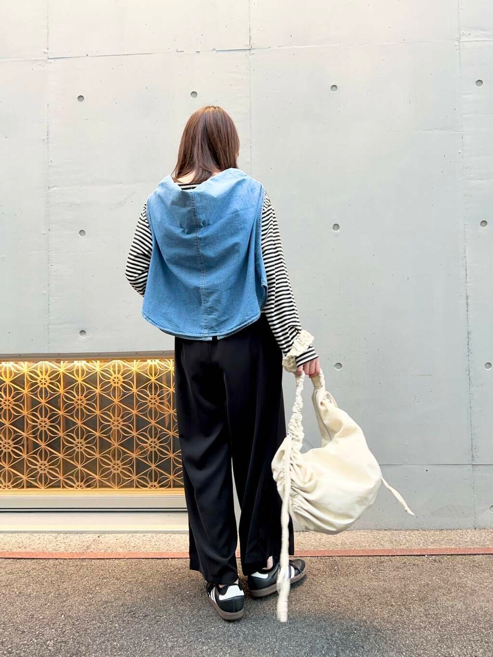 柔らかい生地のデニムシャツを肩掛けしてこなれ感