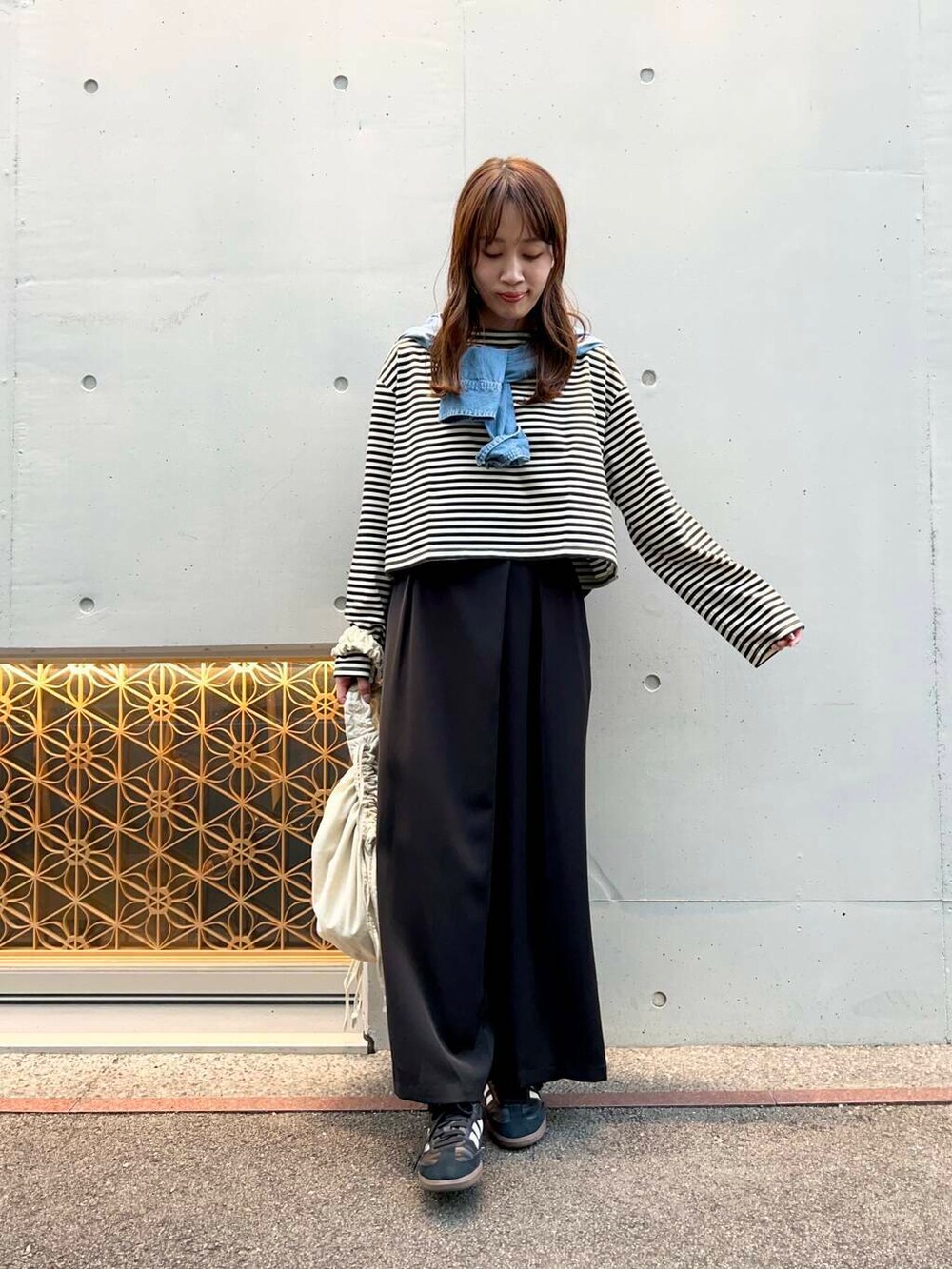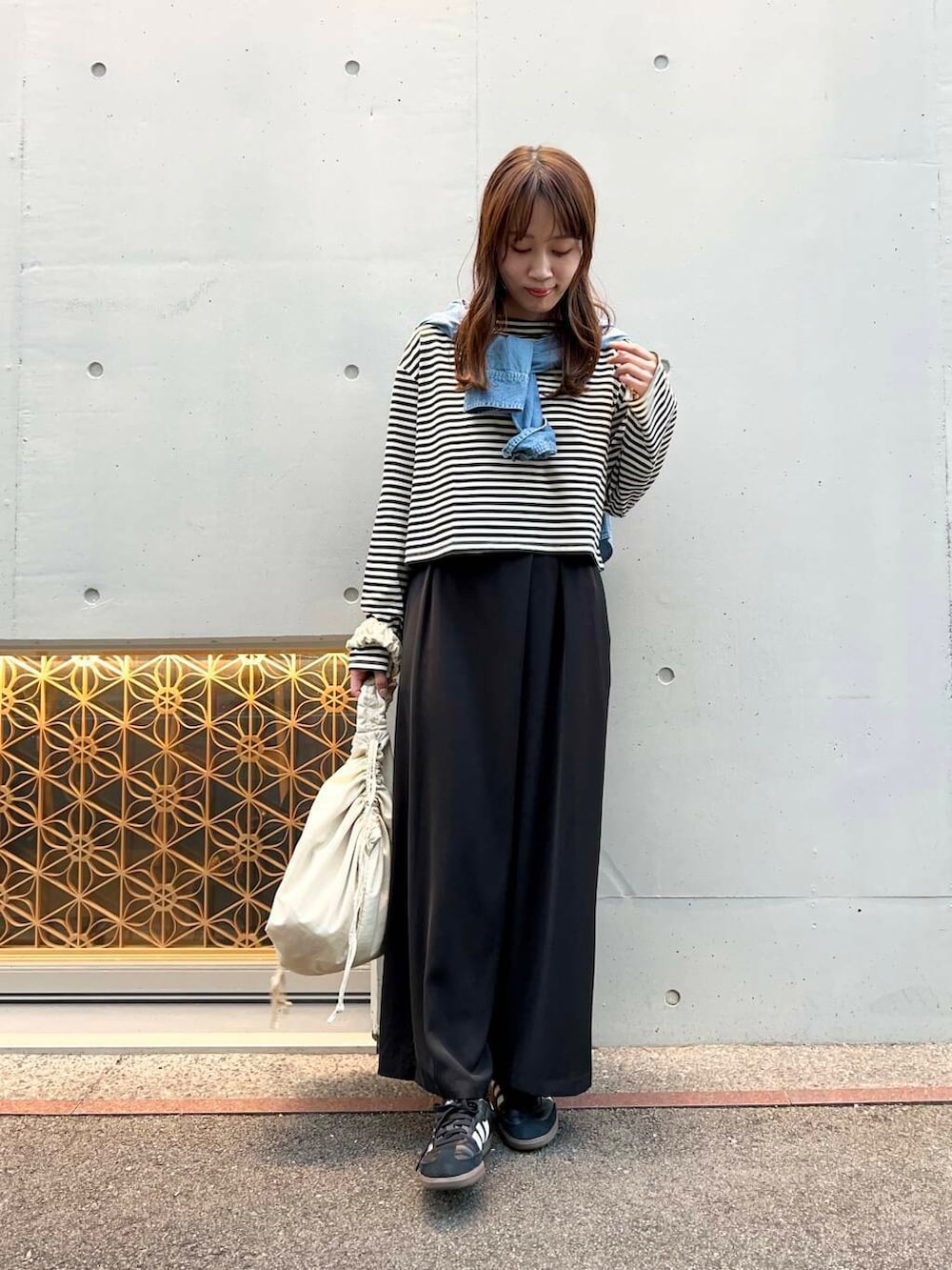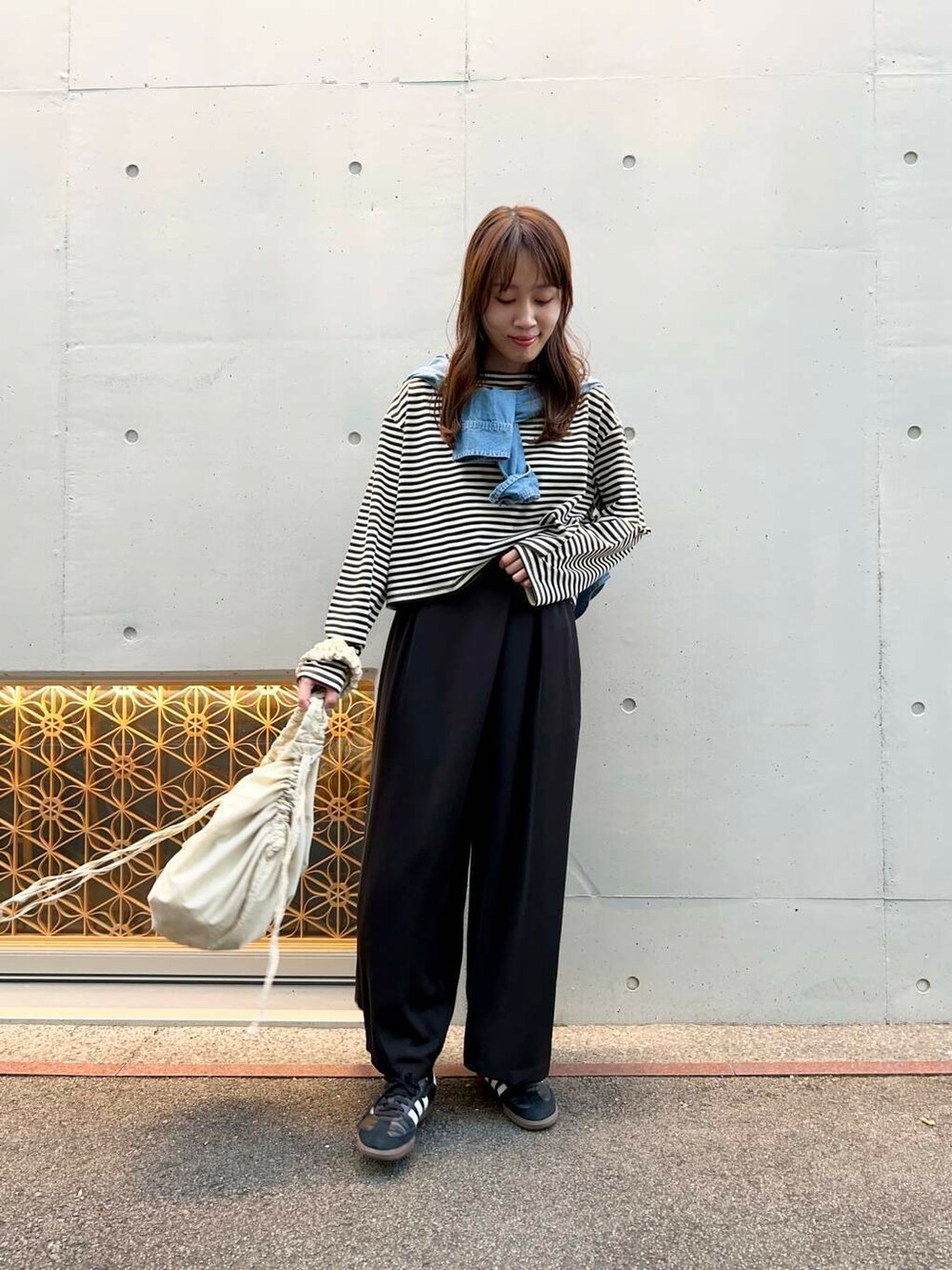 柔らかい生地のデニムシャツを肩掛けしてこなれ感