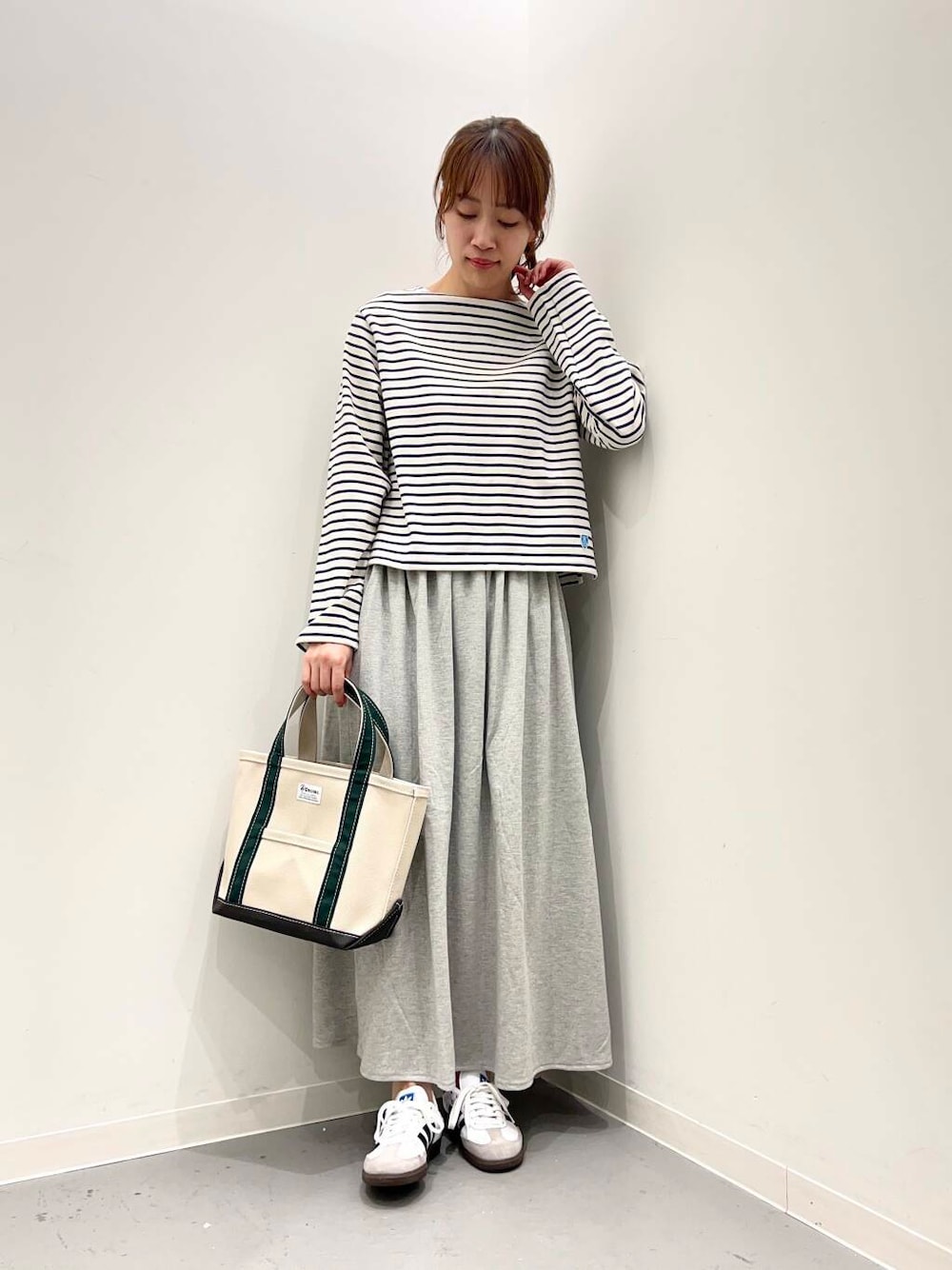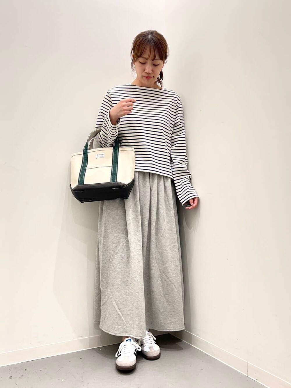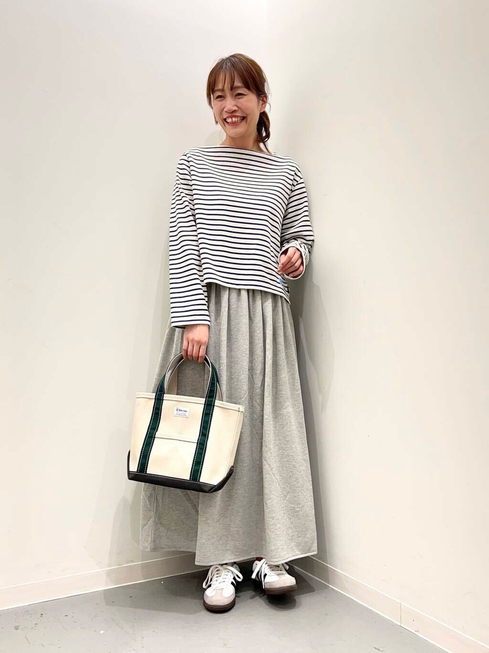 絶妙なトップスはボートネックの襟元がシンプルながら
