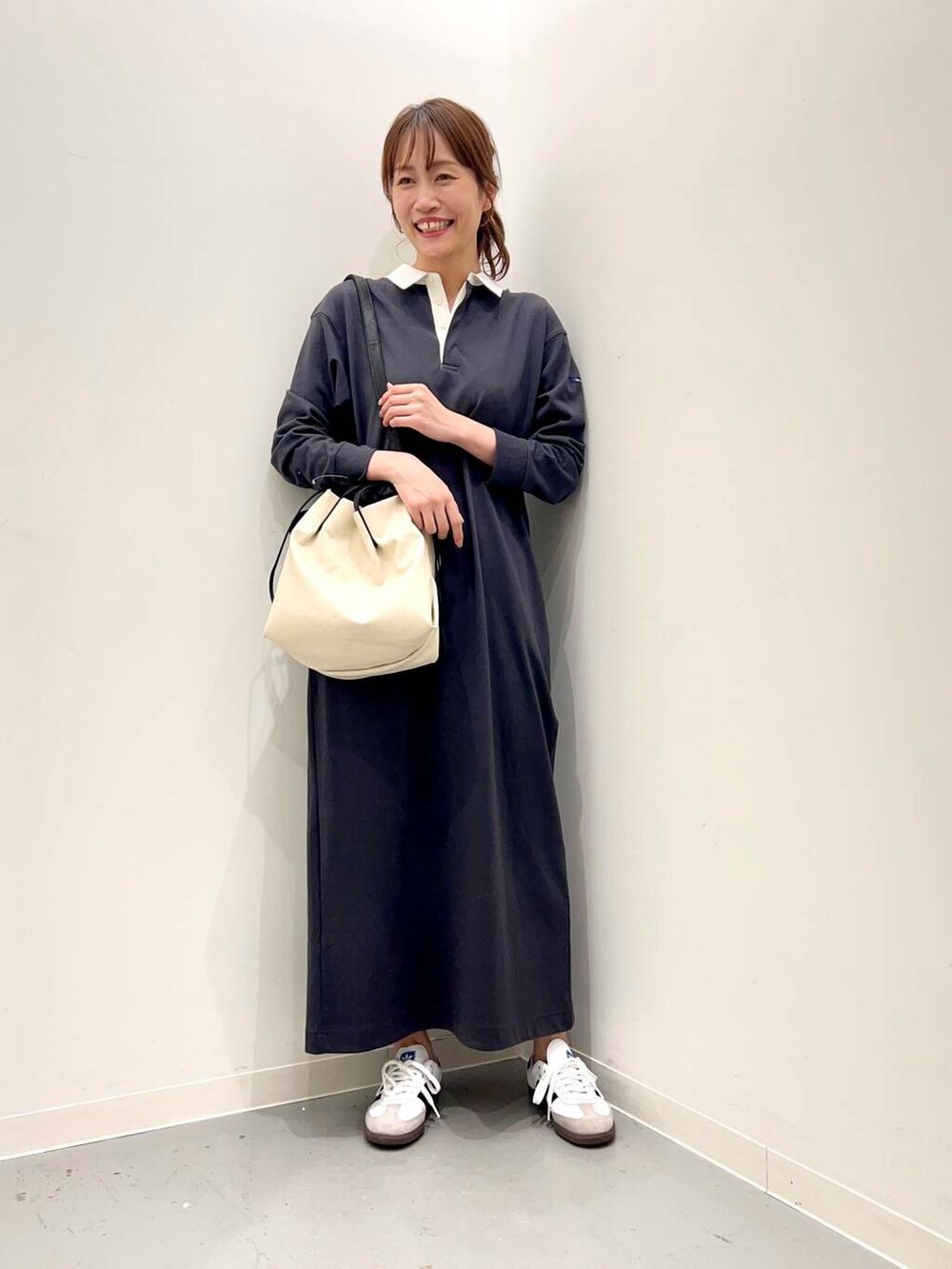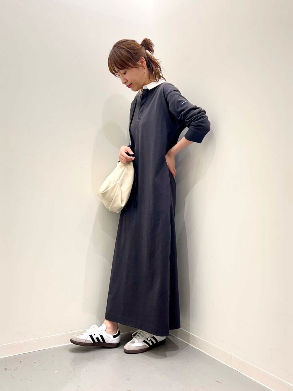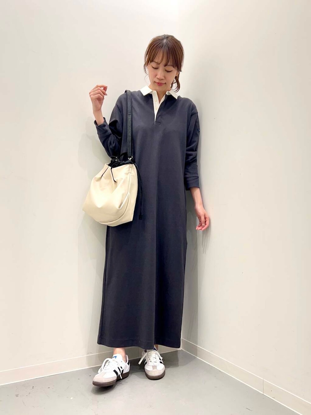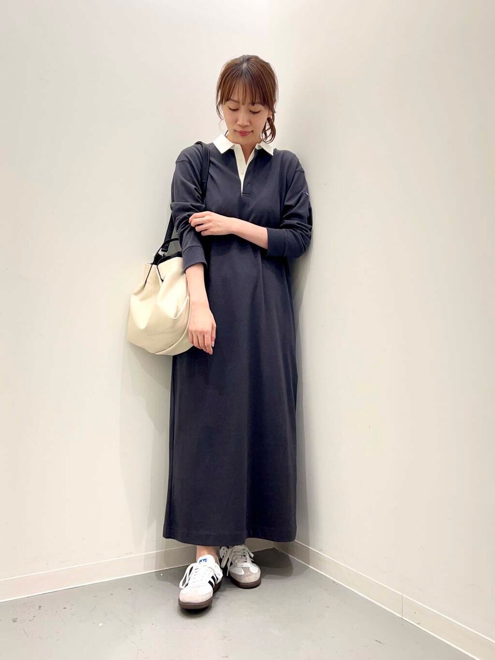 ラガーシャツデザインのワンピースはロング丈で