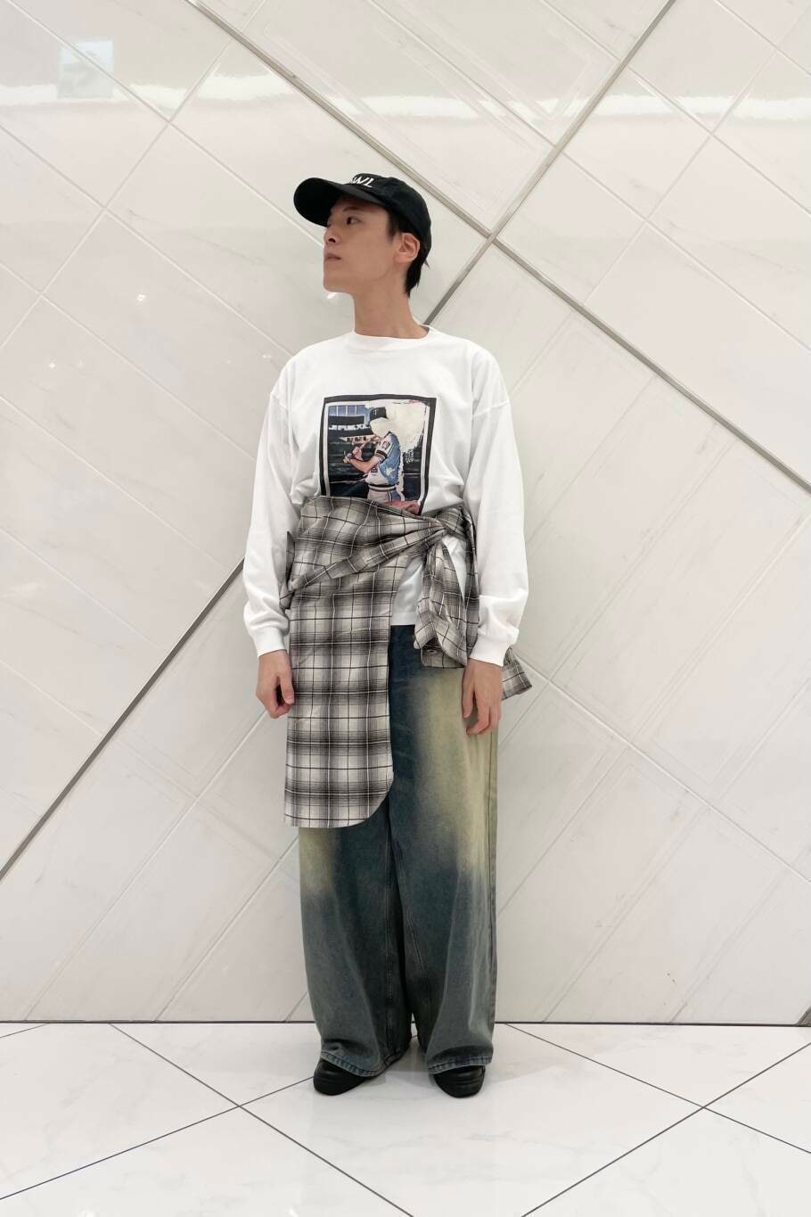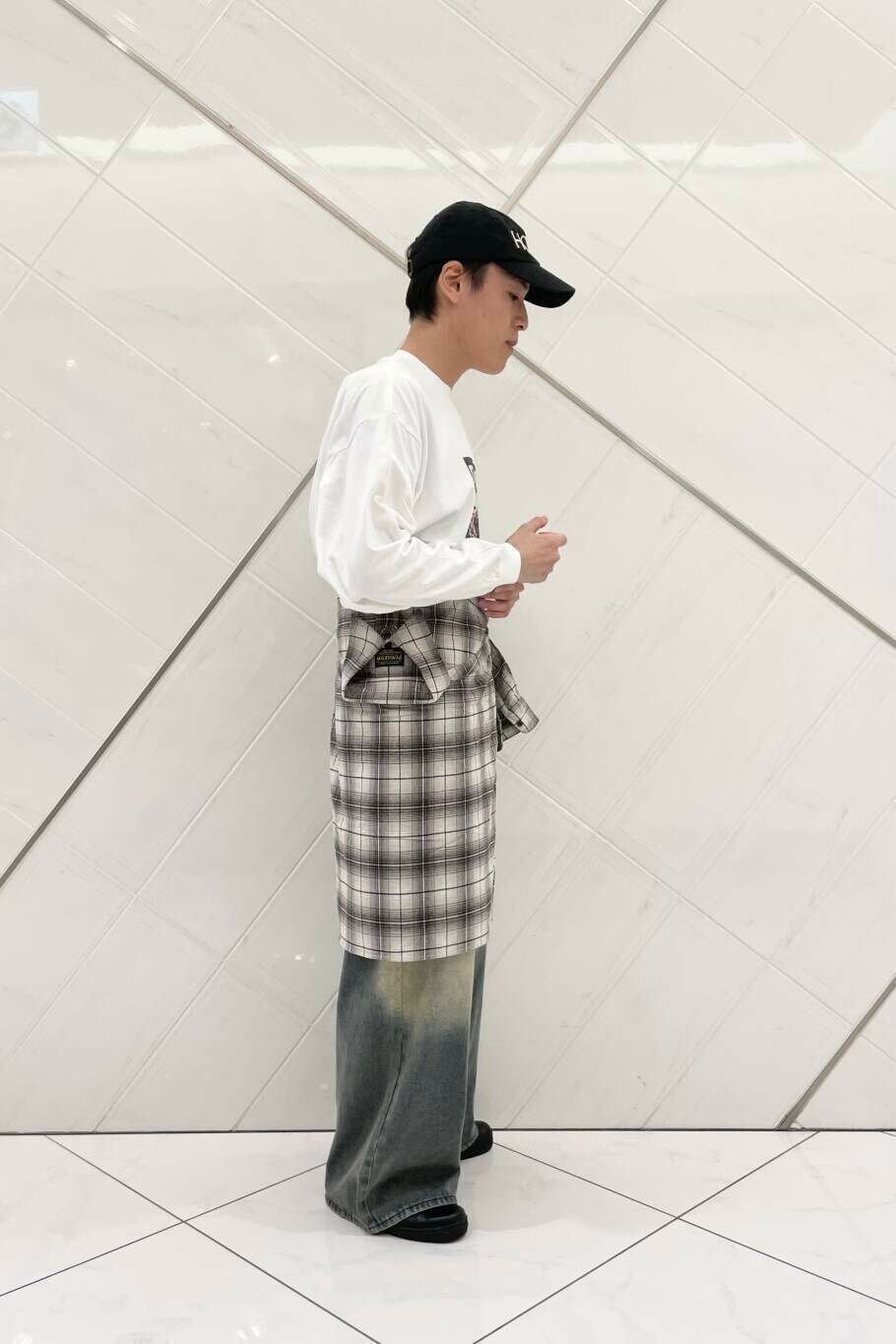パンツはワイドなややフレアを選び、シャツの腰巻きスタイルも、エプロンの様にずらして着用する事で、トレンド感のあるスタイルを意識しました。