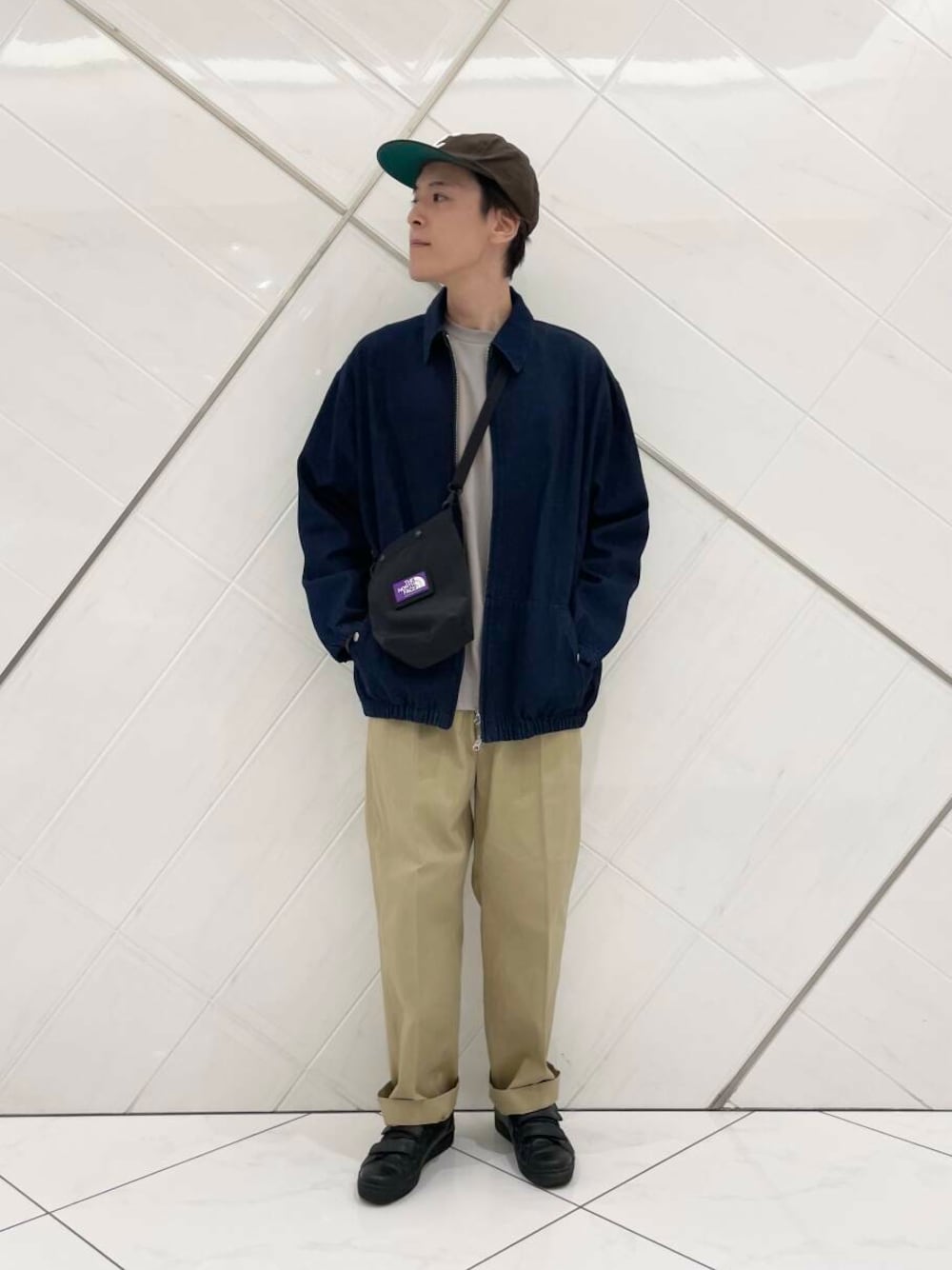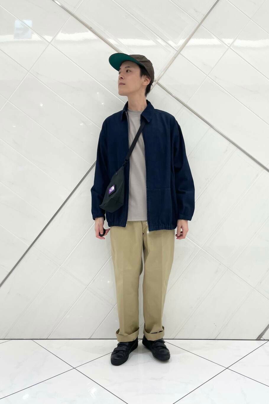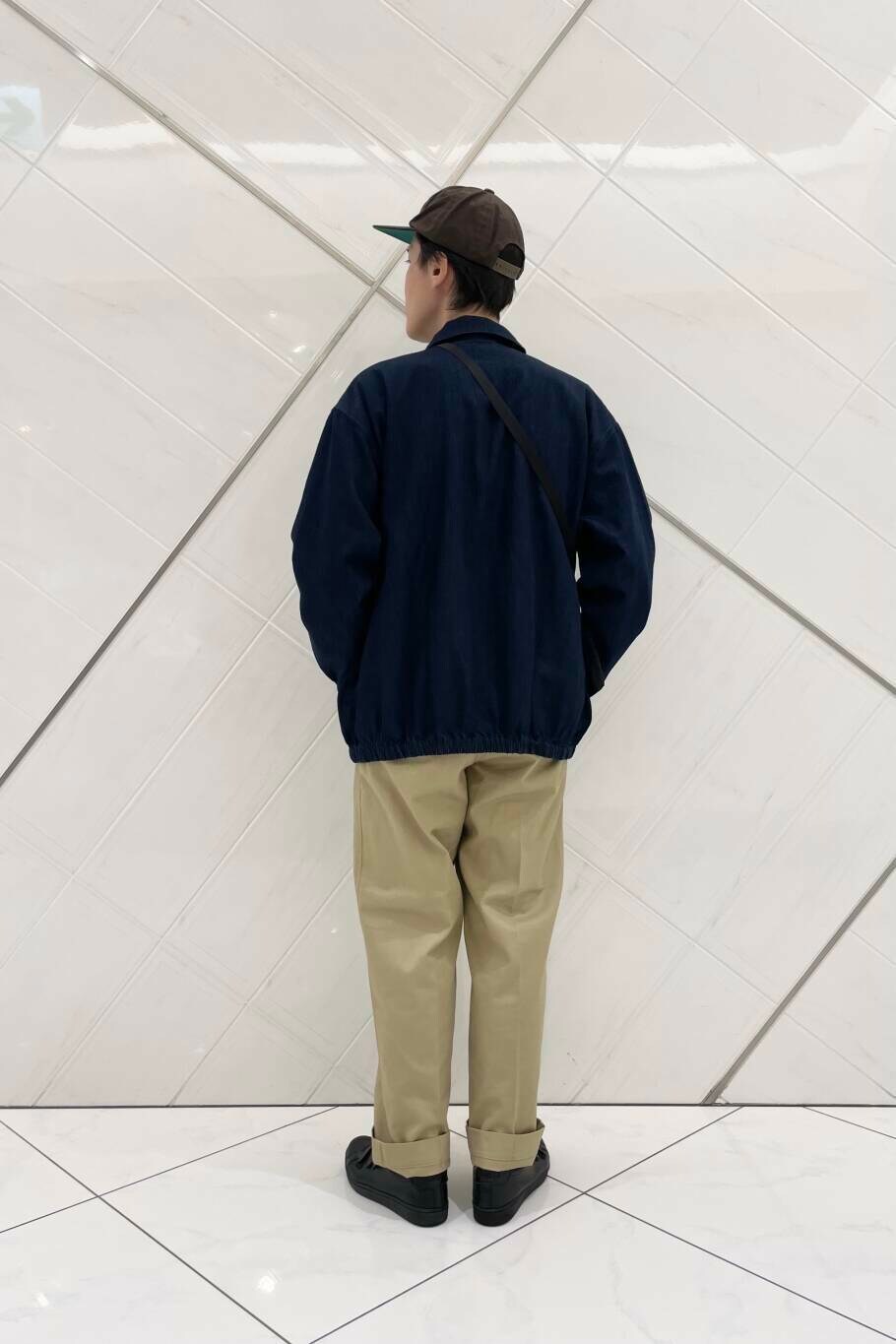 DOORS の Grow Organic プロジェクトのアイテム、Denim Zip Blouson を着用したカジュアルスタイルです。