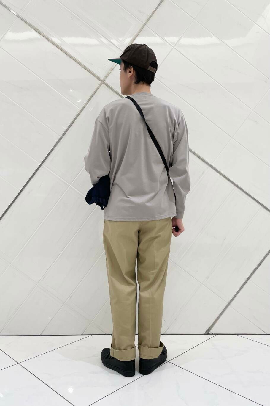 インナーとパンツを秋らしいベージュカラーで統一し、反対色になるデニムのインディゴカラーが主役になるスタイリングです。