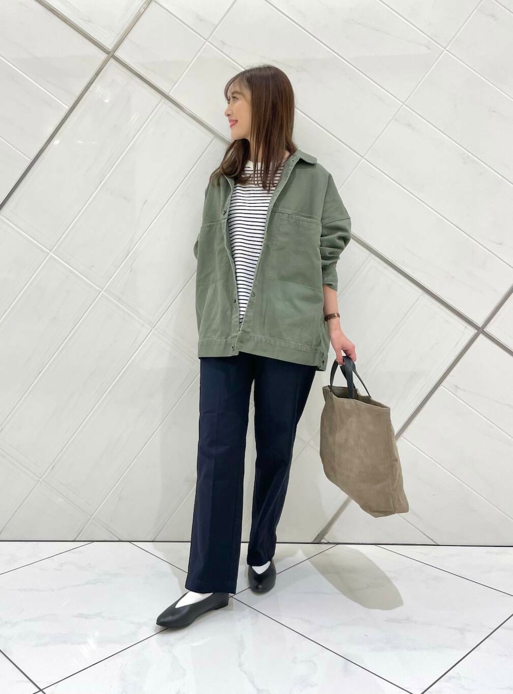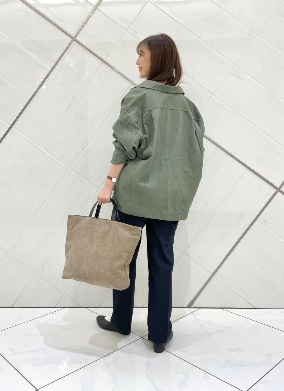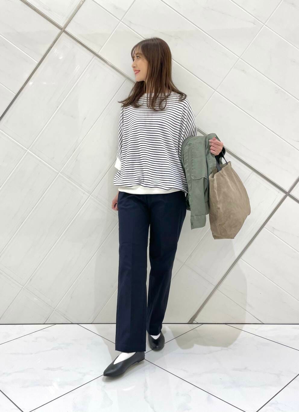アウターは私も持っているアイテムで、ゆったりめのサイズ感でドルマンスリーブになっているのでボリュームのある袖のトップスの上からでも重ねやすく、季節の変わり目に重宝するアイテムです。