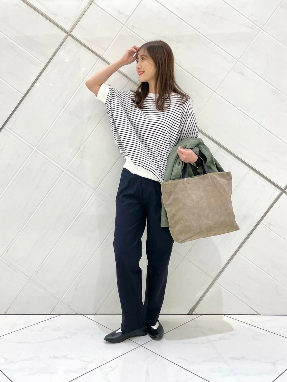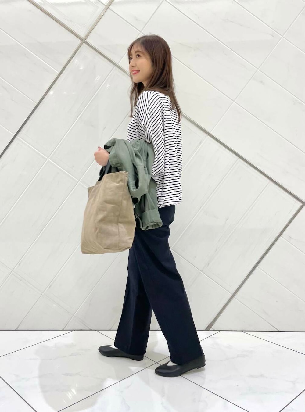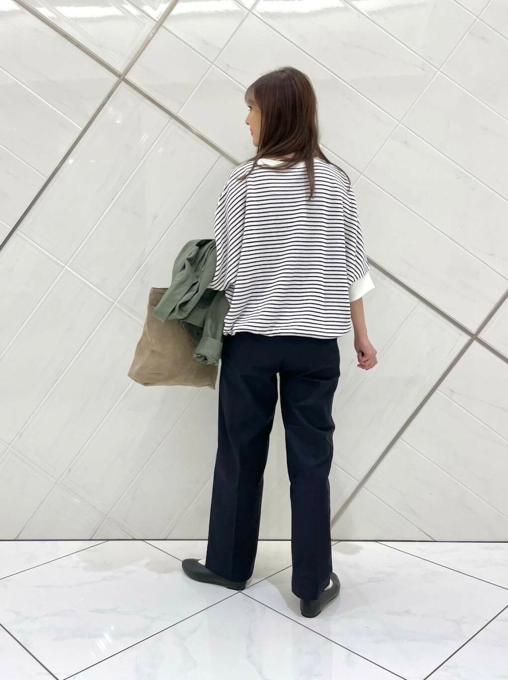 アウターは私も持っているアイテムで、ゆったりめのサイズ感でドルマンスリーブになっているのでボリュームのある袖のトップスの上からでも重ねやすく、季節の変わり目に重宝するアイテムです。