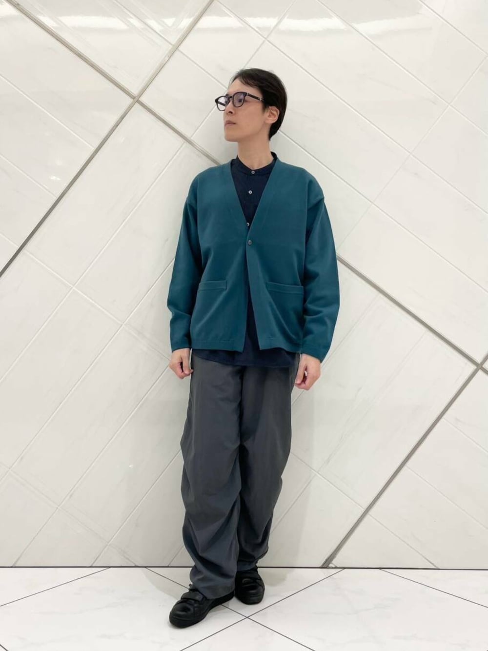 DOORS の URTECH 200日ニット 1ツ釦カーディガンを着用した、秋の大人カジュアルのスタイリングです。