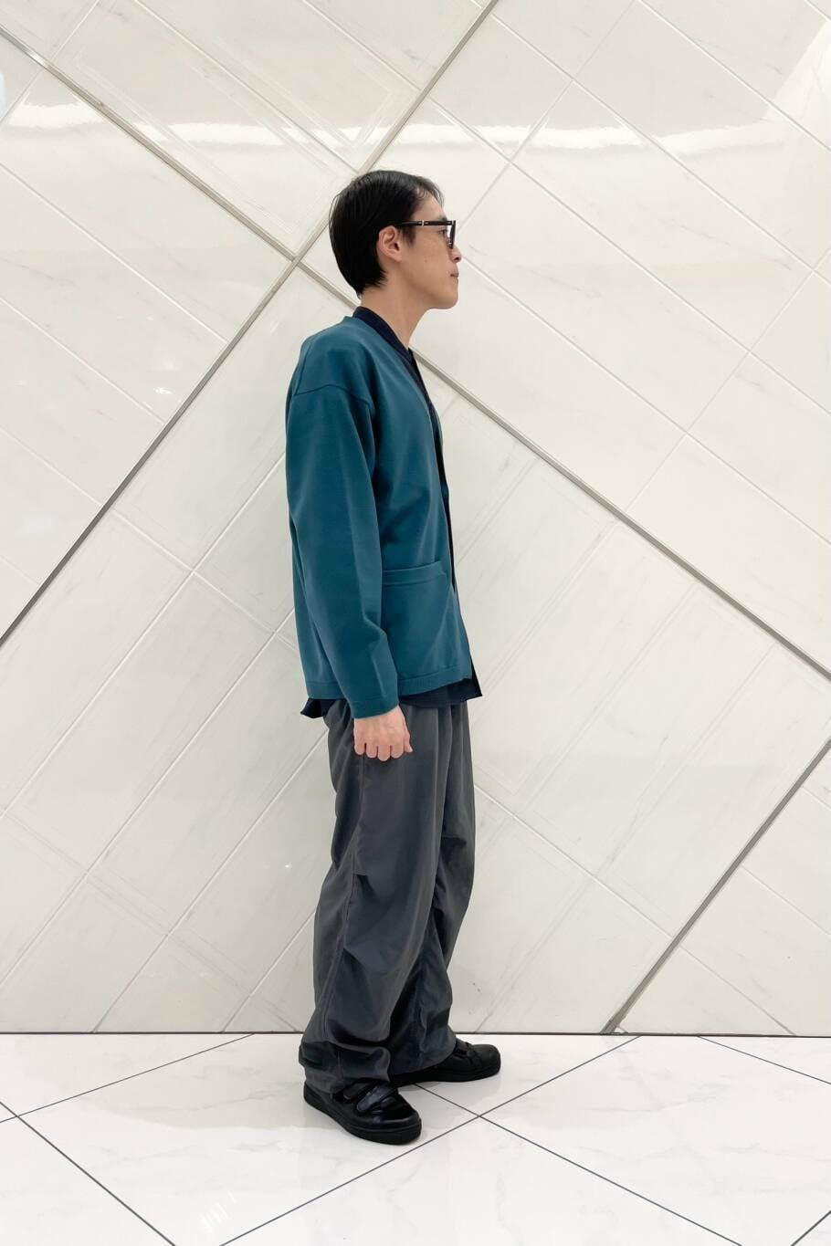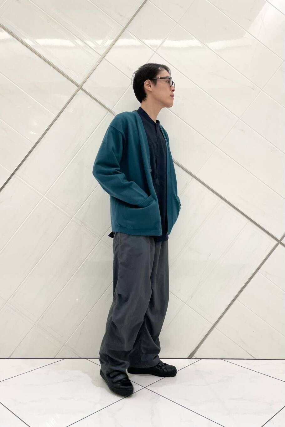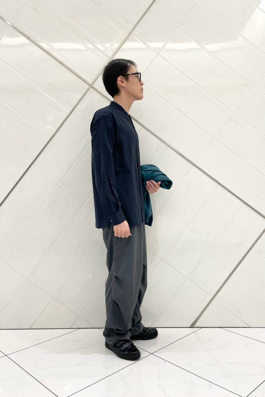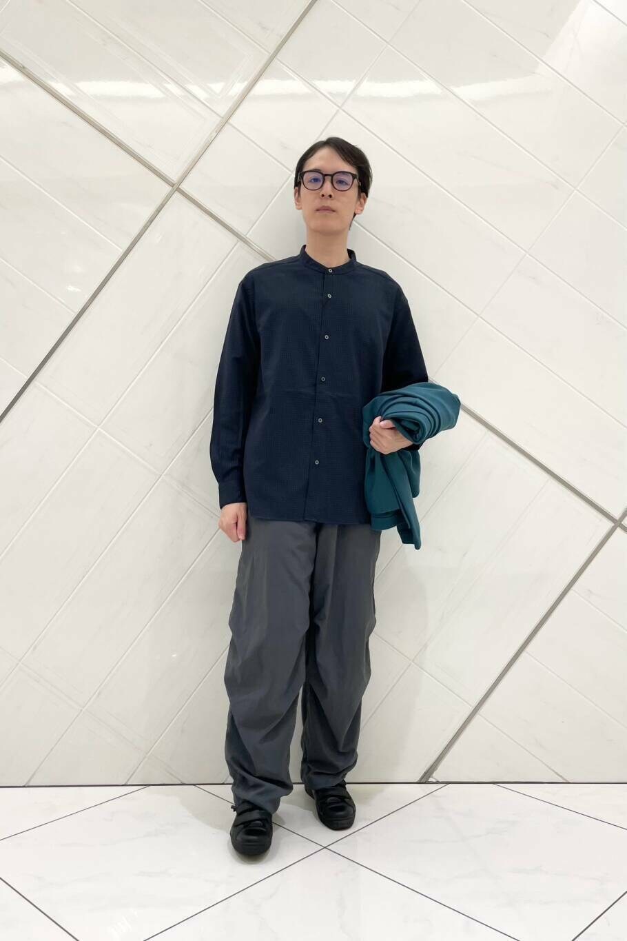 パンツは落ち着いた色味のナイロンパンツを持ってくる事で雰囲気を壊さずにカジュアルな要素をプラスしました。
