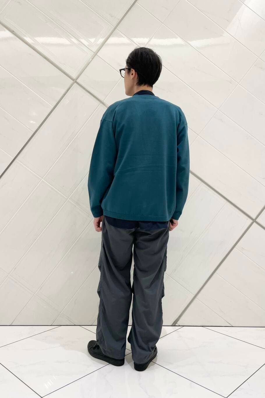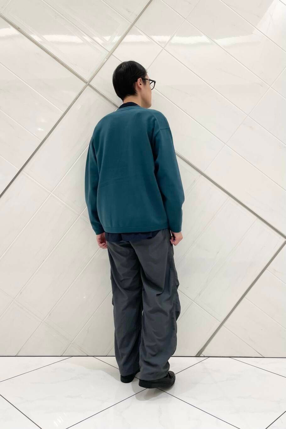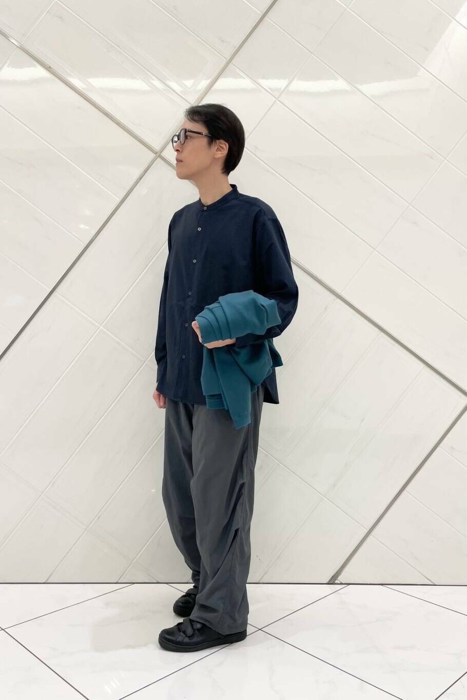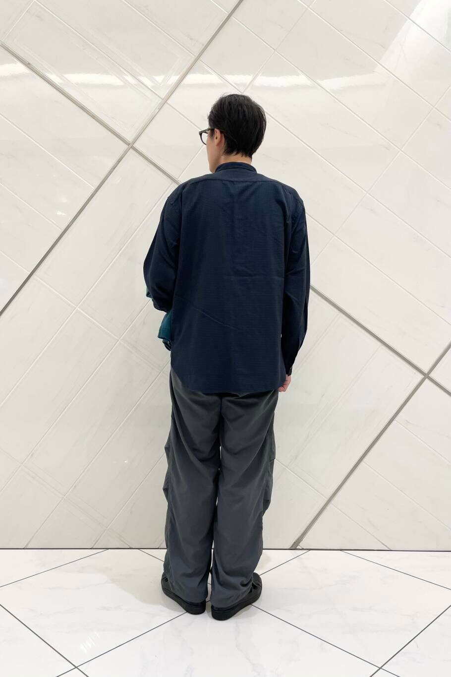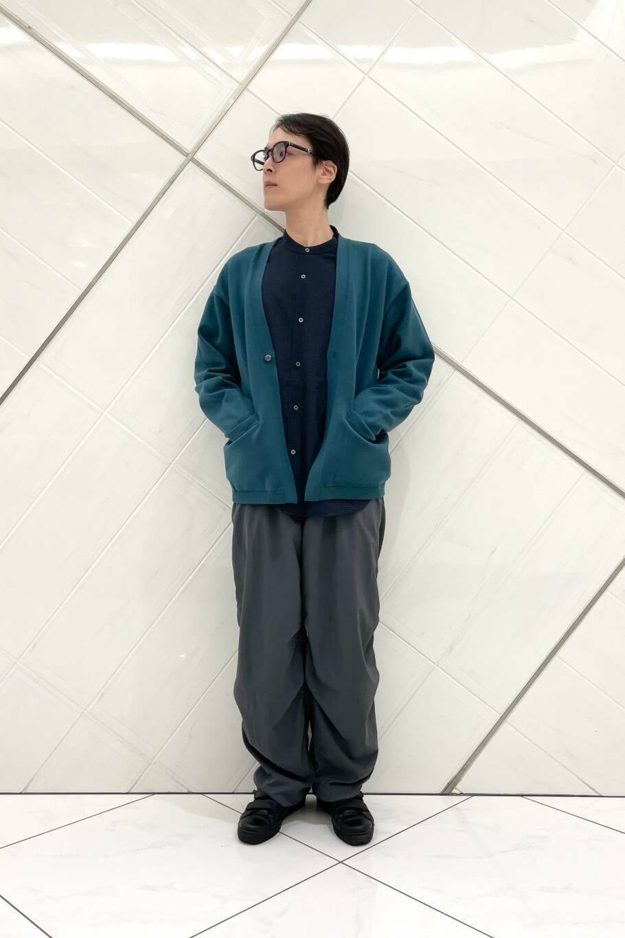 パンツは落ち着いた色味のナイロンパンツを持ってくる事で雰囲気を壊さずにカジュアルな要素をプラスしました。