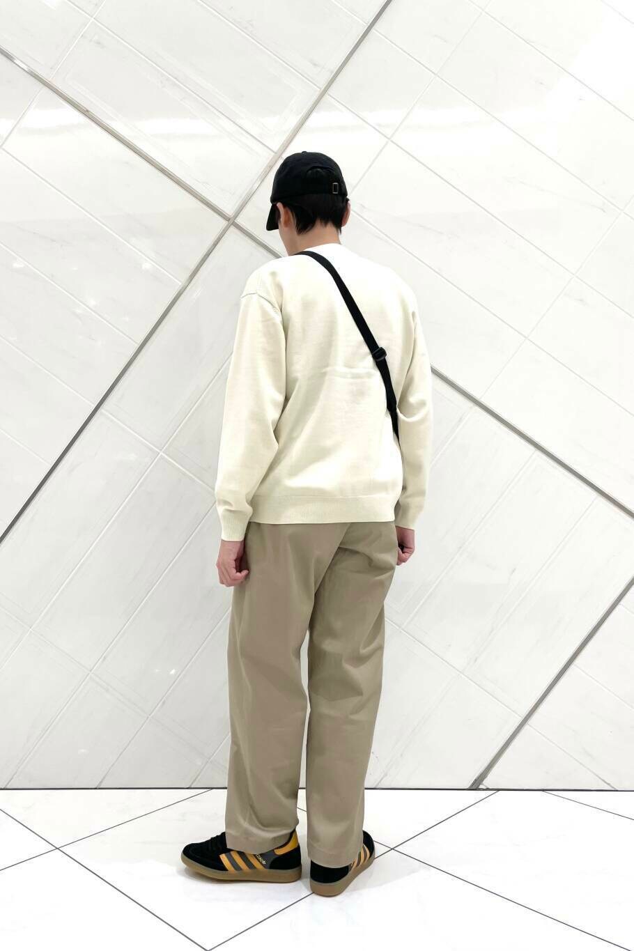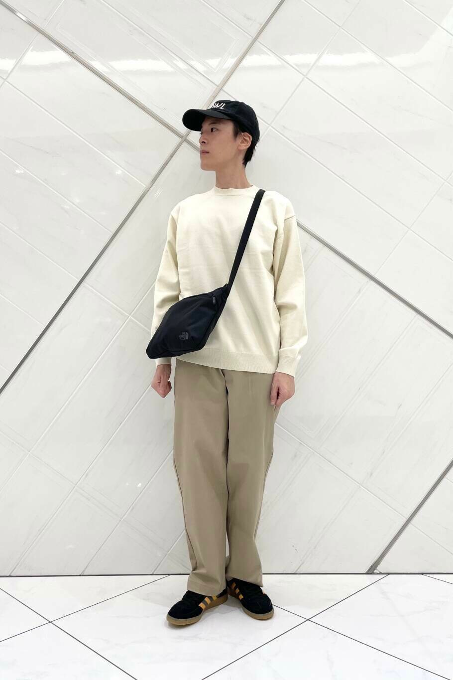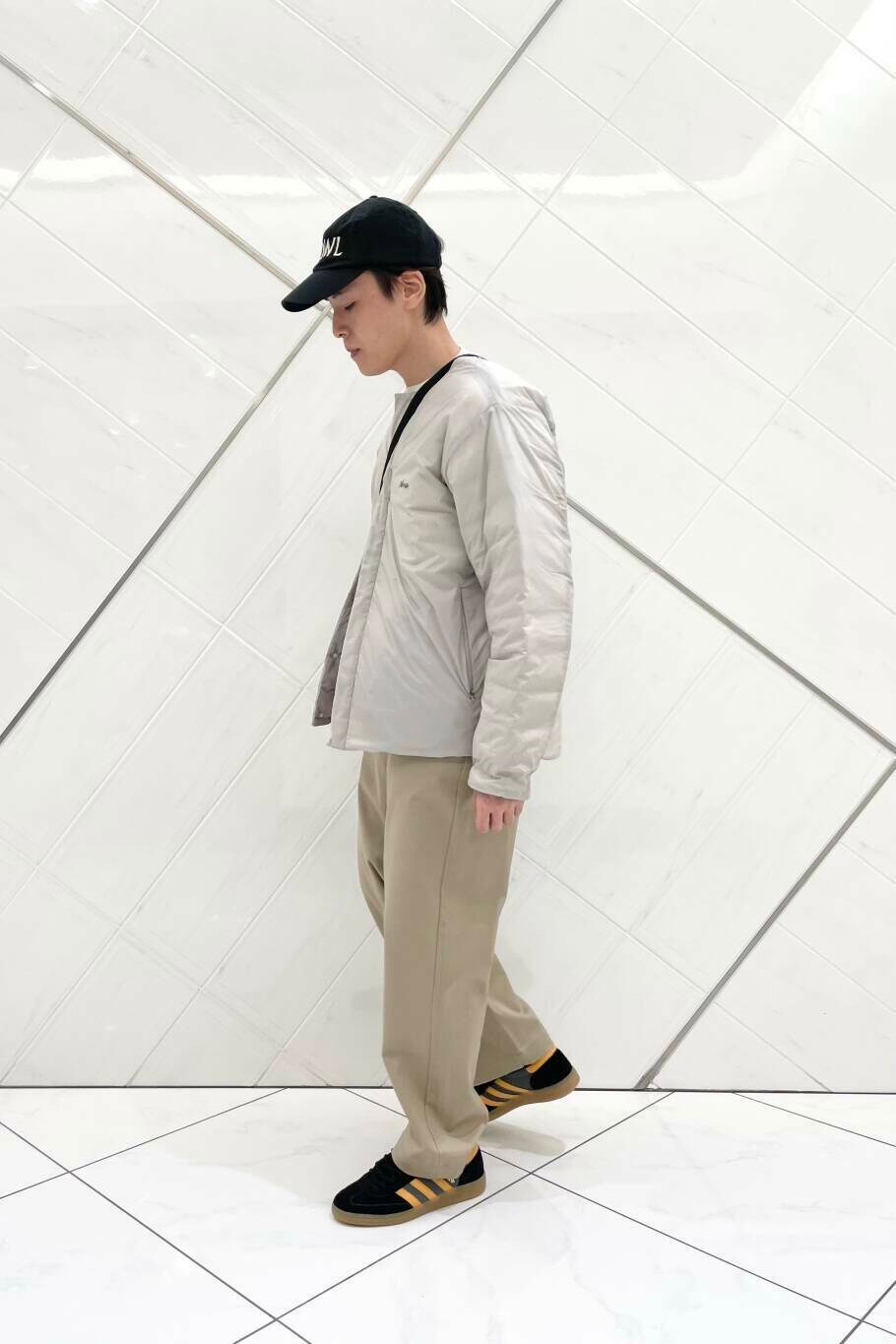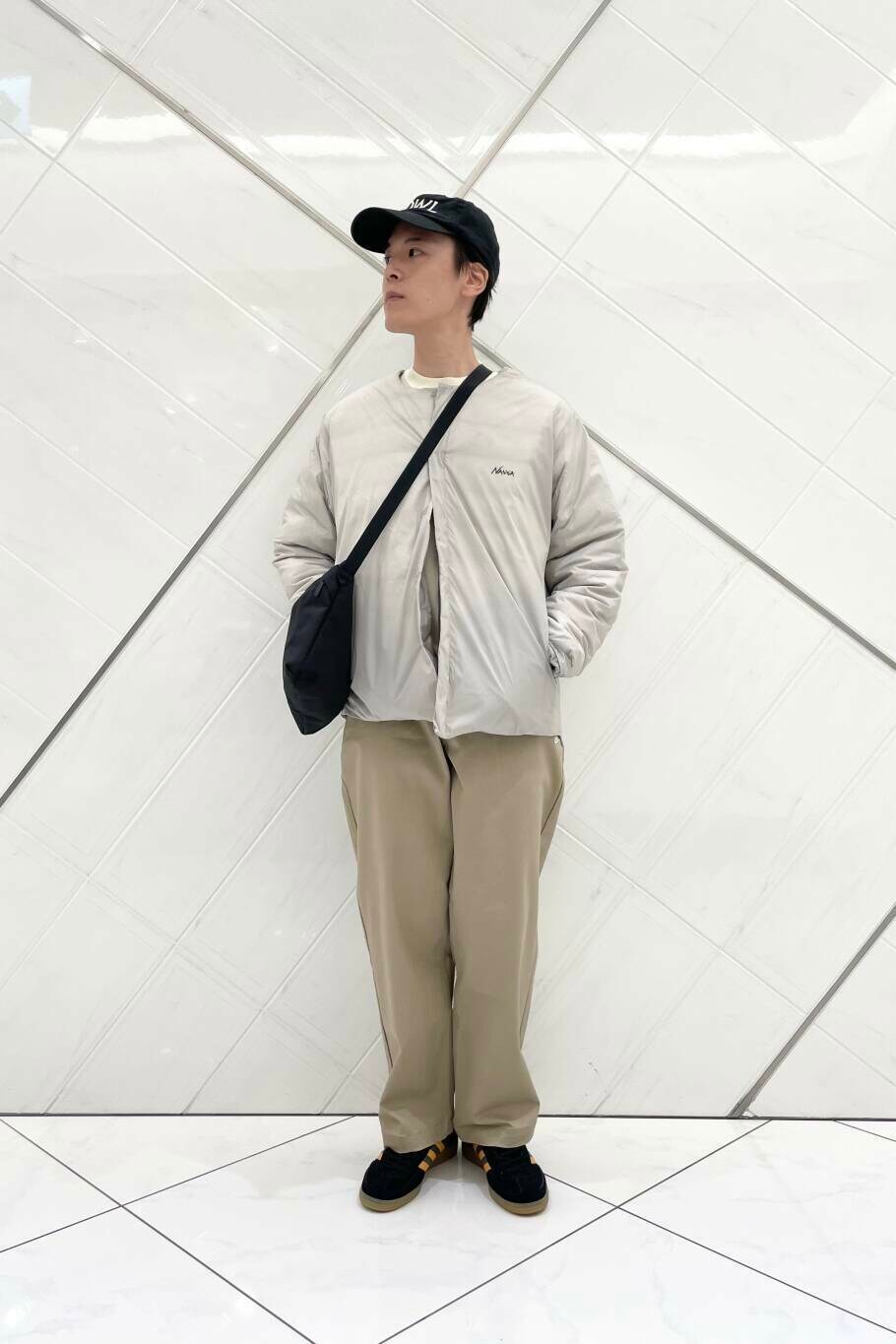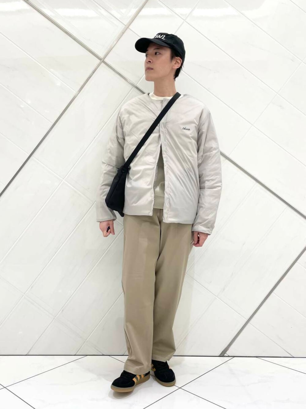 NANGA × DOORS のインナーダウンを着用した秋カラーコーデです。温かみのあるベージュからアイボリーのグラデーションを意識したスタイリングです。