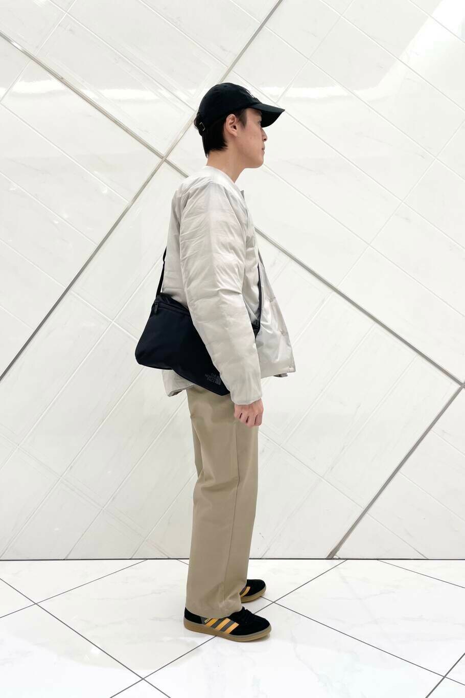 インナーダウンは、私の体型だとMサイズがジャストサイズですが、今回はLサイズを着用し、ゆったりめなスタイリングに仕上げました。