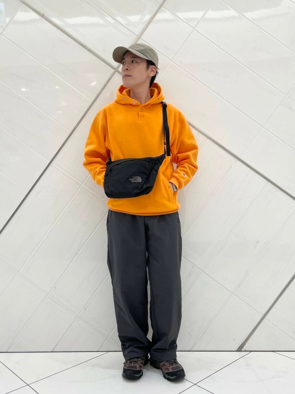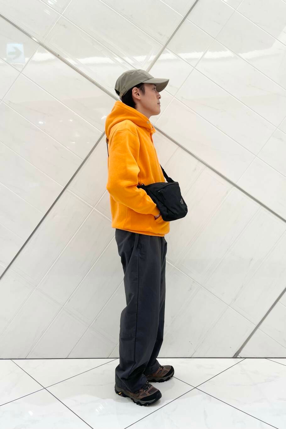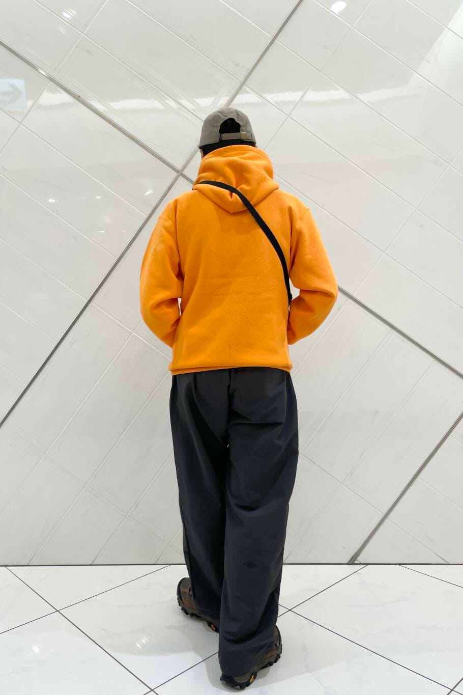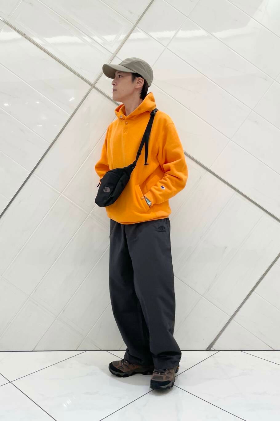 発色の良いオレンジのパーカーに対して合わせたのは、こちらも DOORS 別注となっている UMBRO のナイロンパンツです。定番のブラックから少し外してチャコールを選び、コントラストをやや抑え、落ち着きのある印象がプラスされているかと思います。