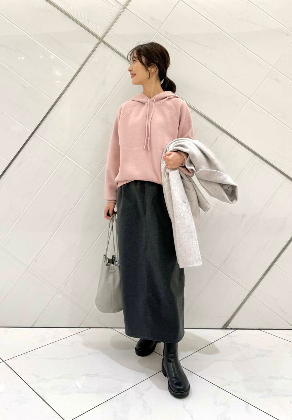 ニットは柔らかな肌触りで着心地もよく、シンプルなデザインなので着回しもしやすく、コンパクトなシルエットでボトムスとのバランスも取りやすいです。
