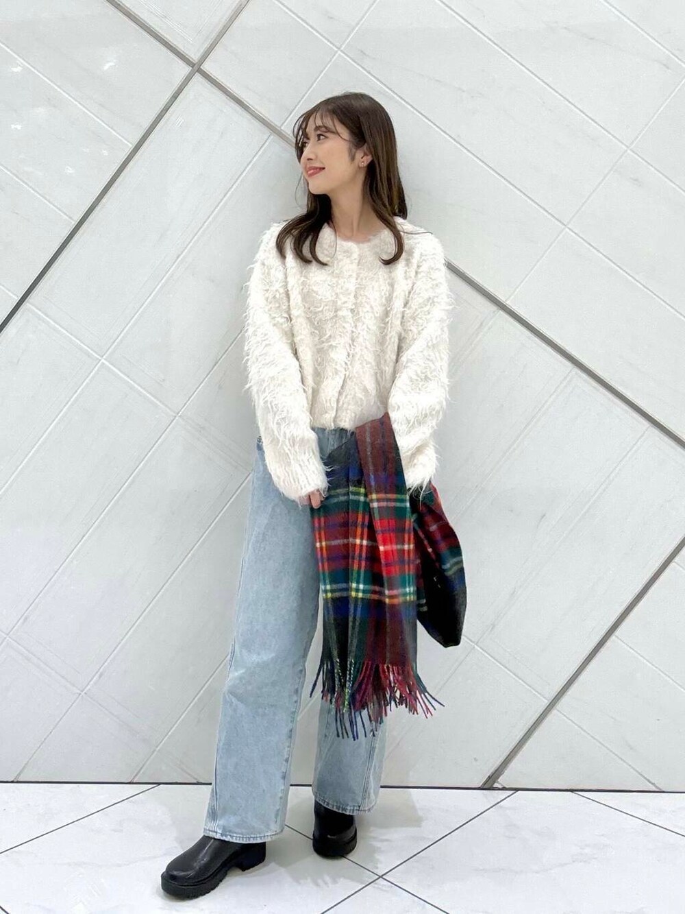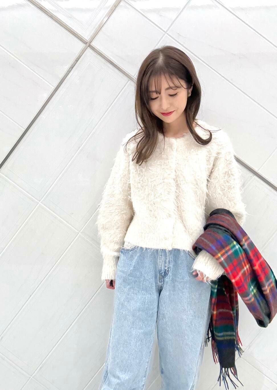 シンプルなコーディネートに映えるストールです。シーズンムードが高まるアイテムなのでおすすめです(^^)