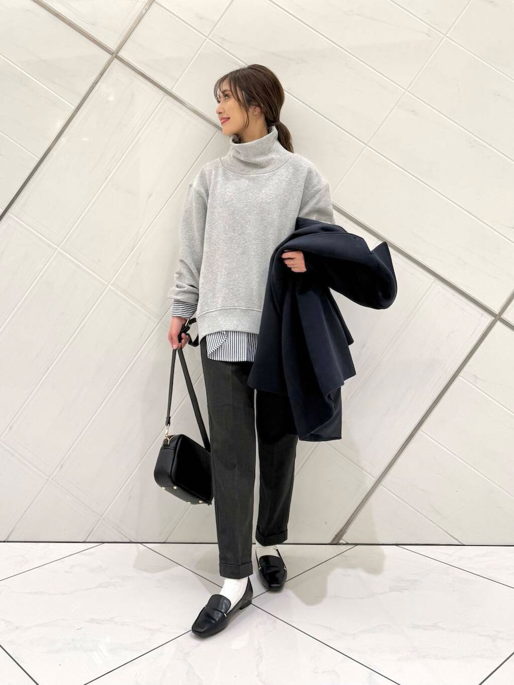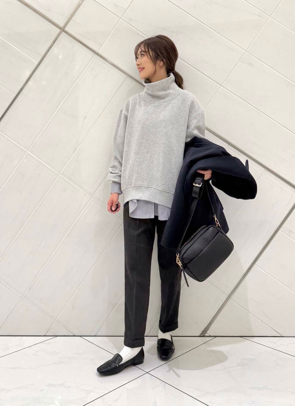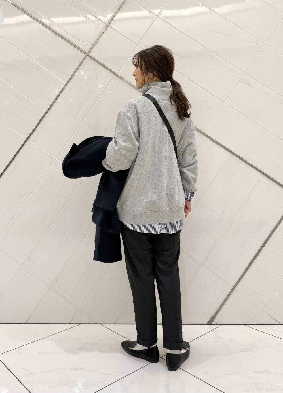 スウェットにシャツを重ねたレイヤードスタイルに細身のパンツをを合わせてメリハリを付けました。