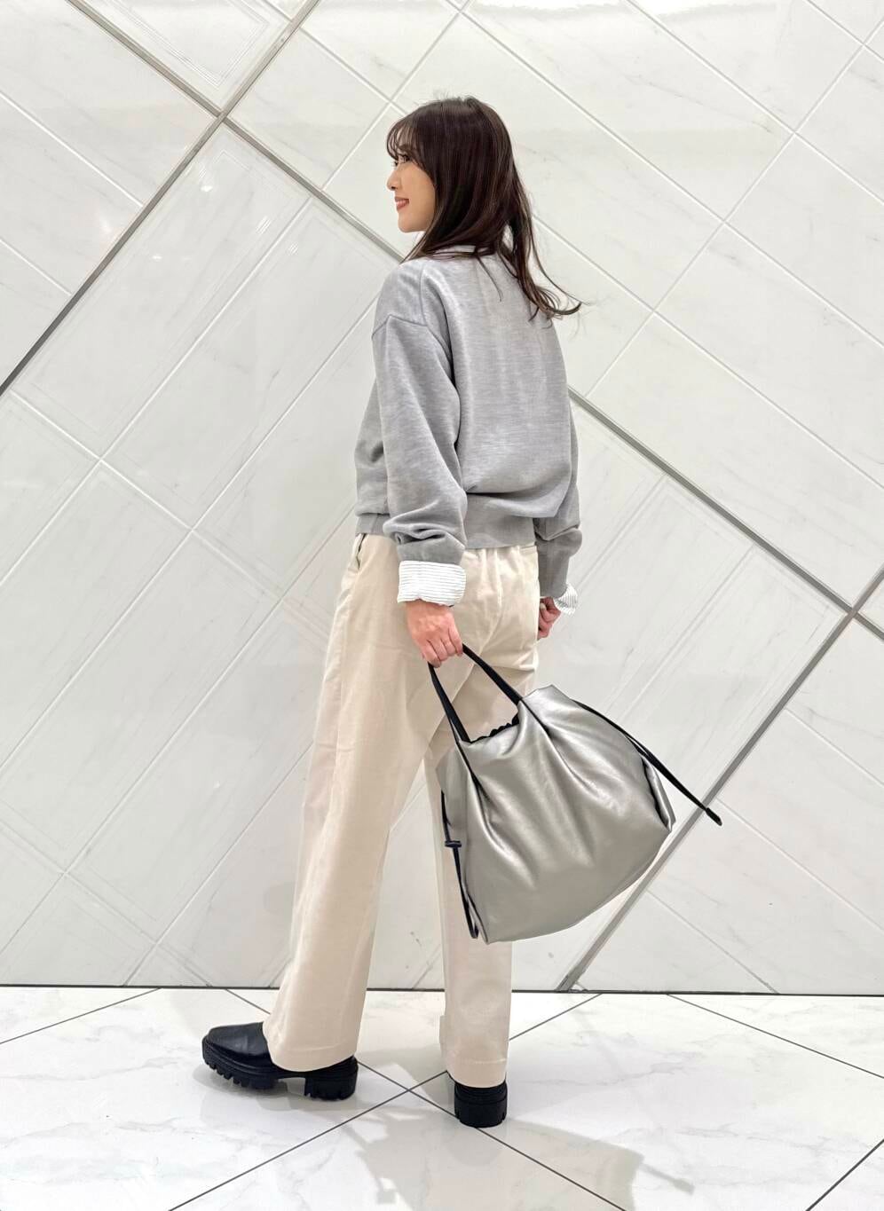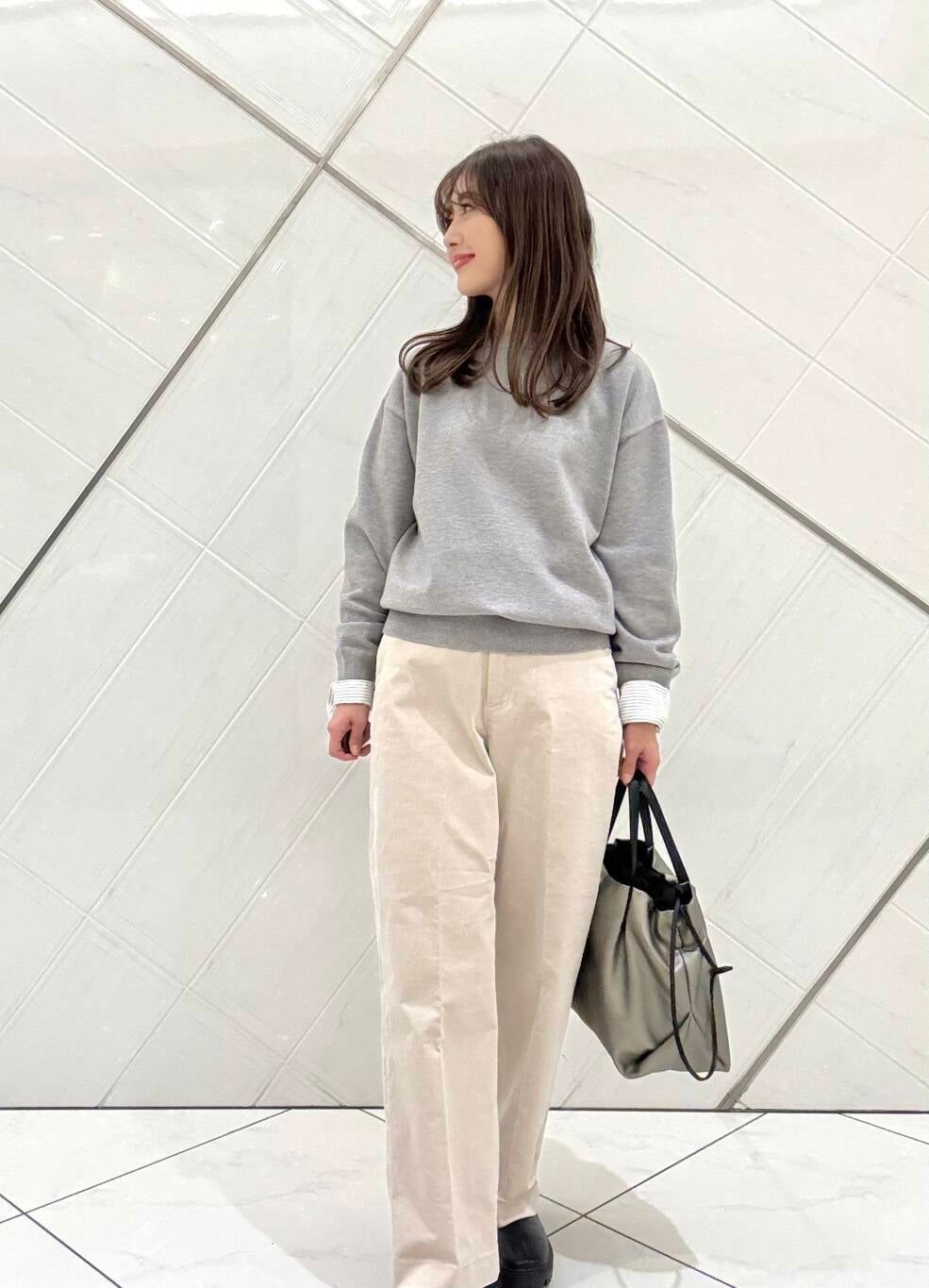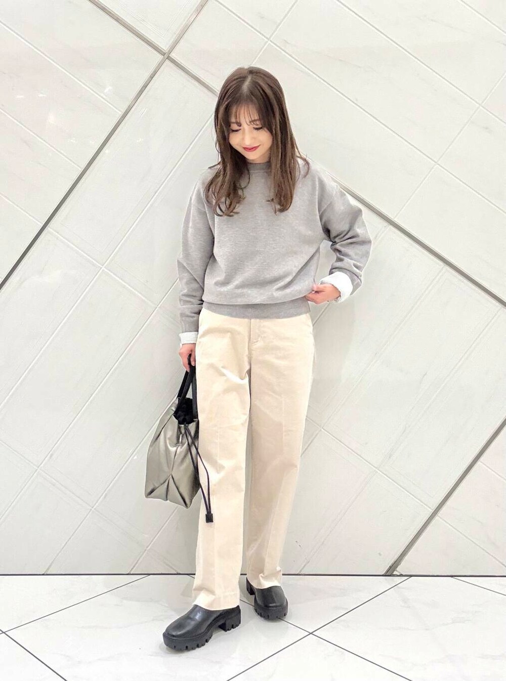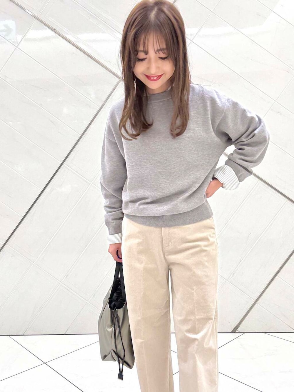 ニットは200日ニットシリーズの新色で明るめのグレーでアクセントにシャツをレイヤードしてみました(^^)