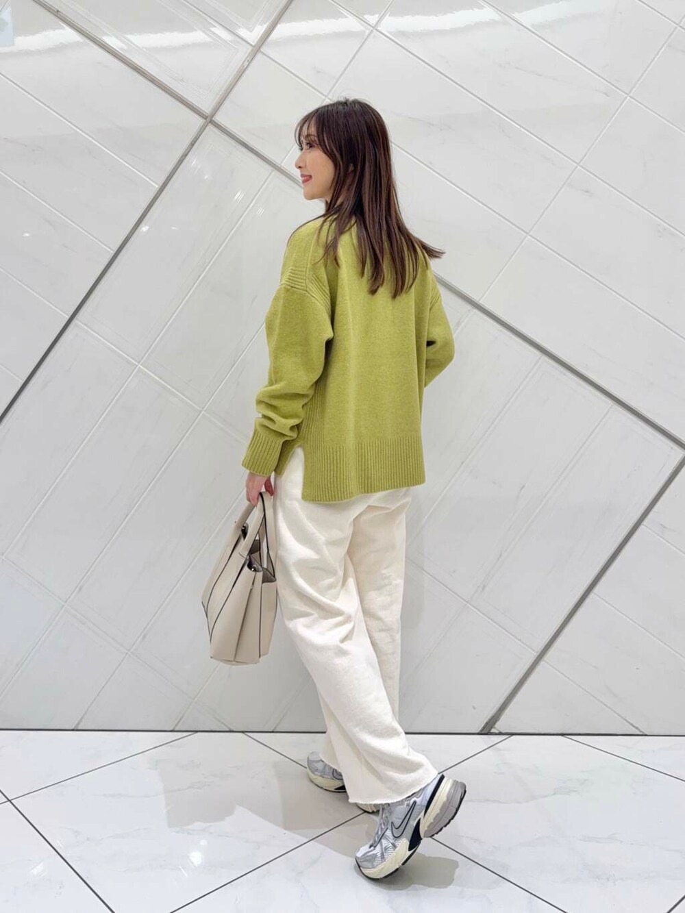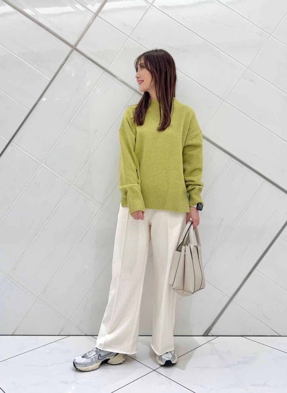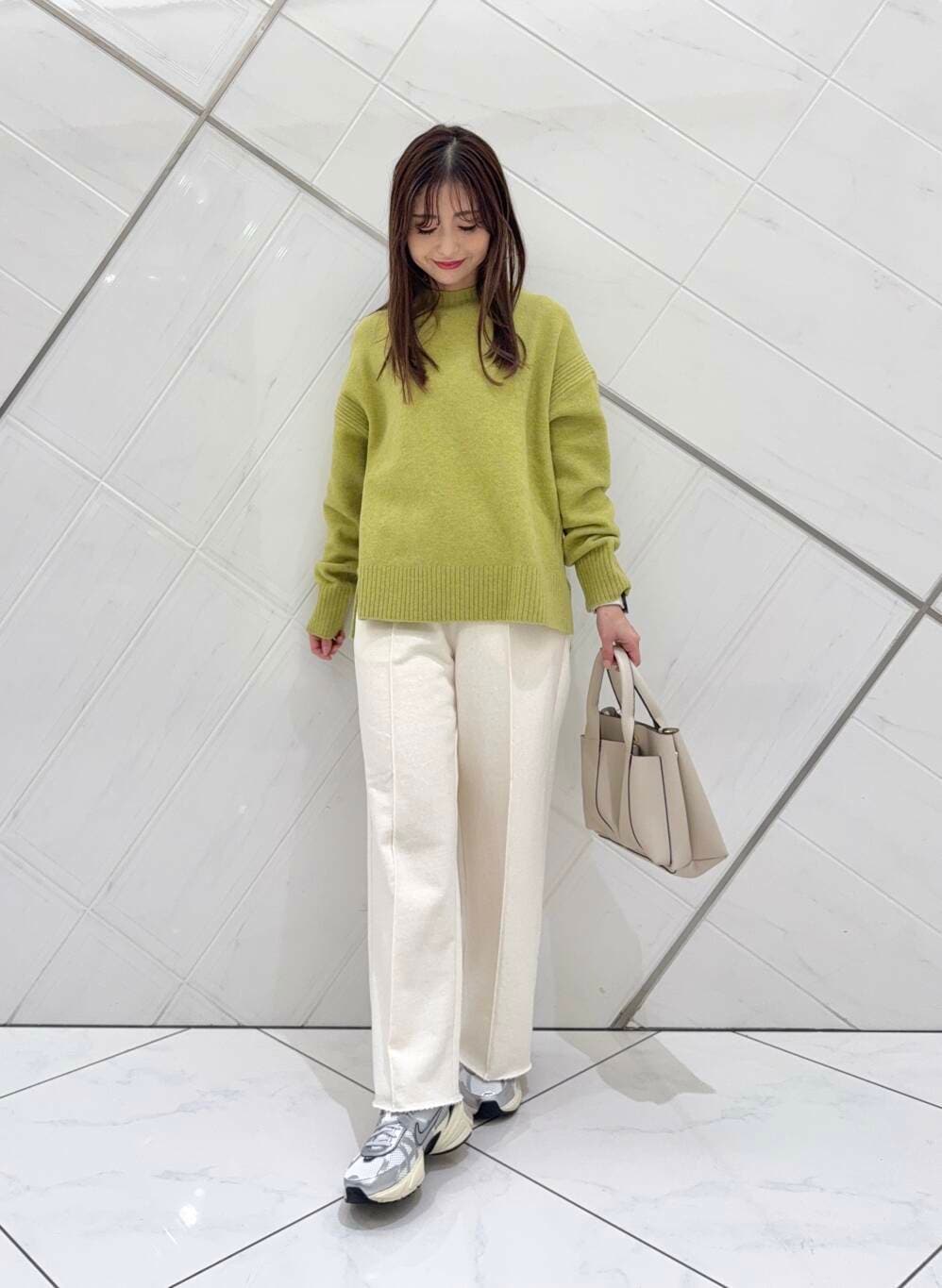 ニットは柔らかな肌触りで着心地もよく、着映えするピスタチオカラーでコーディネートのアクセントになります。