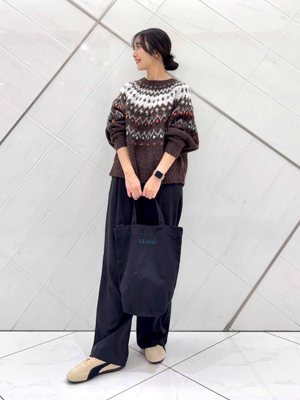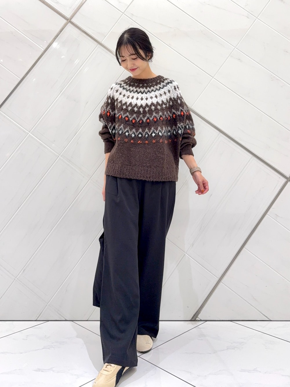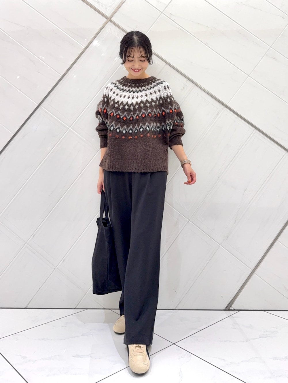 ニットはEKALのアイテムで、チクチク感がなく、柔らかな肌触りでコーディネートのアクセントになり可愛いのでおすすめです!