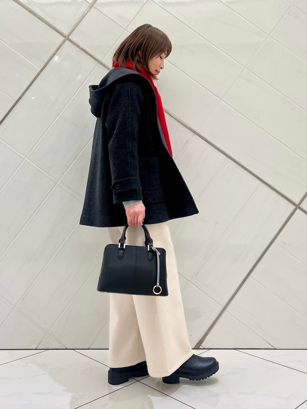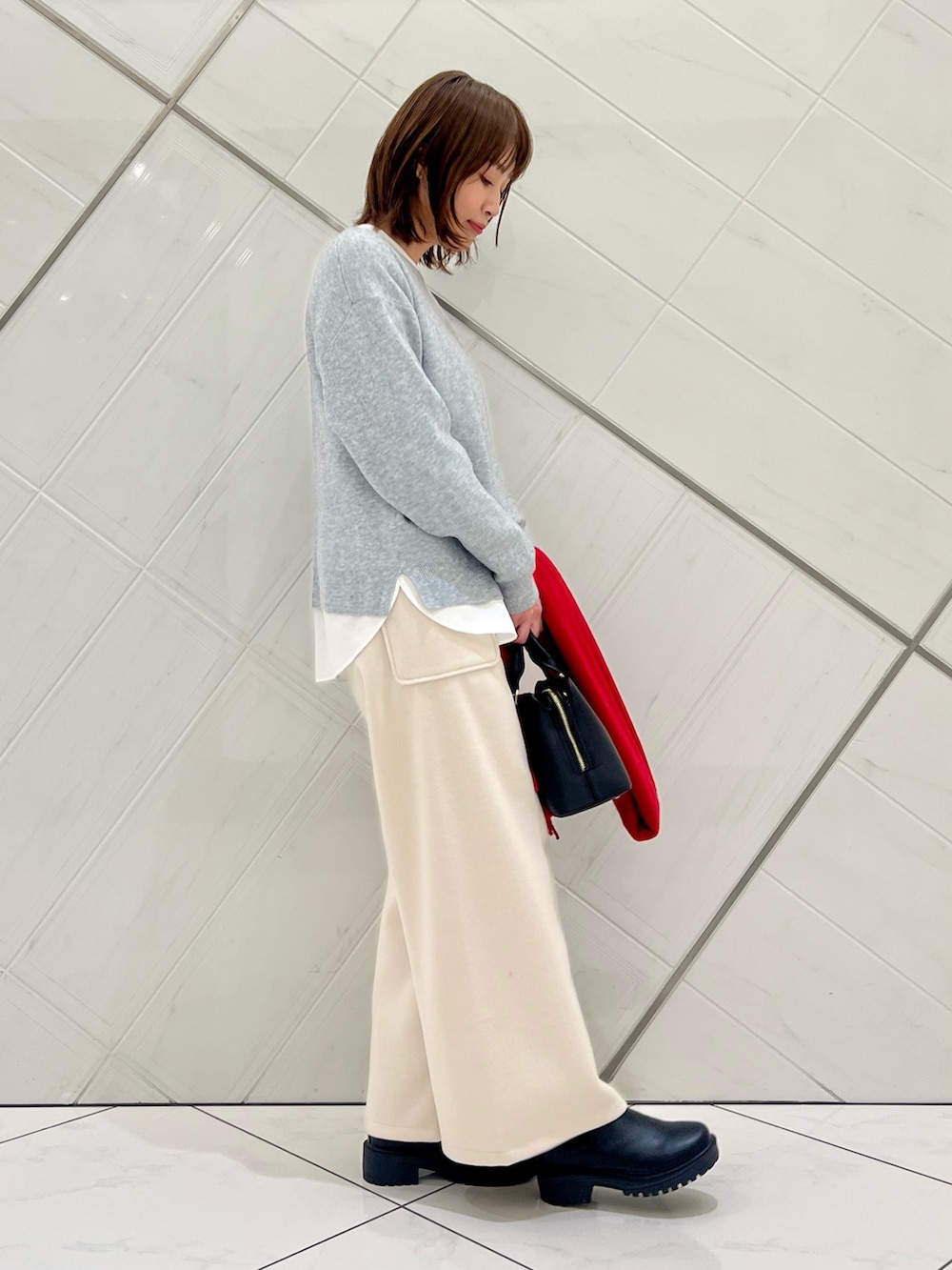 暖かい素材のパンツはワイドながら綺麗見え