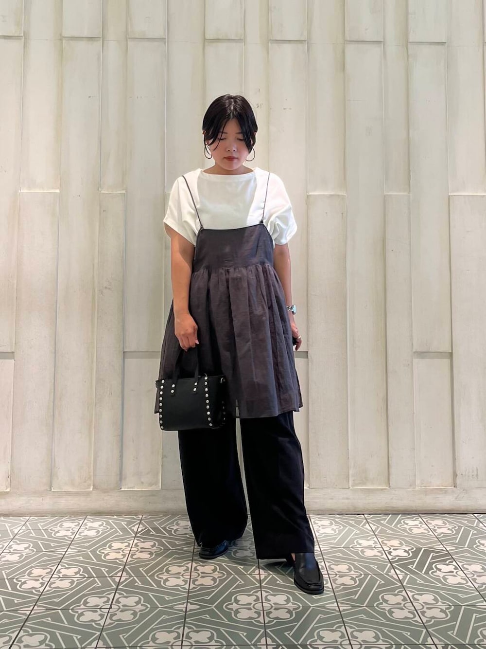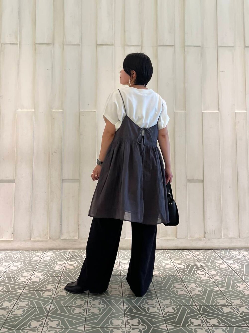 キャミは、前後どちらも着れるデザインで、長さも調節できるのでトップスに合わせては変えられます◎