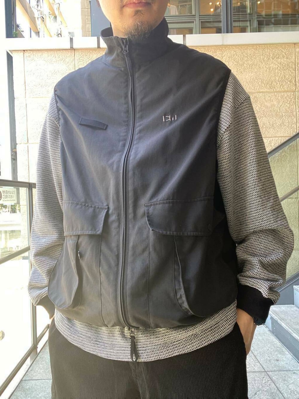 フィッシングベストをベースにスタンド衿型にアレンジして後ろ身頃に大容量のゲームポケットを採用。
